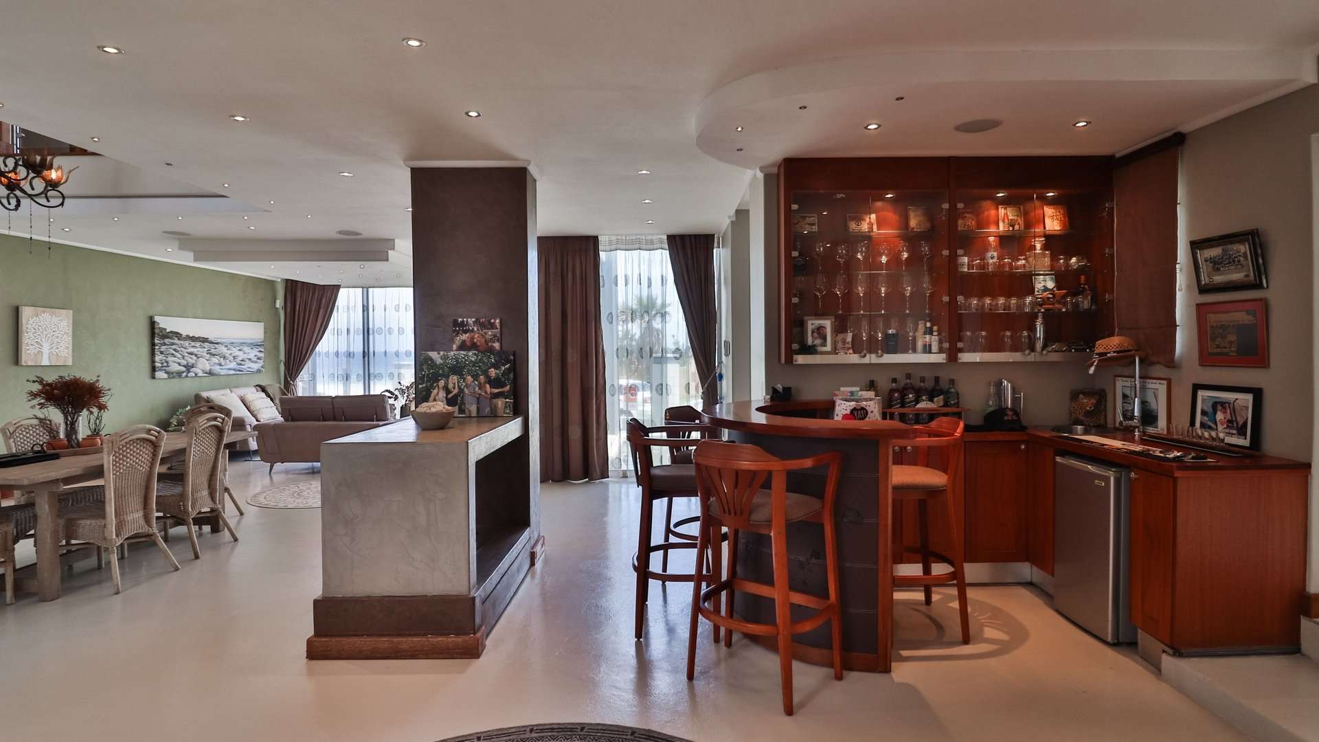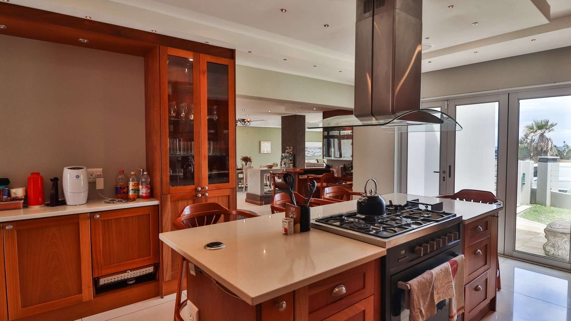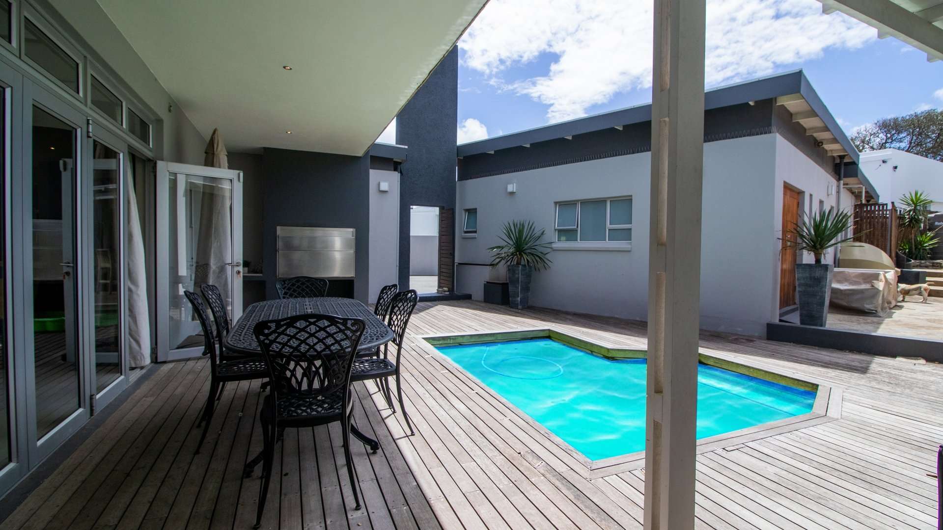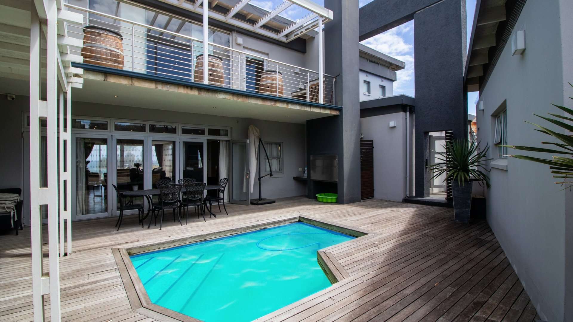 The house offers a sea view from most of the living areas and from four of the bedrooms in the house, this creates the impression that you are living literally on the beach. The private swimming pool area with build in braai and private bar area is ideal for enjoying some private entertaining times with family and friends.