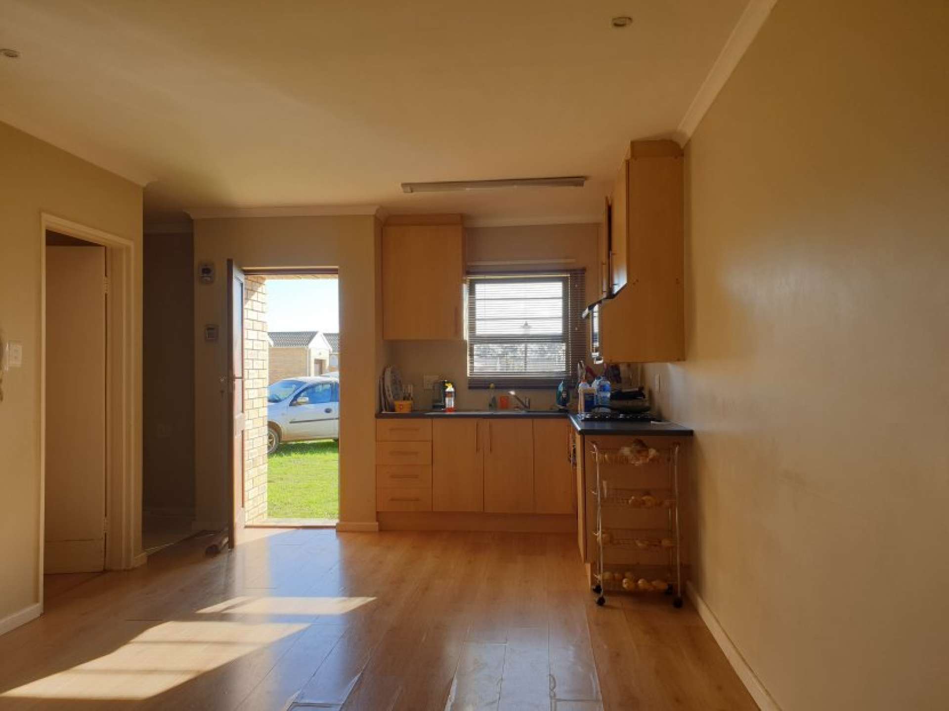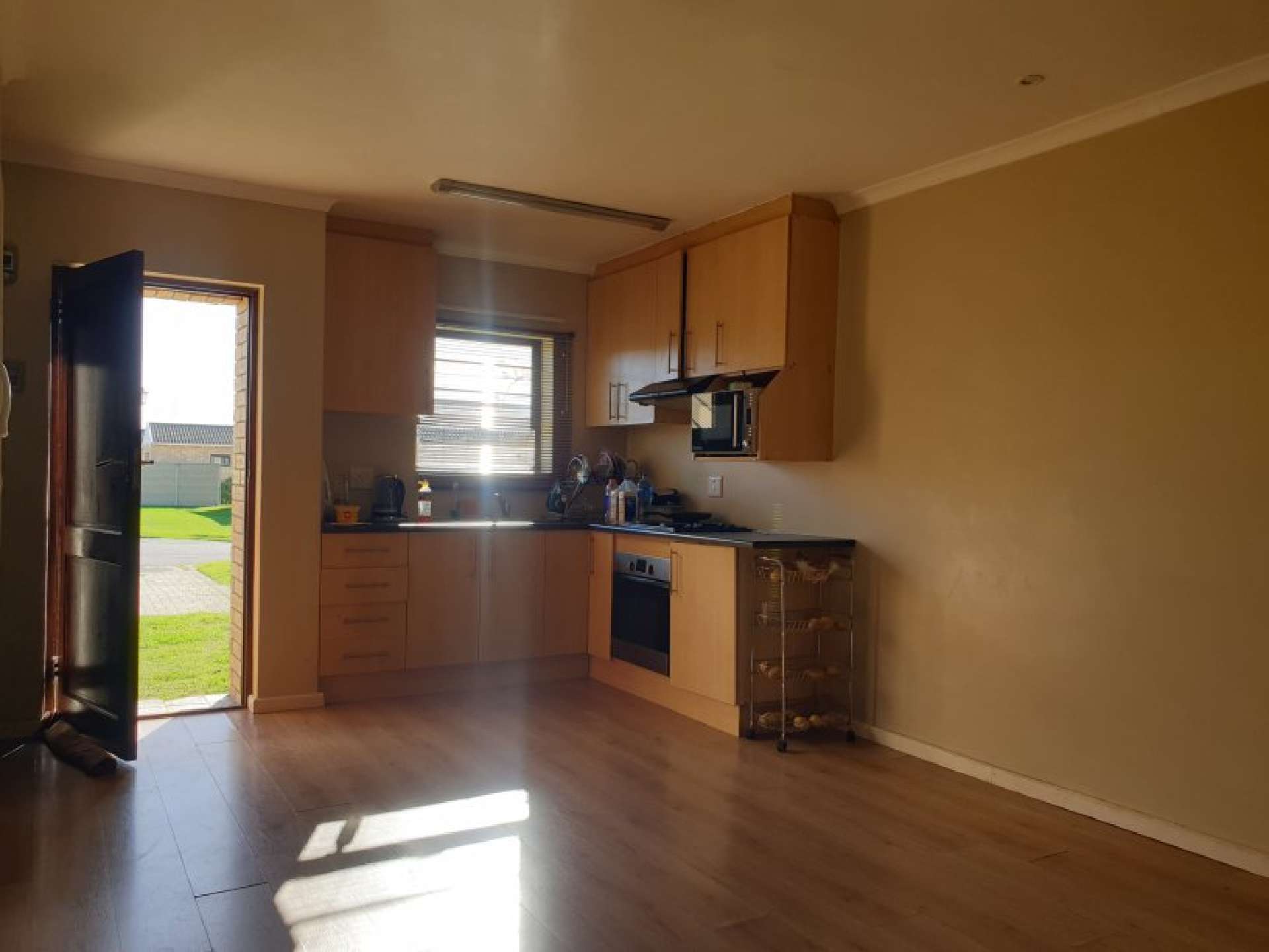 Modern kitchen with built-in cabinets and stylish laminated wooden flooring.