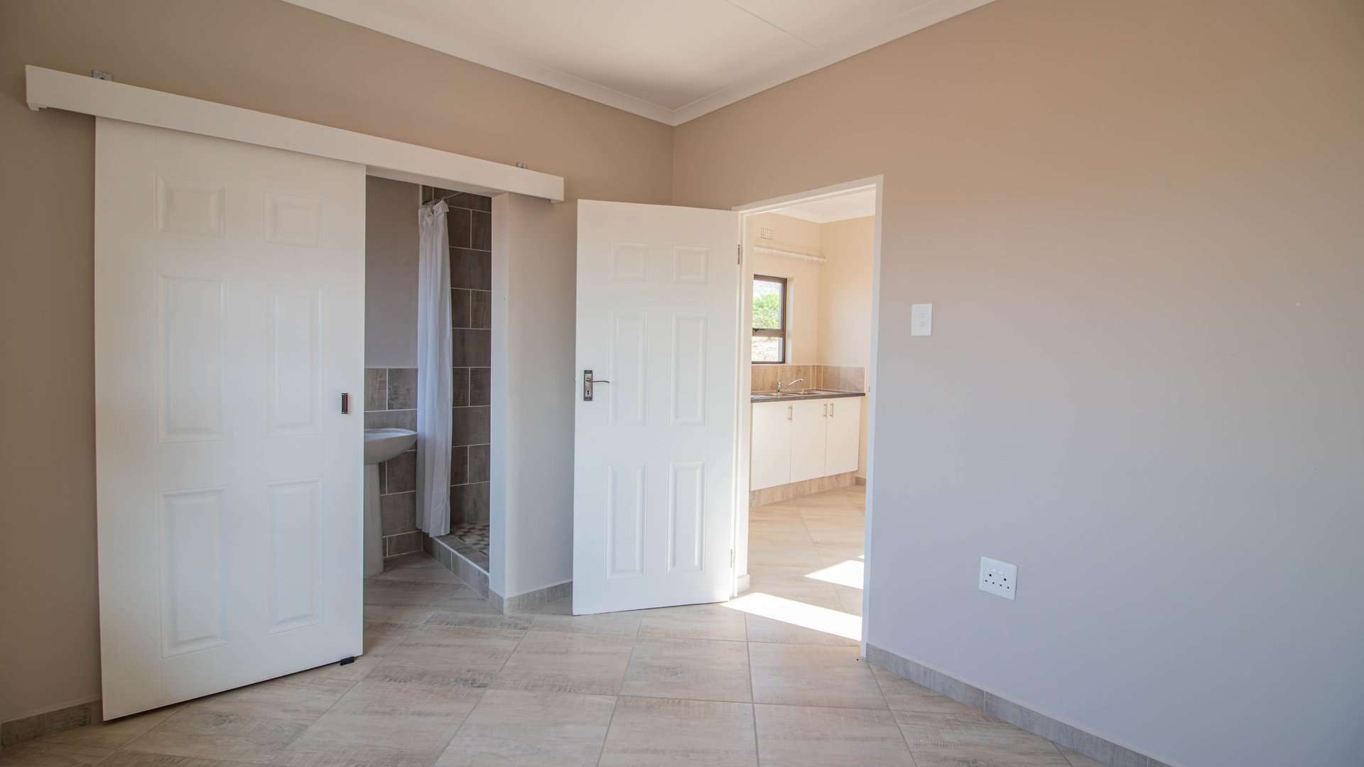 Experience contemporary living in this newly built home, ideally located within a secure and enclosed neighborhood. The main residence offers three bright bedrooms with sleek tiled floors, a modern bathroom, and an inviting open-plan living area. The kitchen features elegant countertops, a tiled backsplash, and plenty of natural light — with the flexibility to add your own cupboards or finishing touches.