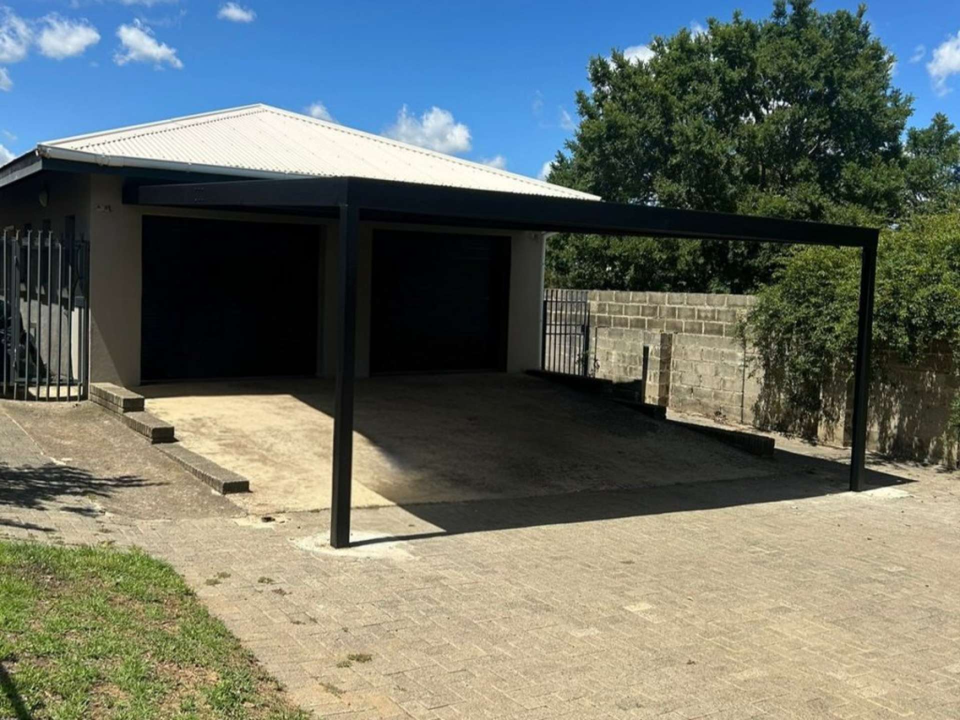 The main bedroom boasts a walk-in closet, while the modern kitchen is fitted with a gas stove for convenience. Practical extras include a JoJo tank, an alarm system, and an electric gate with double automated garage doors for added security and ease.