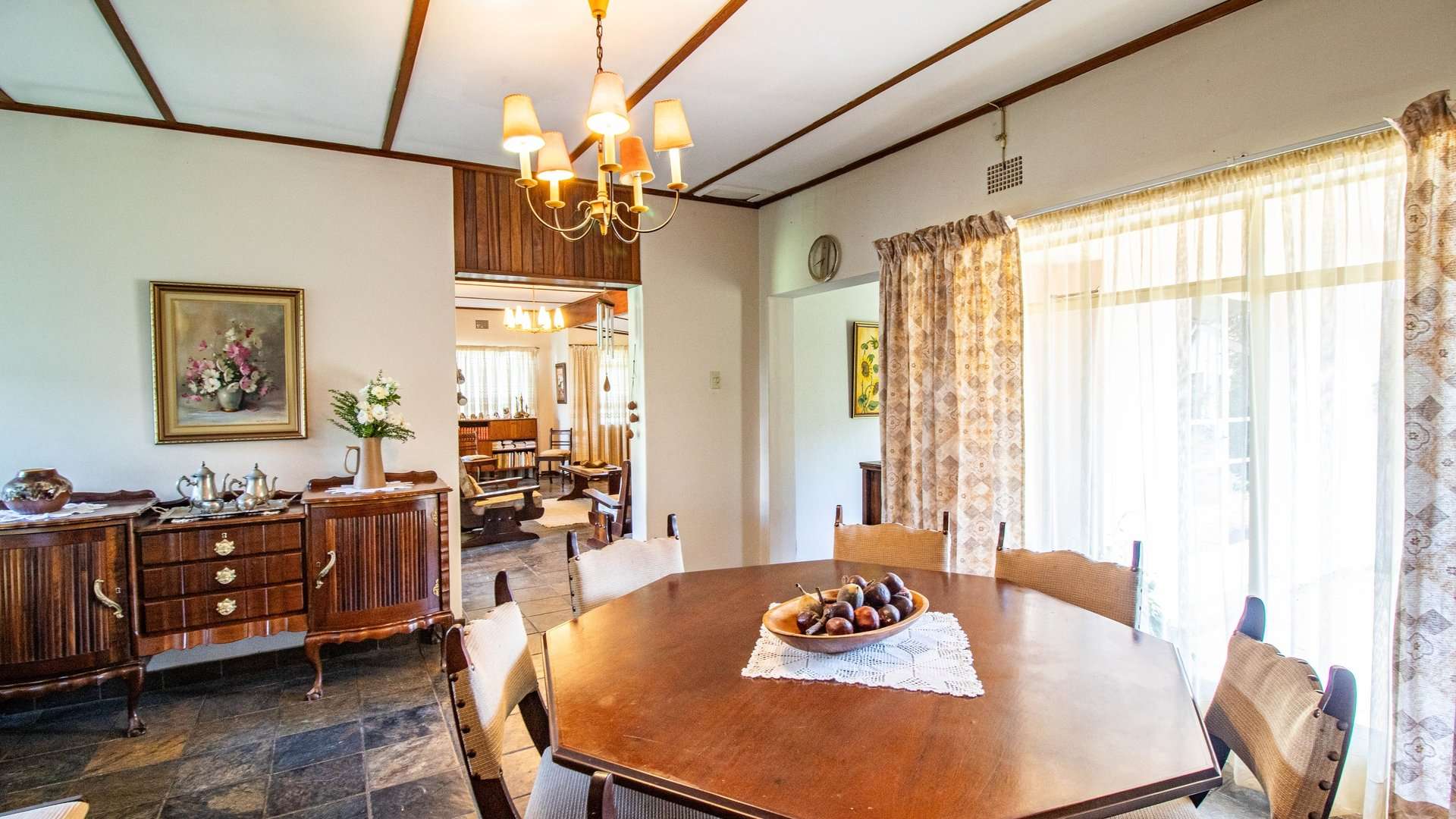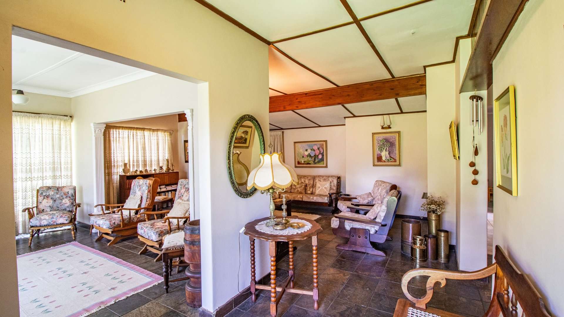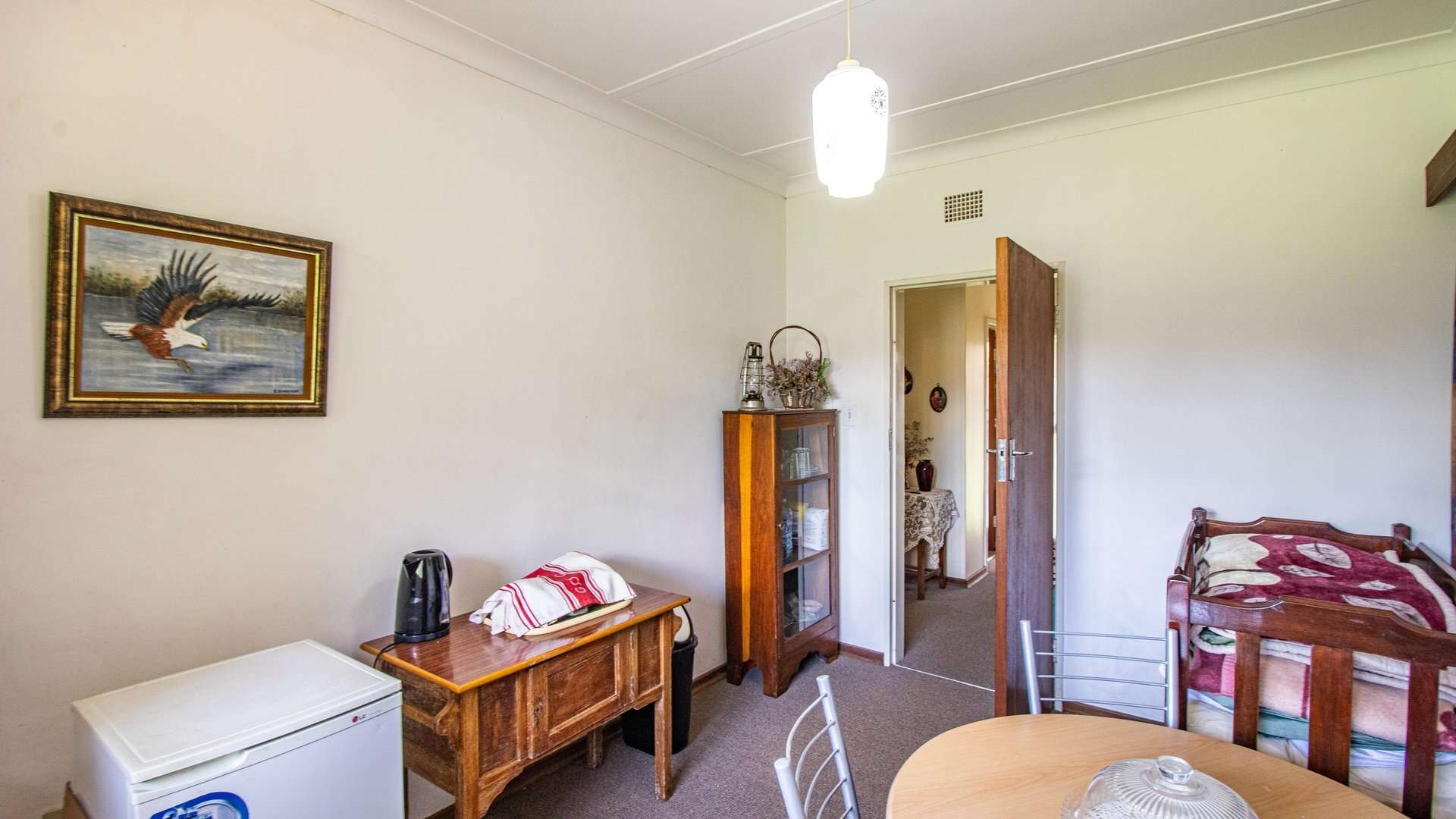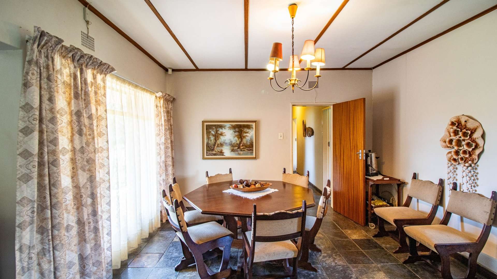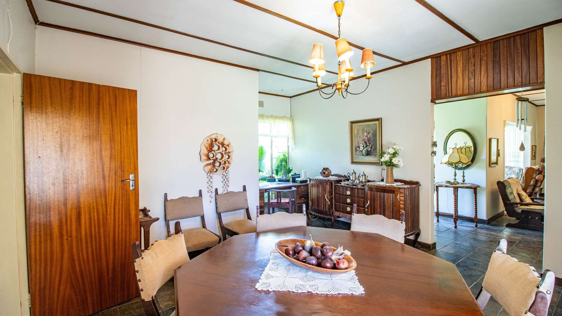 The dining room, two lounge areas, TV room, entrance hall, kitchen, and passage are finished with durable Lydite tiles, while the bedrooms are comfortably carpeted.
