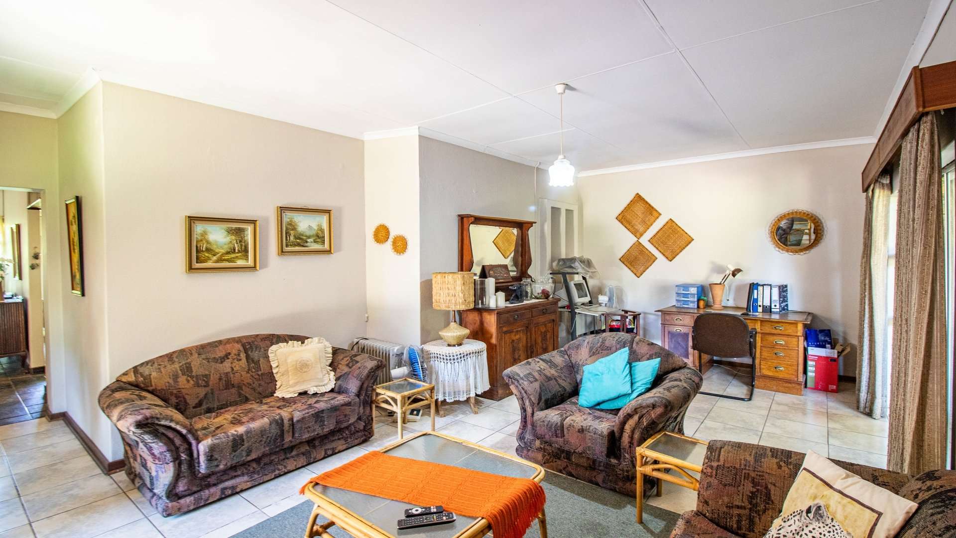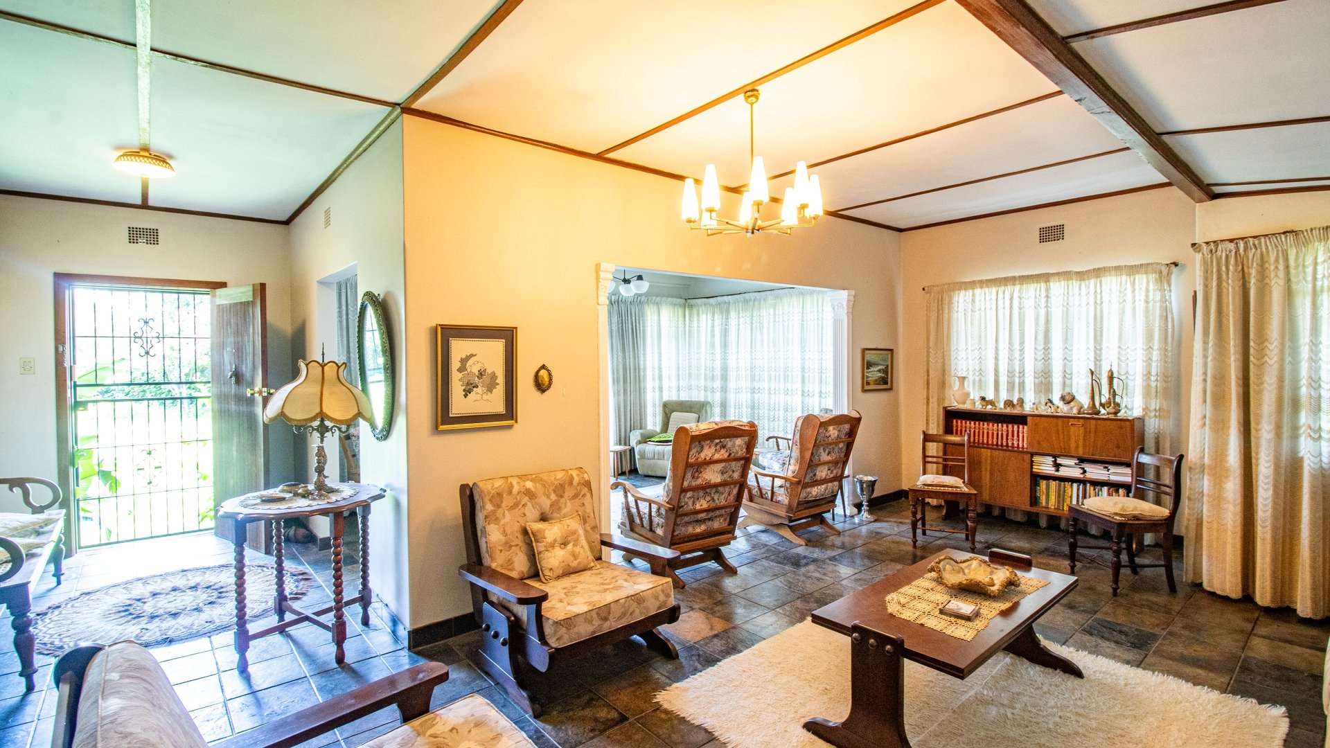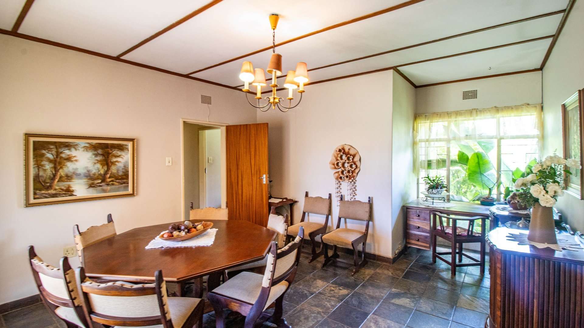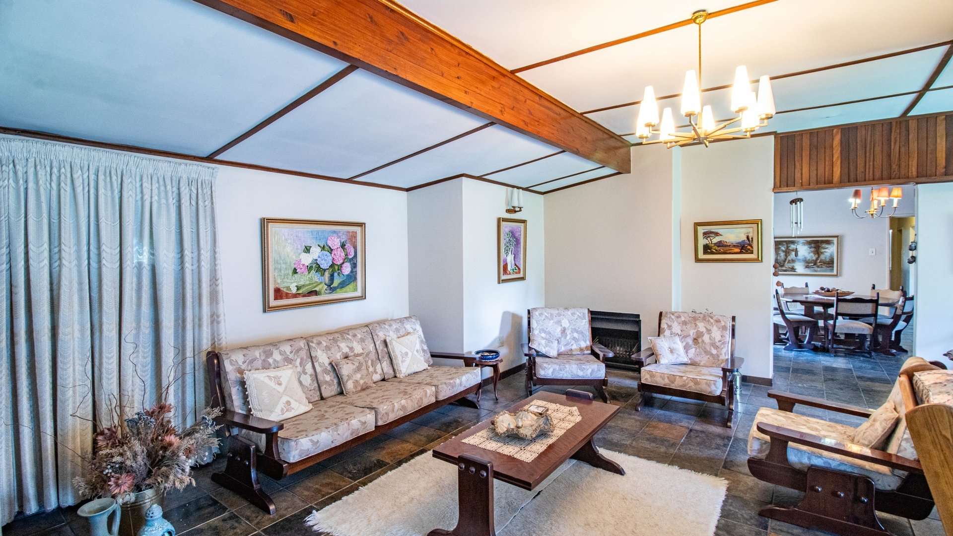 The dining room, two lounge areas, TV room, entrance hall, kitchen, and passage are finished with durable Lydite tiles, while the bedrooms are comfortably carpeted.