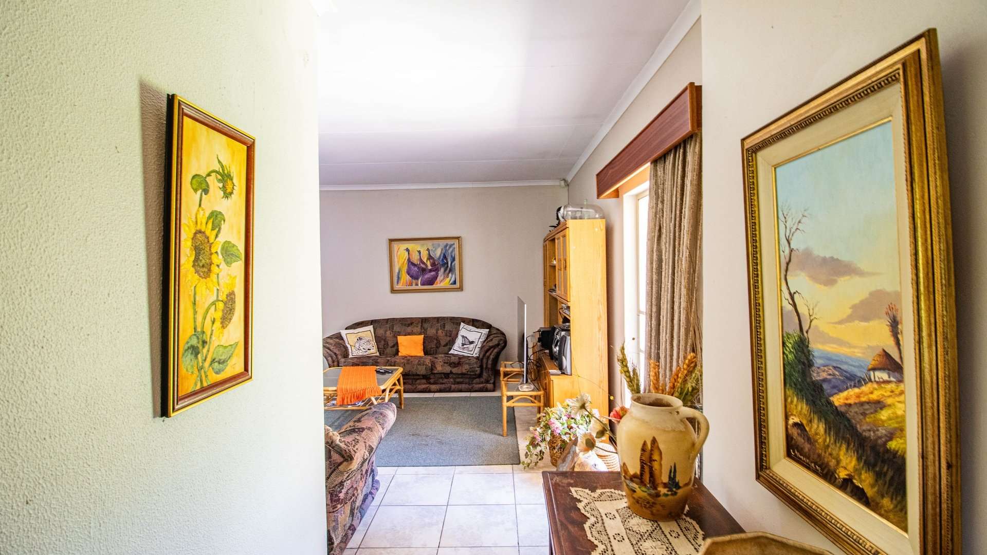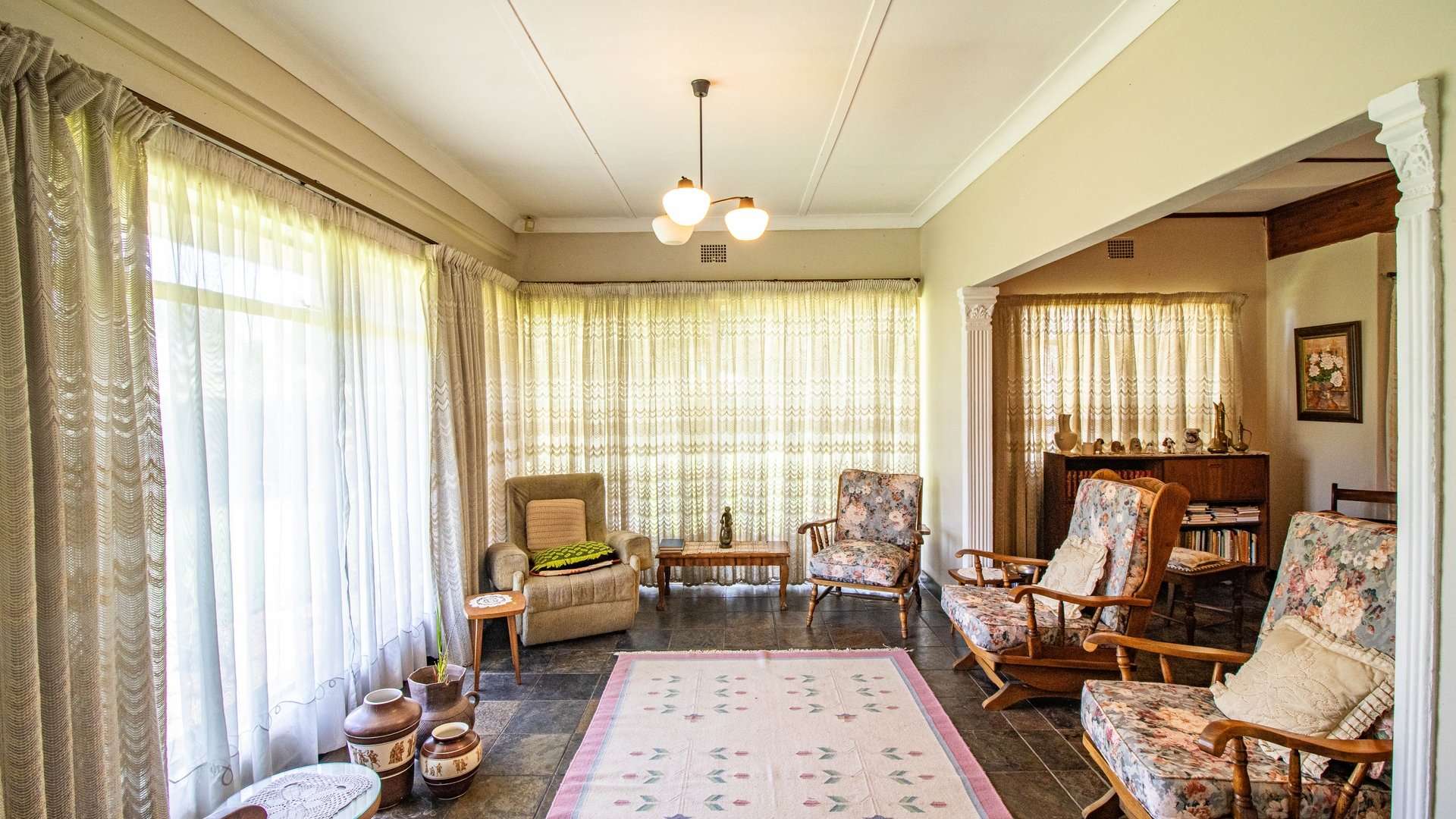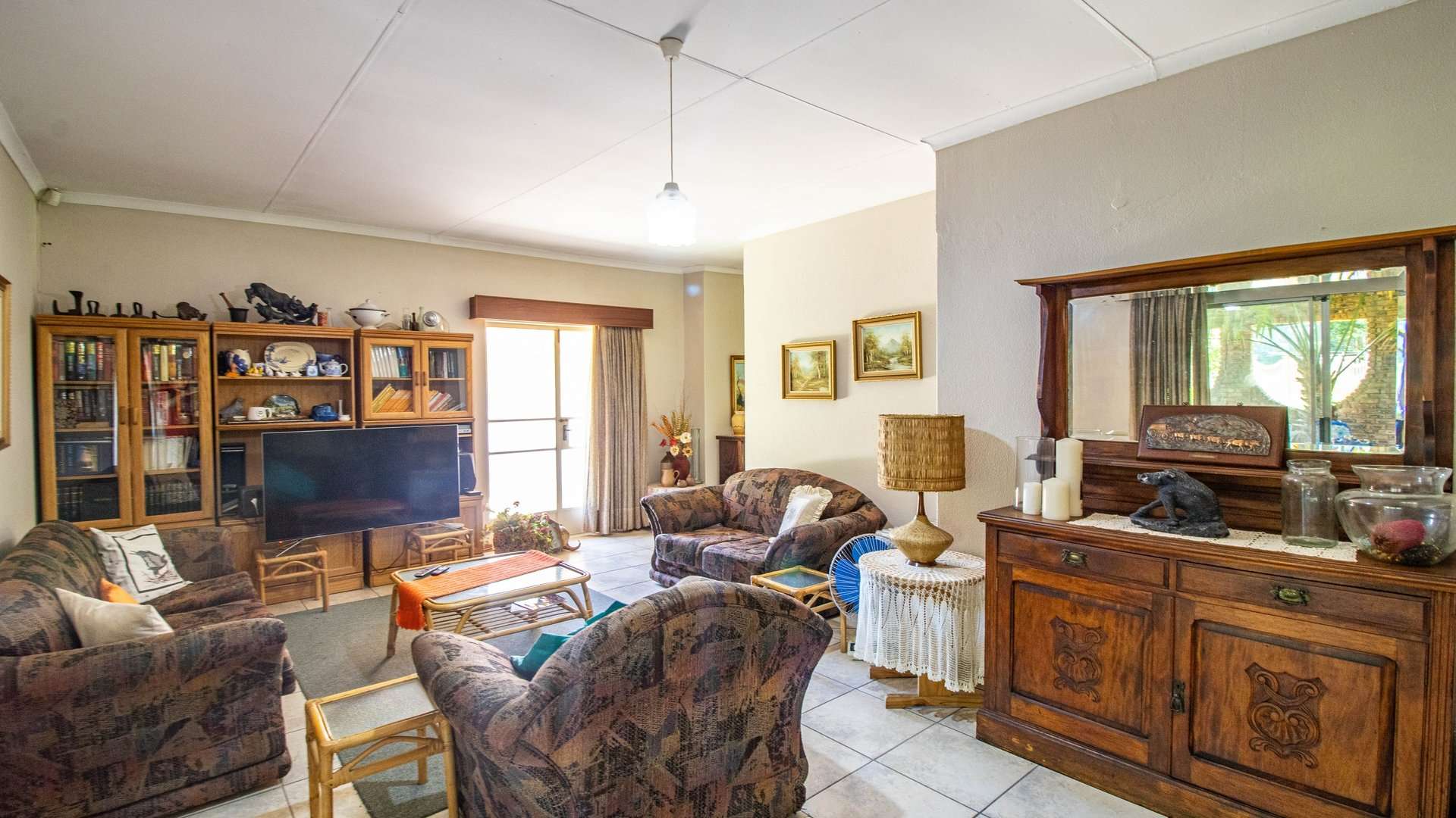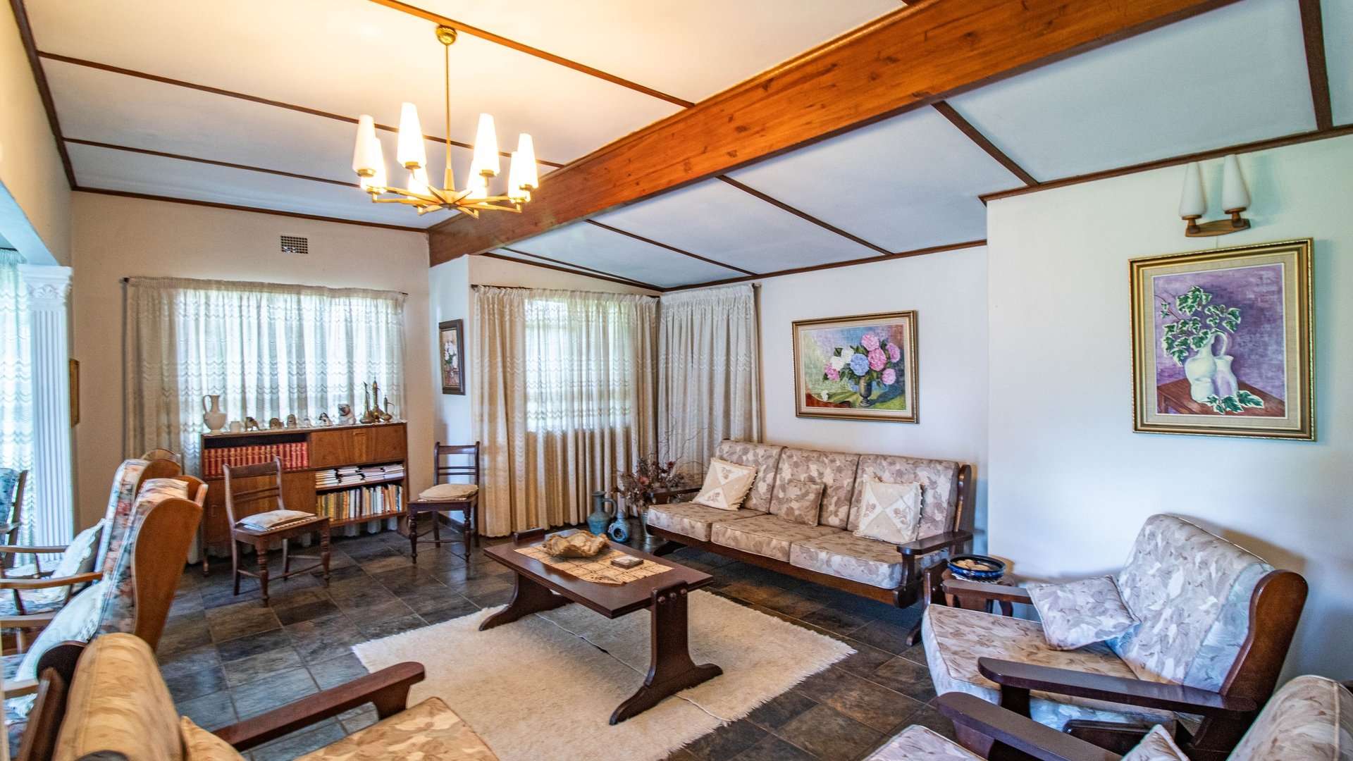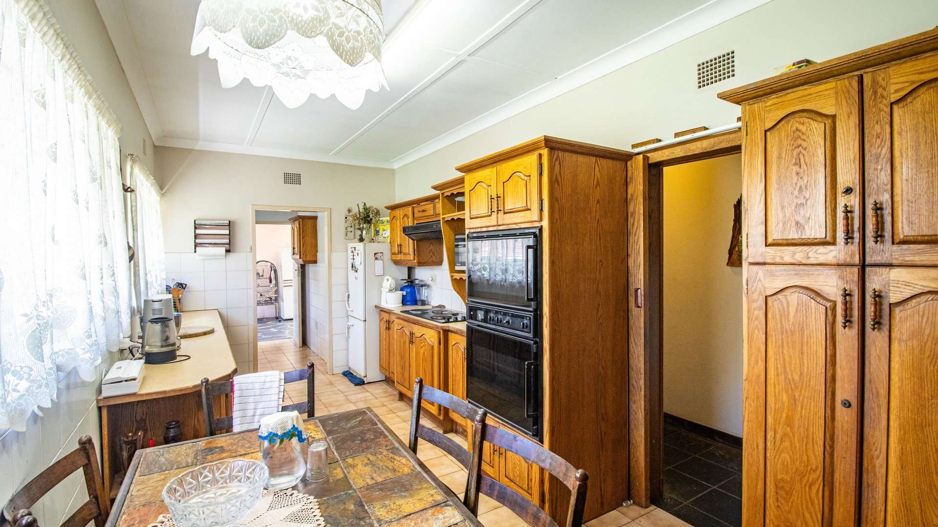 The dining room, two lounge areas, TV room, entrance hall, kitchen, and passage are finished with durable Lydite tiles, while the bedrooms are comfortably carpeted.