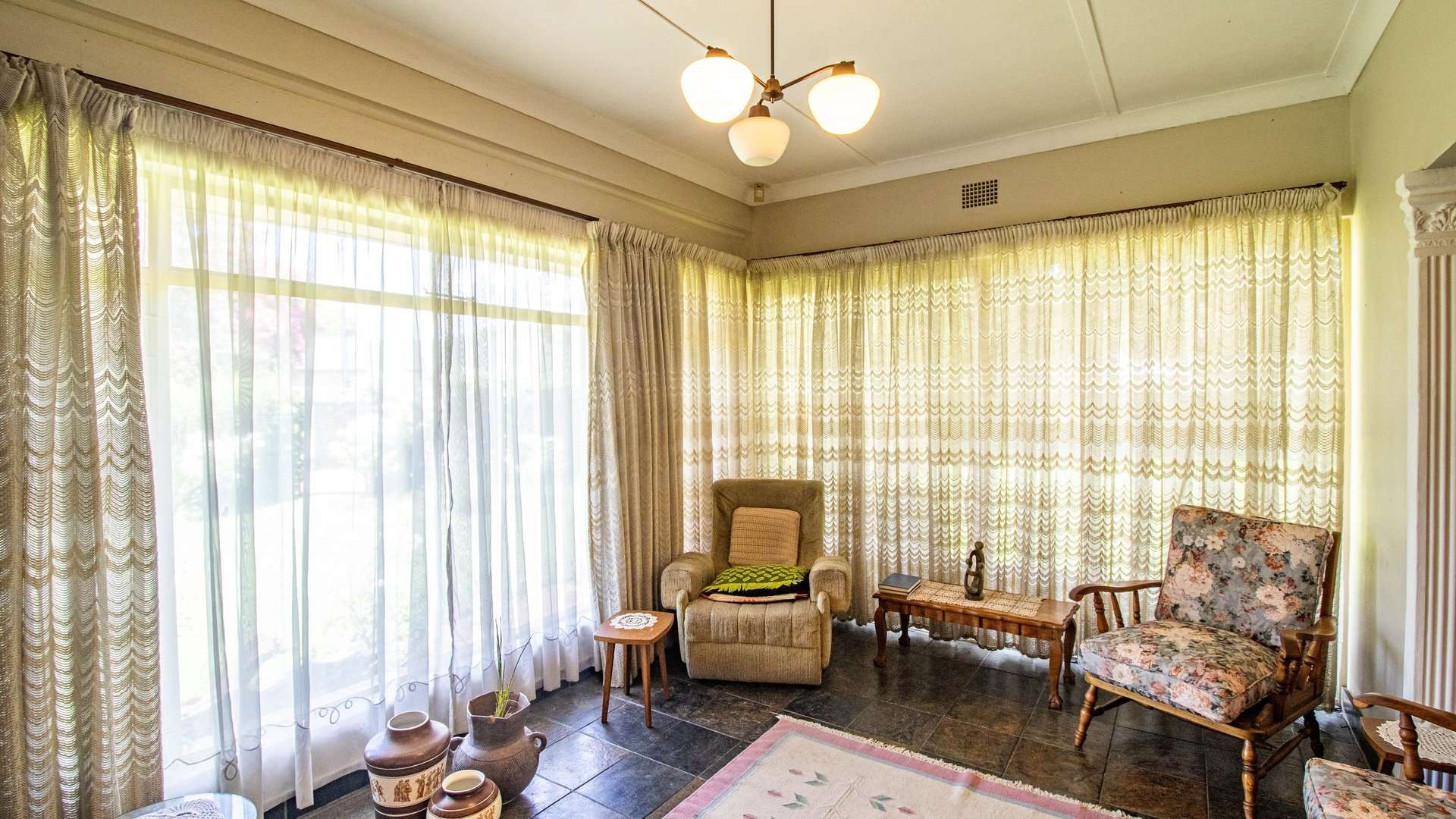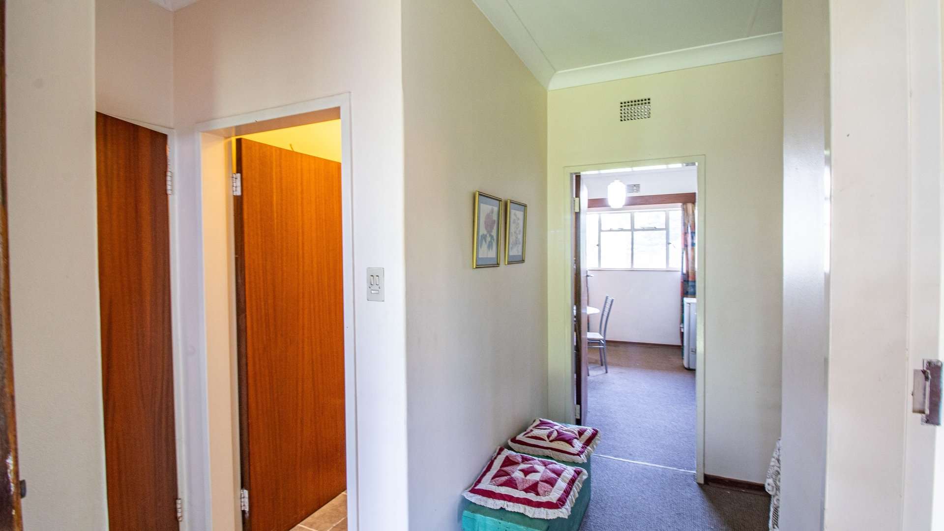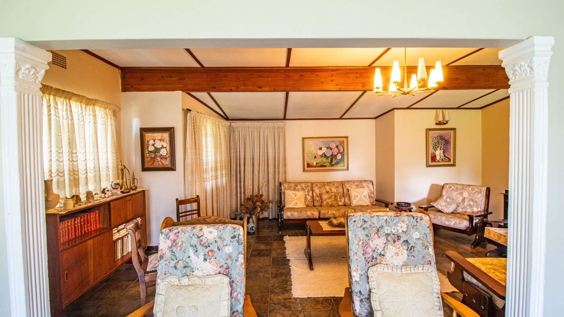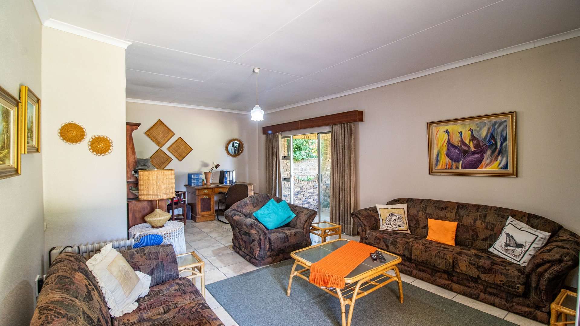 The dining room, two lounge areas, TV room, entrance hall, kitchen, and passage are finished with durable Lydite tiles, while the bedrooms are comfortably carpeted.