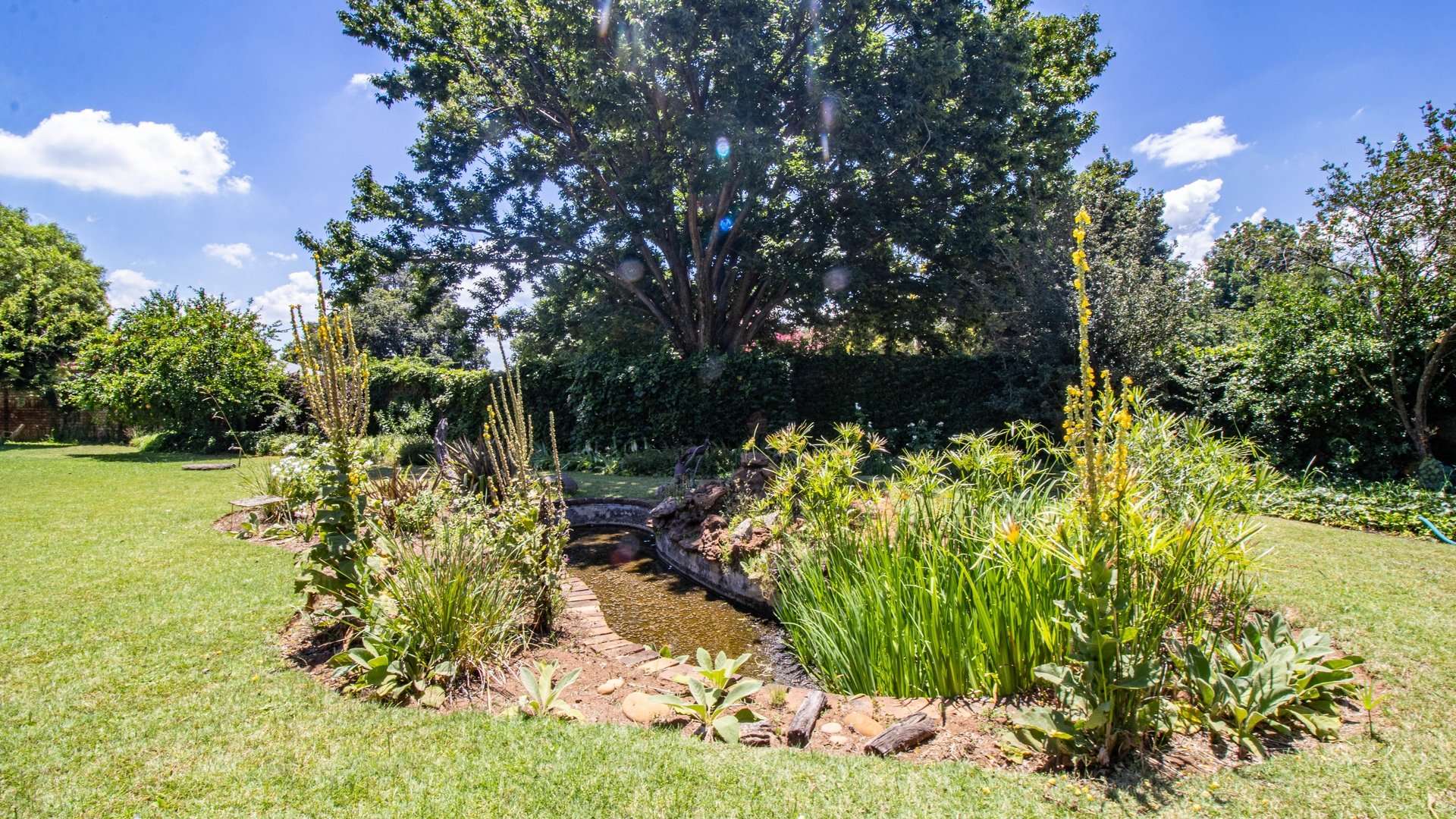 Surrounded by a high perimeter wall, the expansive garden is safe for children and ideal for outdoor living, featuring an established fishpond, herbal garden, and an abundance of fruit trees, including a mature chestnut tree.