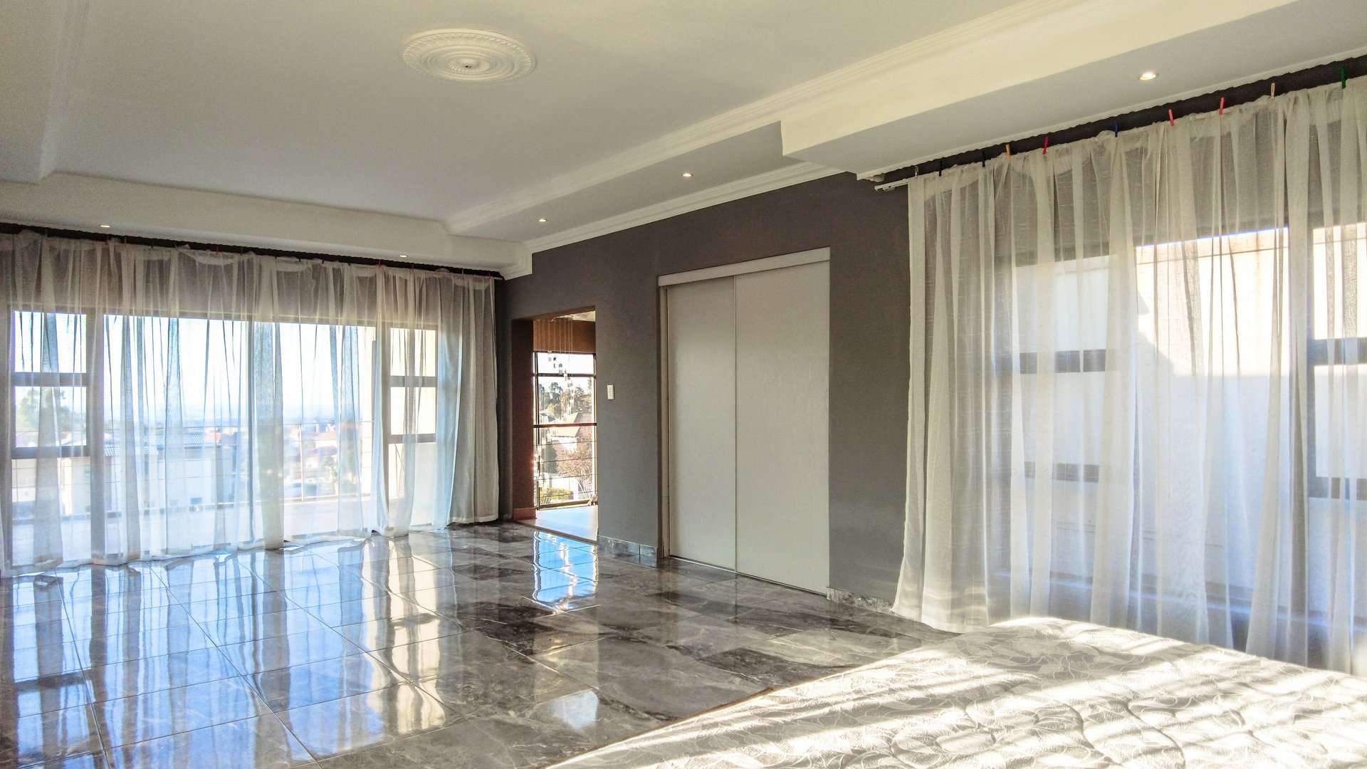 The main bedroom is a serene retreat, complete with his and hers walk-in closets—perfectly designed for personalized convenience and storage.