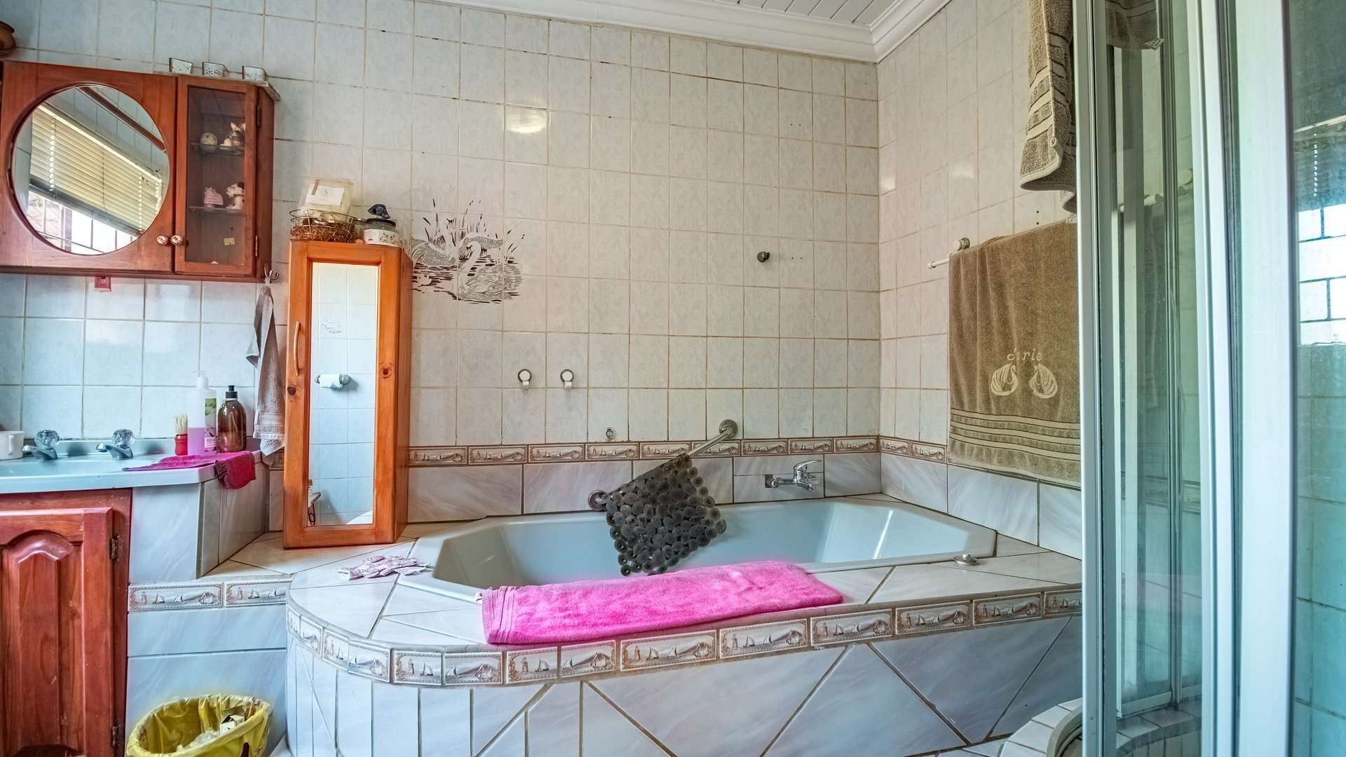 The main bedroom offers a relaxing retreat with a full en-suite featuring both shower and bathtub, as well as built-in cupboards.