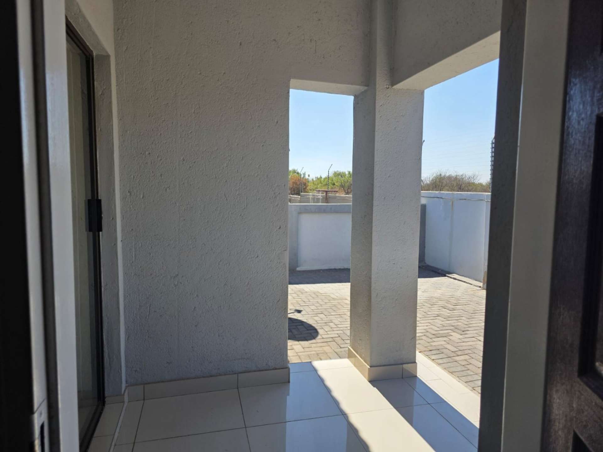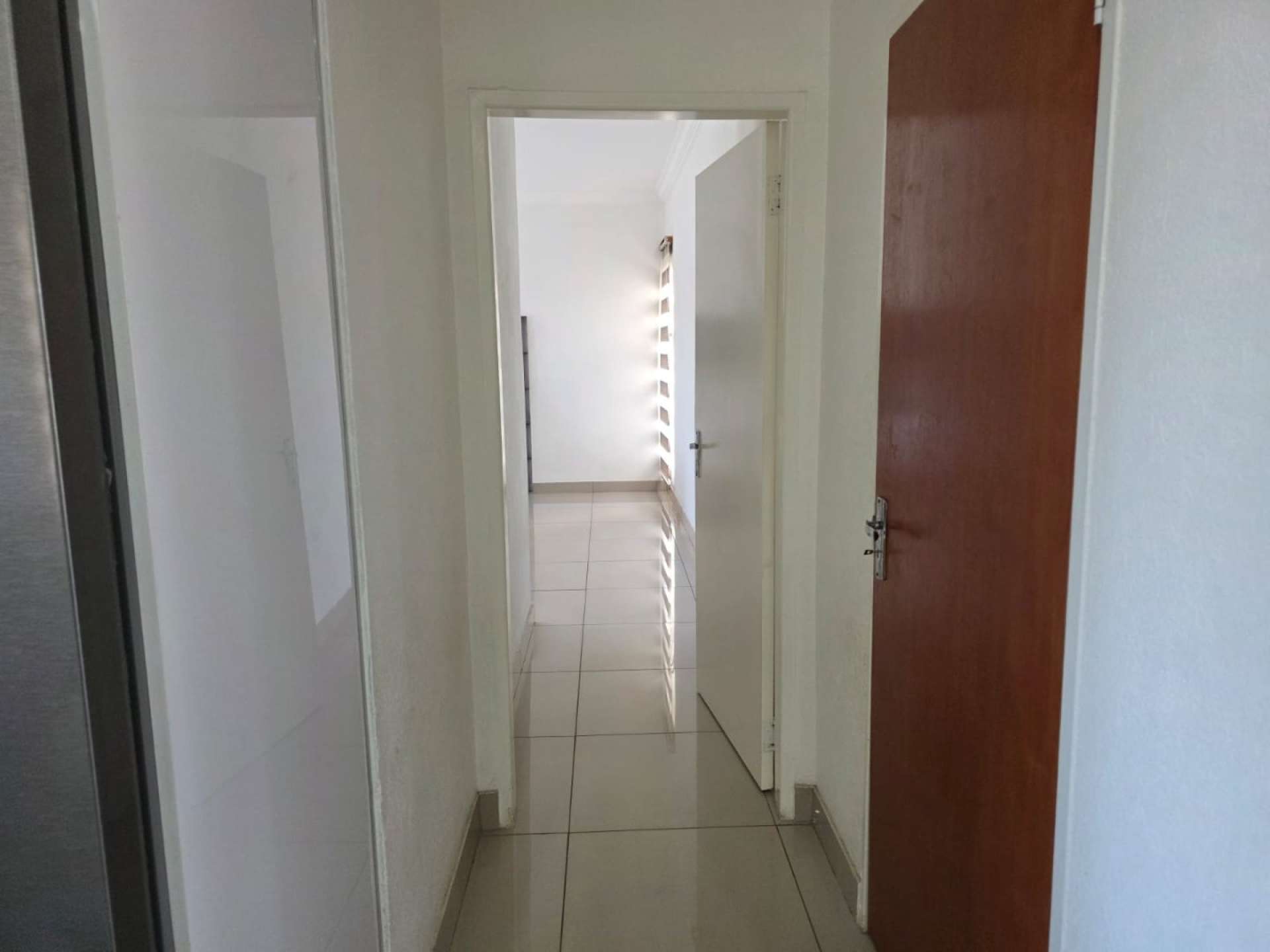 With space for a big double-door fridge. White big tiles in the kitchen and all around the house.