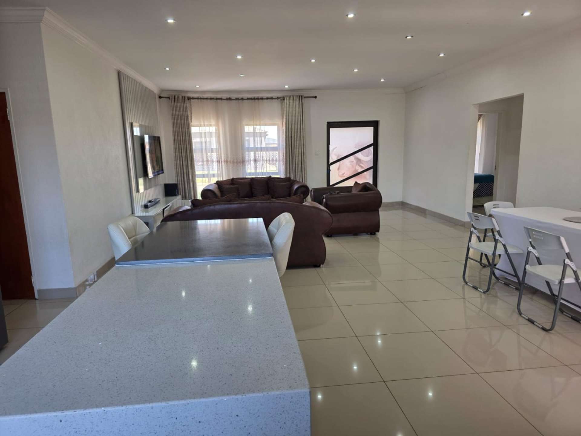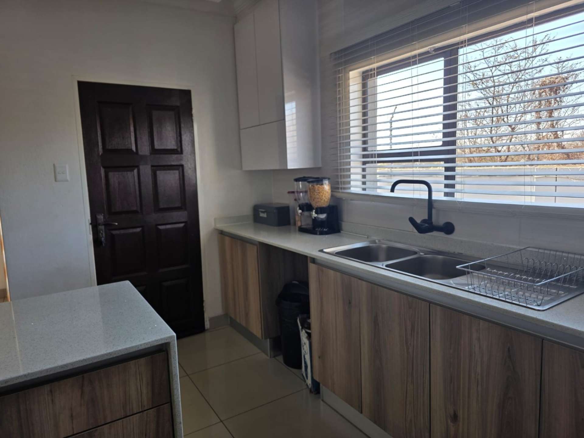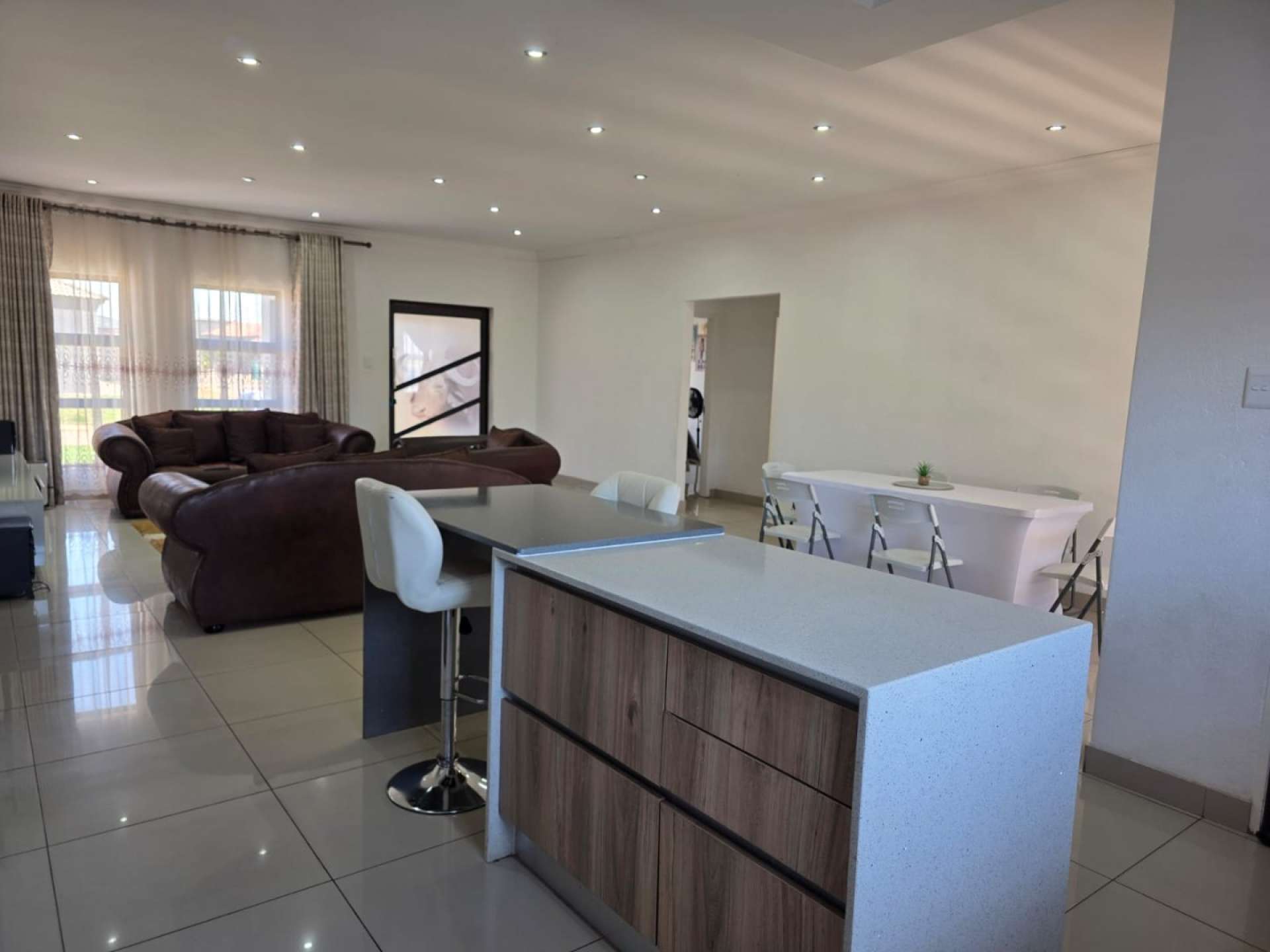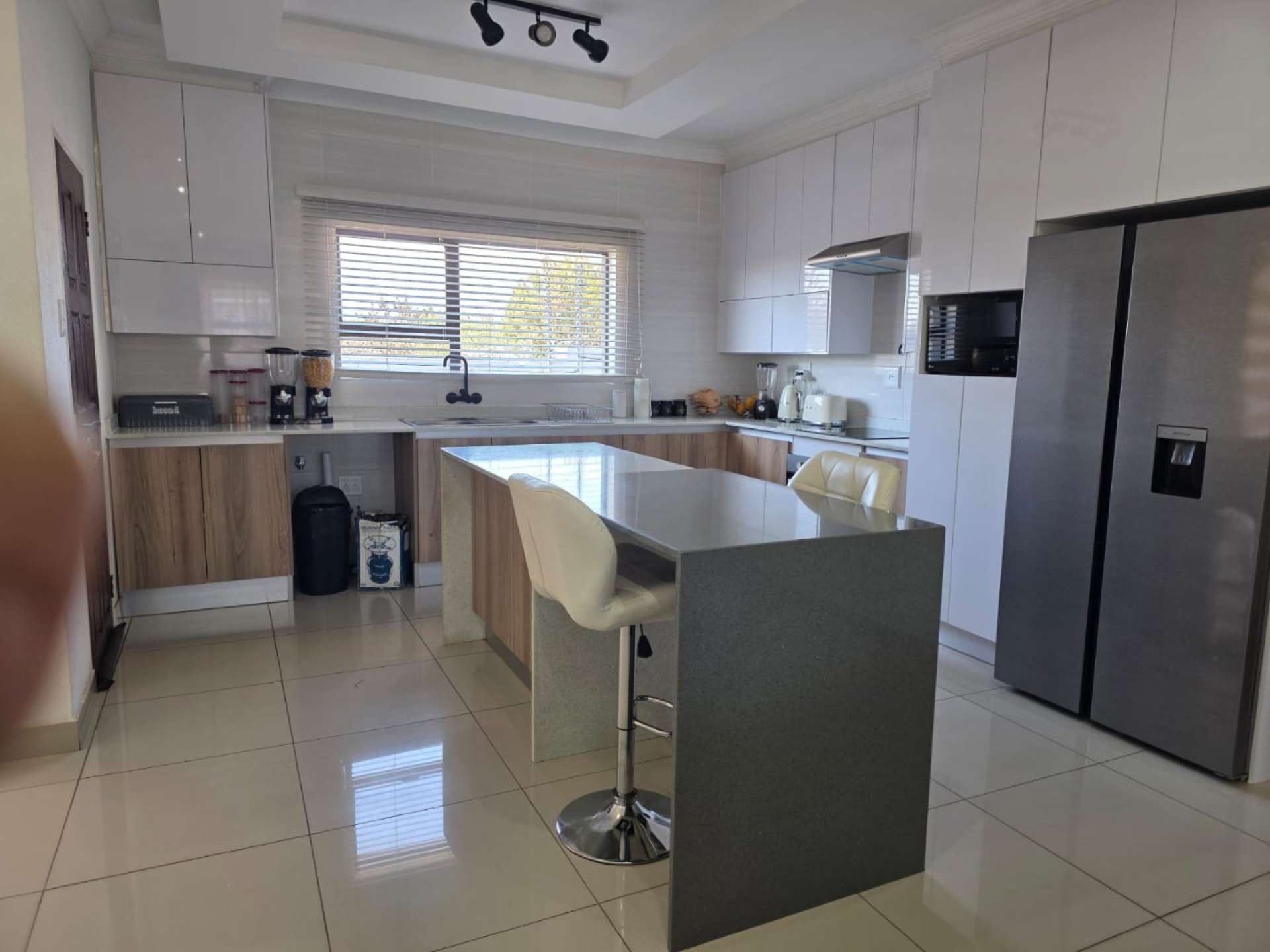 Neat as a pin, open plan kitchen, beautiful and modern, loads of cupboard space. With granite countertops. Has a granite island top table.