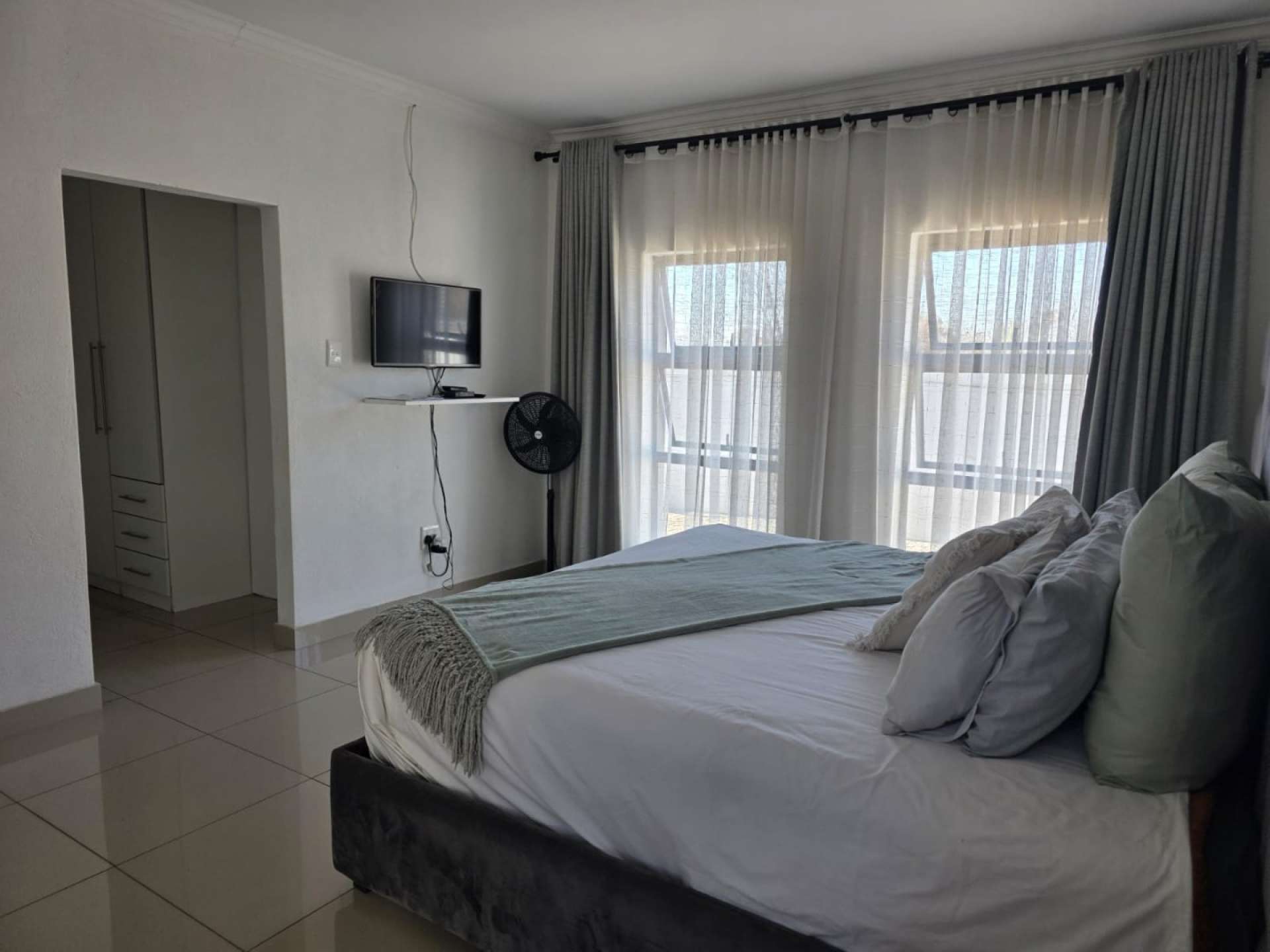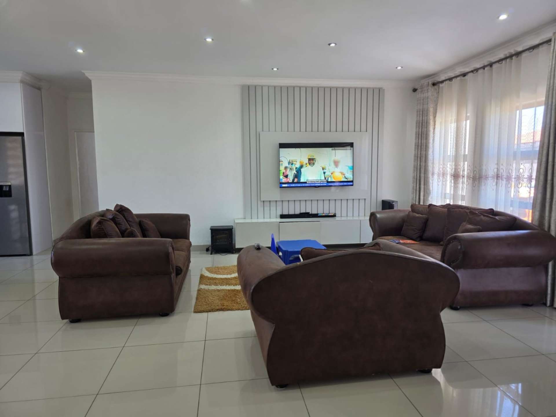 It features 2 shades of contemporary grey for the outer colour, a neat pavement leading to the double garage, a washing line at the back, modern side gate to enter the back of the house. Big main entrance glass door. Open plan living and dining areas, TV stand already mounted on the wall.