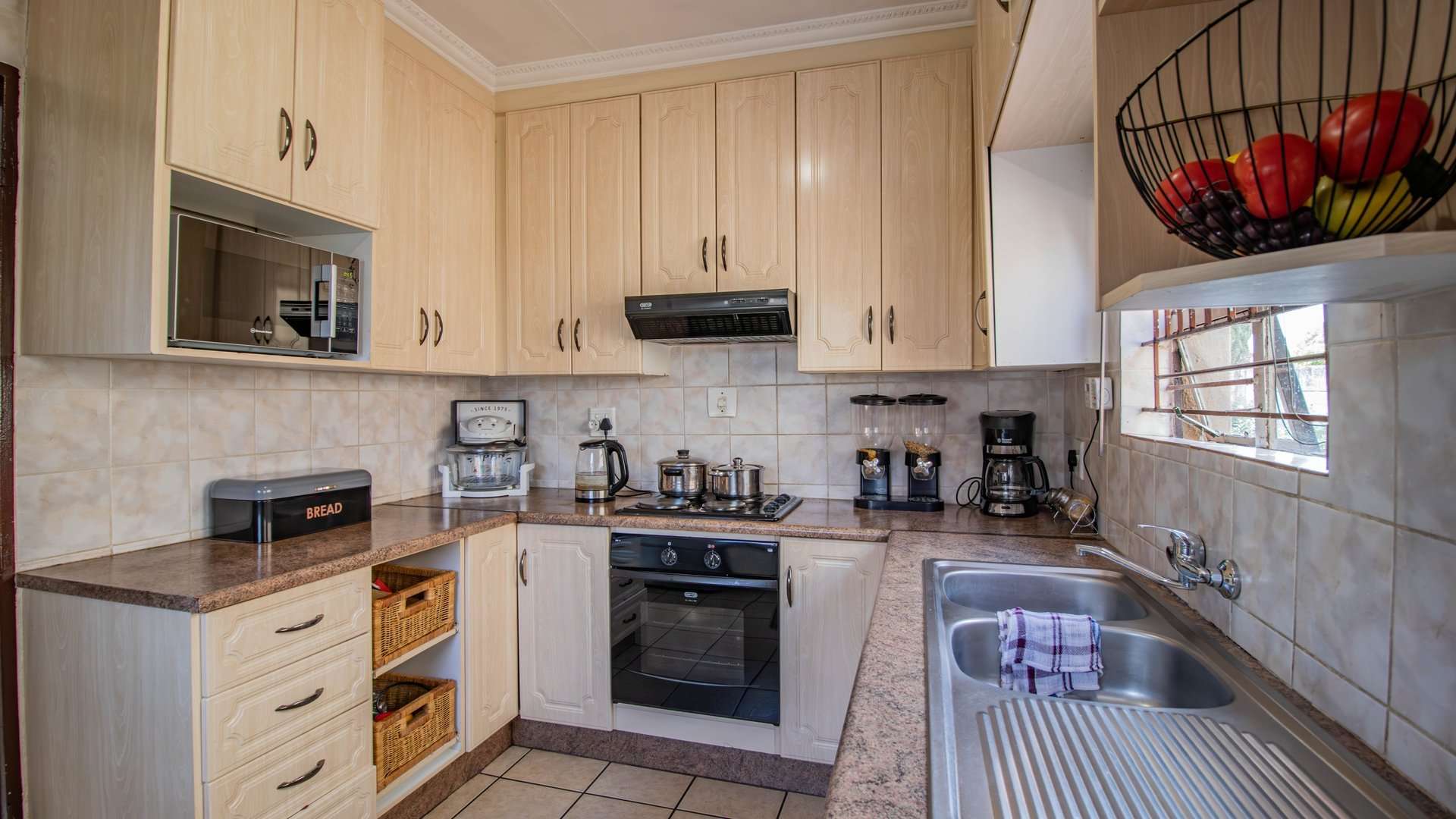 Bright, well-appointed kitchen with electric hob, extractor fan, and under-counter oven