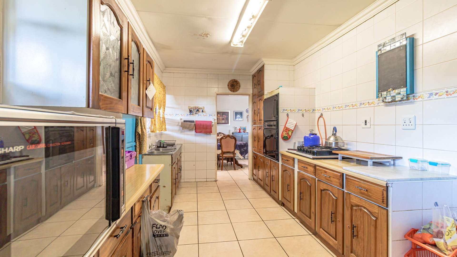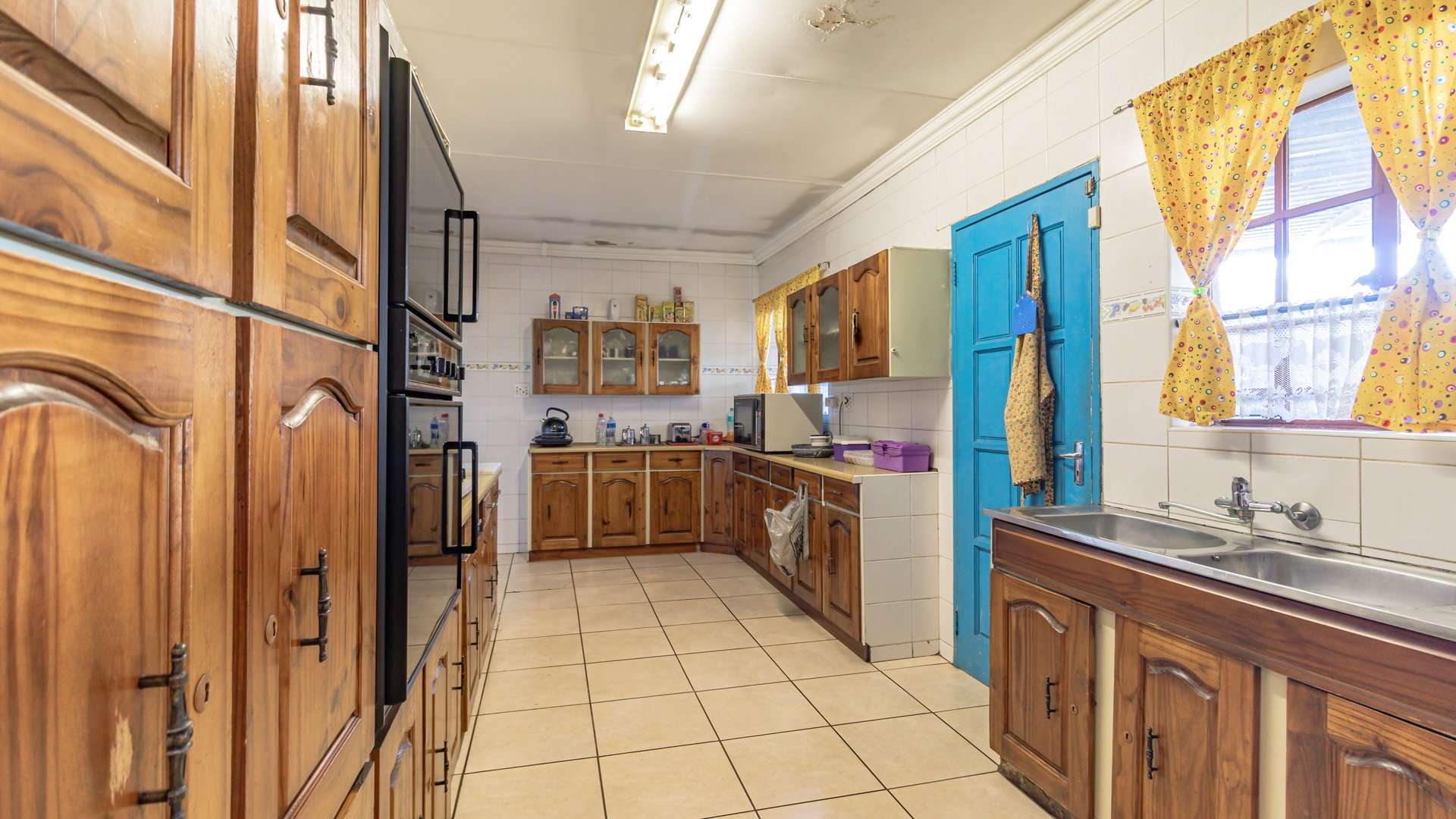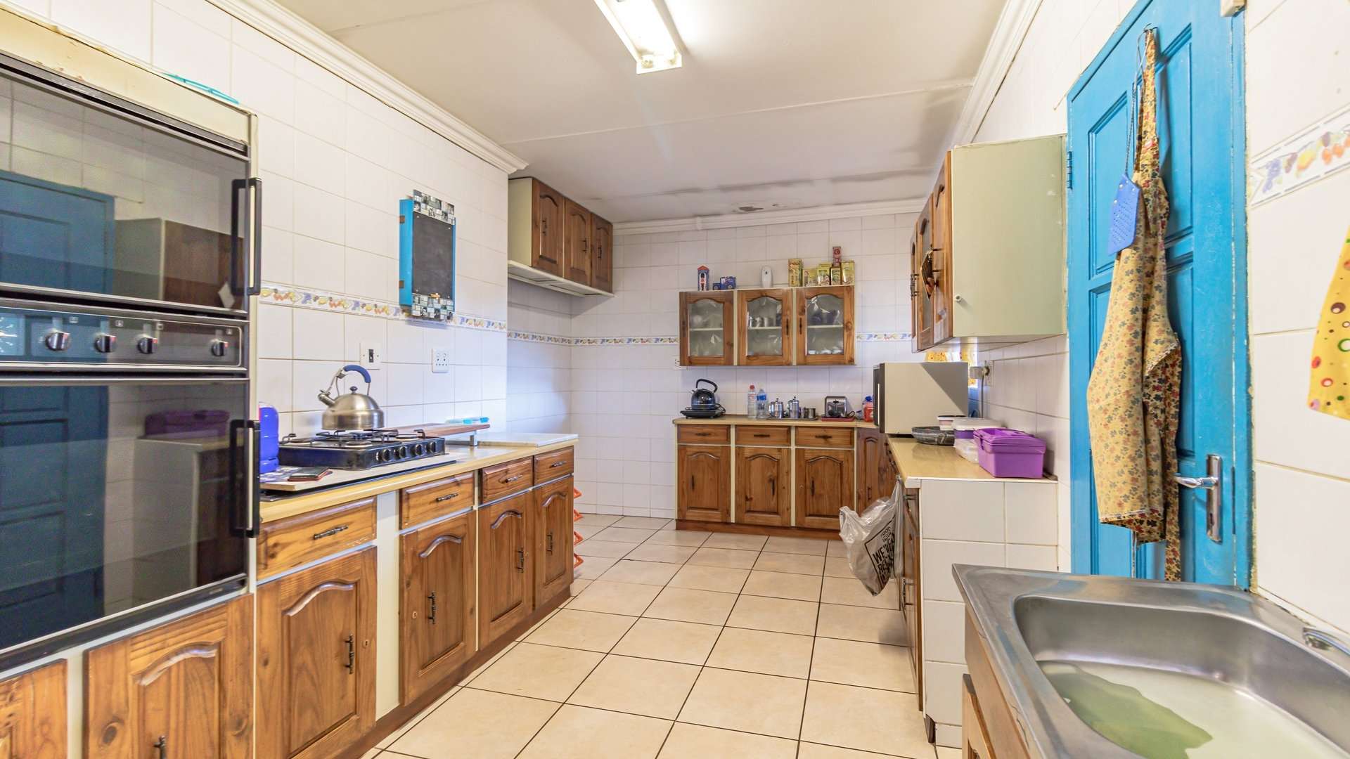The spacious kitchen features a charming vintage design, complete with a countertop electric four-plate stove, double eye-level oven, and solid wood cabinets — perfect for those who appreciate both character and functionality.