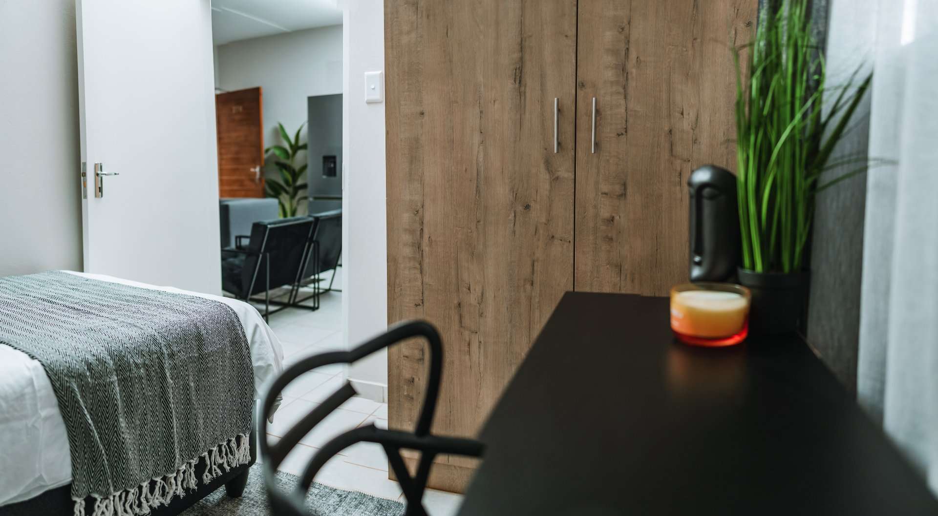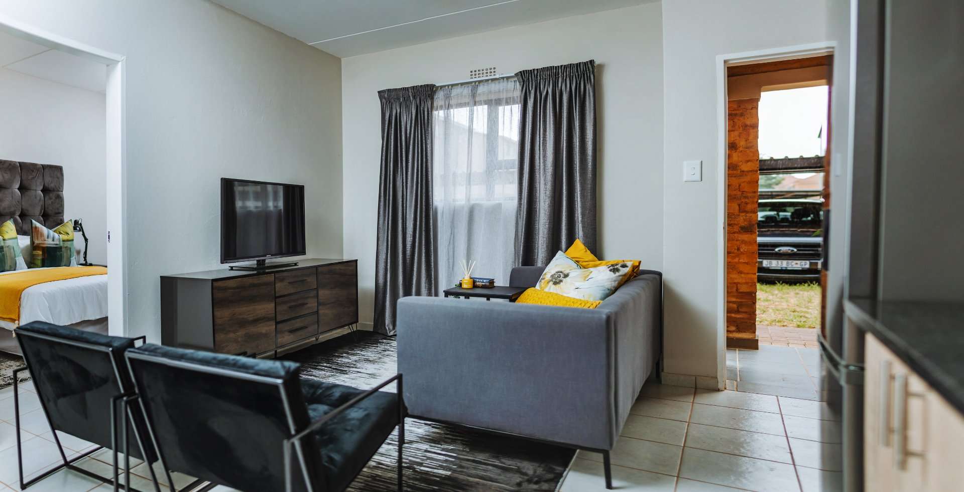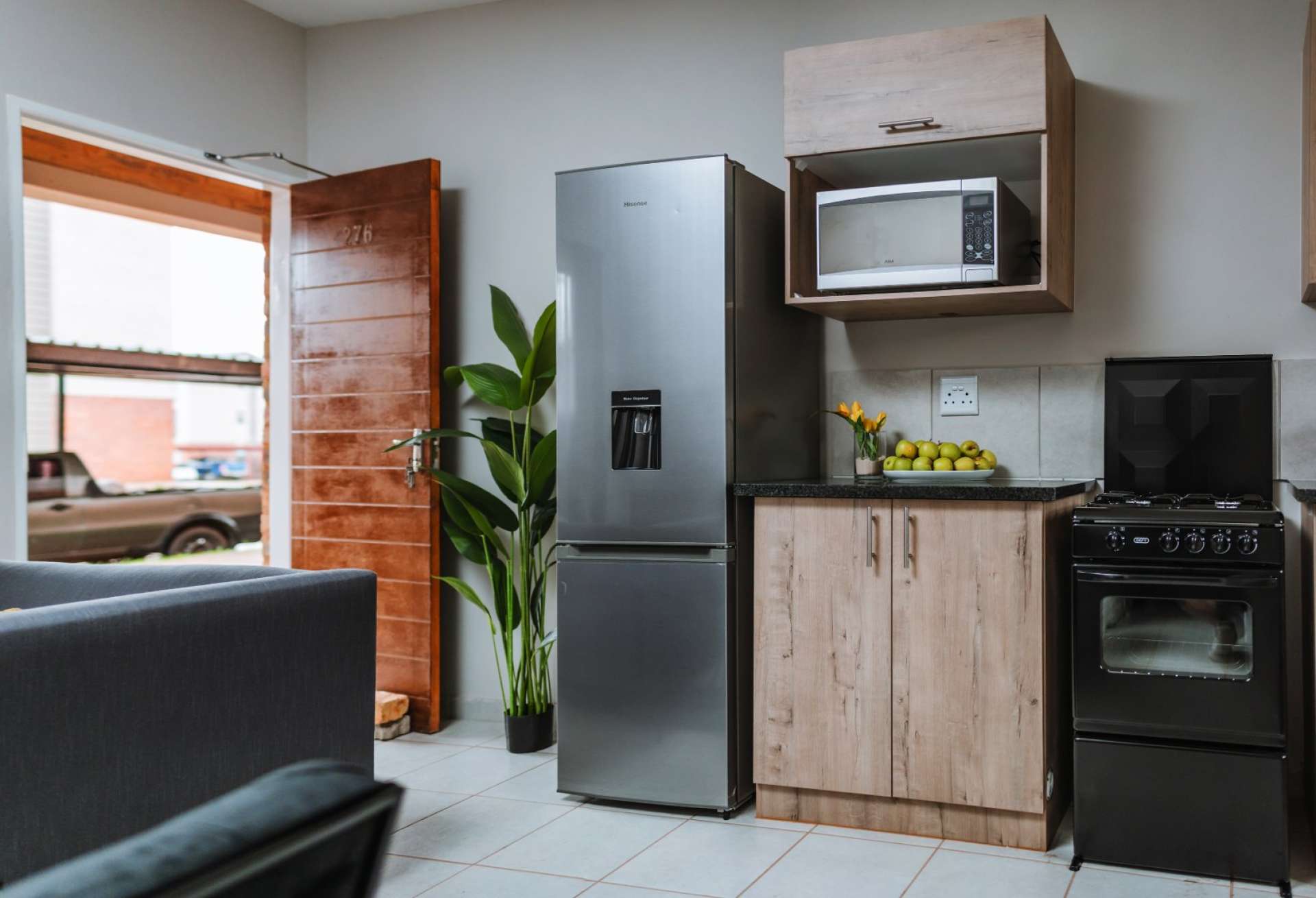 These beautifully designed units offer the perfect blend of modern style and everyday practicality. The open-plan kitchen is fitted with sleek black granite countertops, a 4-plate gas stove, and an energy-efficient gas geyser, combining convenience with cost-saving benefits.