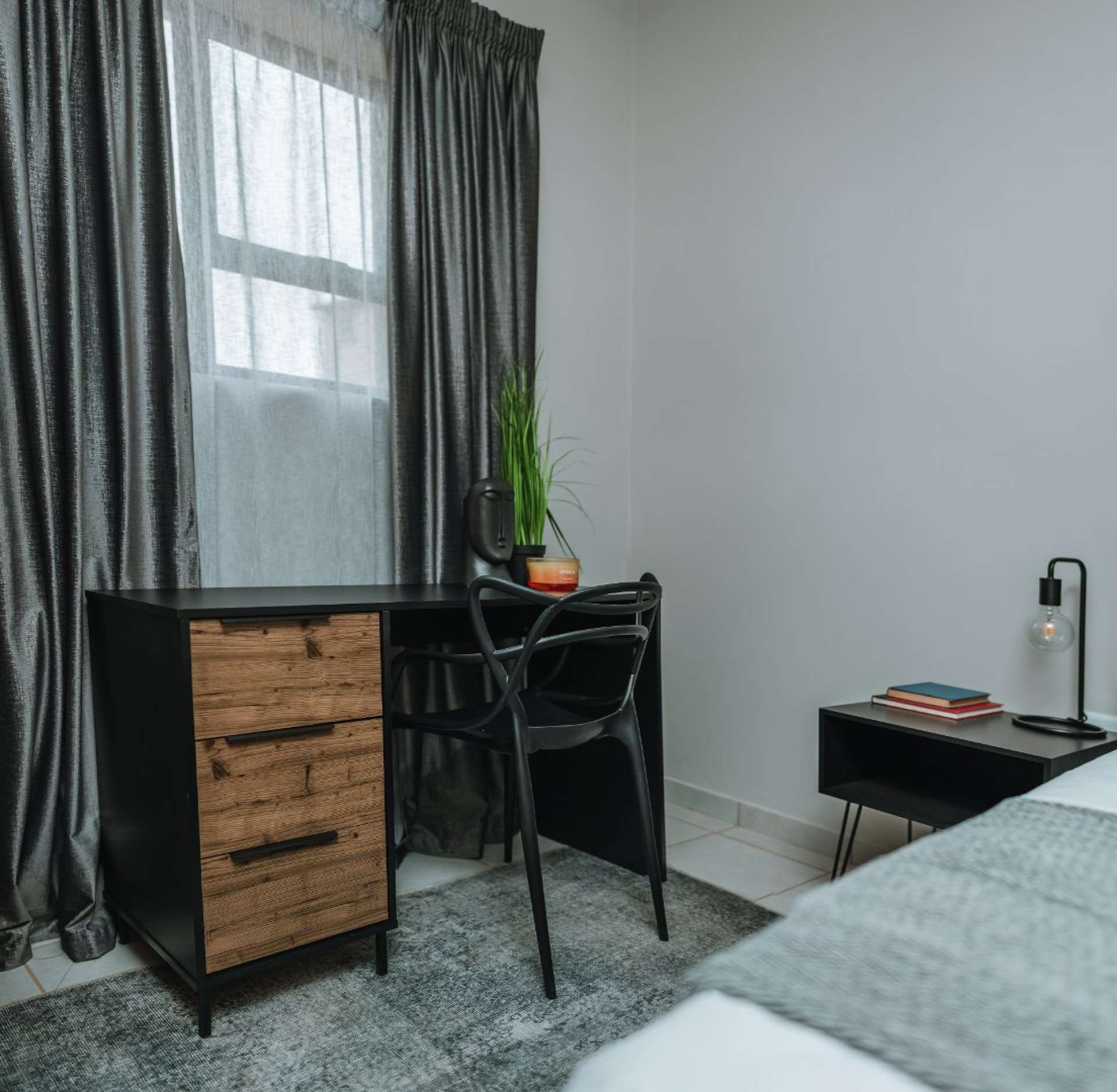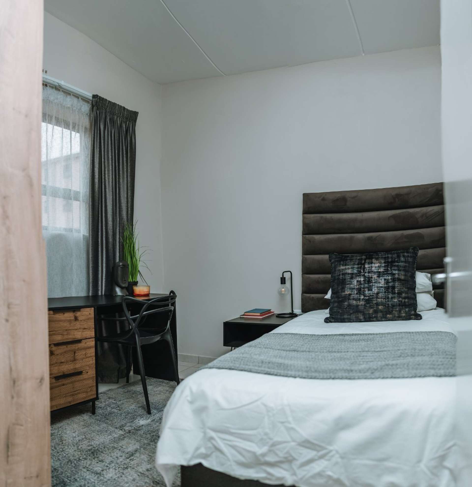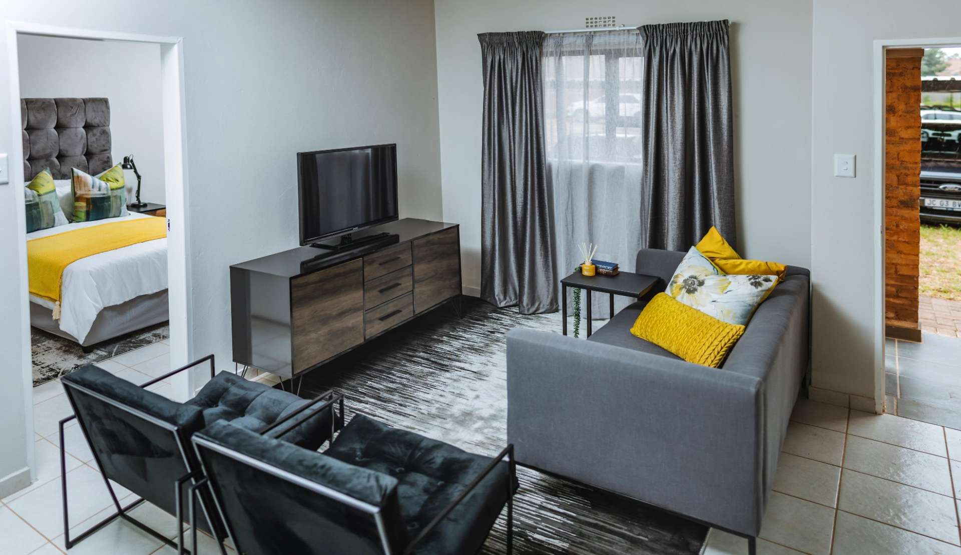 These beautifully designed units offer the perfect blend of modern style and everyday practicality. The open-plan kitchen is fitted with sleek black granite countertops, a 4-plate gas stove, and an energy-efficient gas geyser, combining convenience with cost-saving benefits.