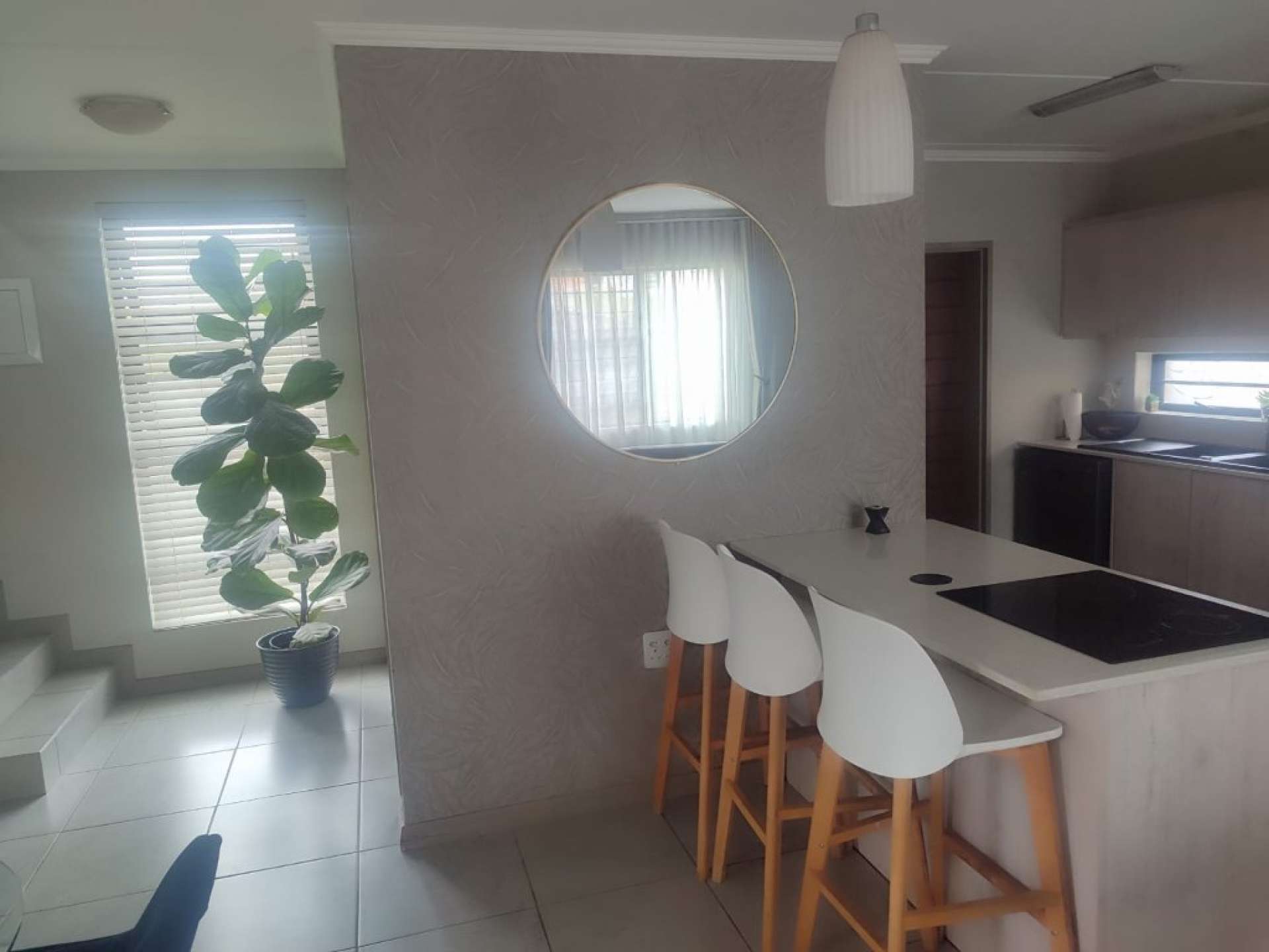 The home features a **unique, eye-catching wallpaper** that adds character and a stylish focal point to the interior. The living area comes **fitted with a mounted TV stand**, creating a neat and contemporary entertainment space.