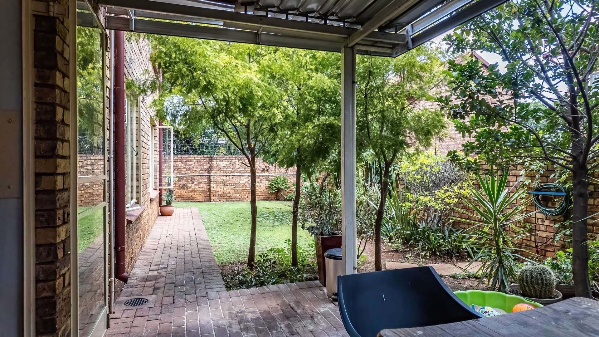 Covered patio with a spacious private garden