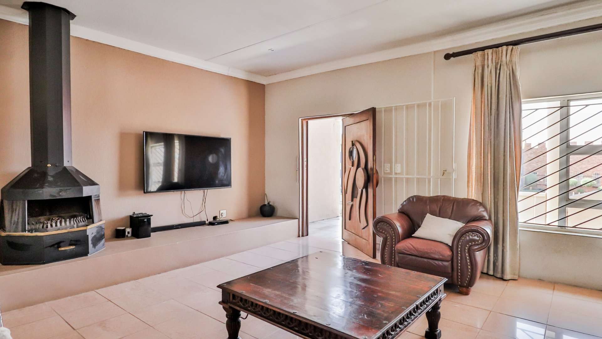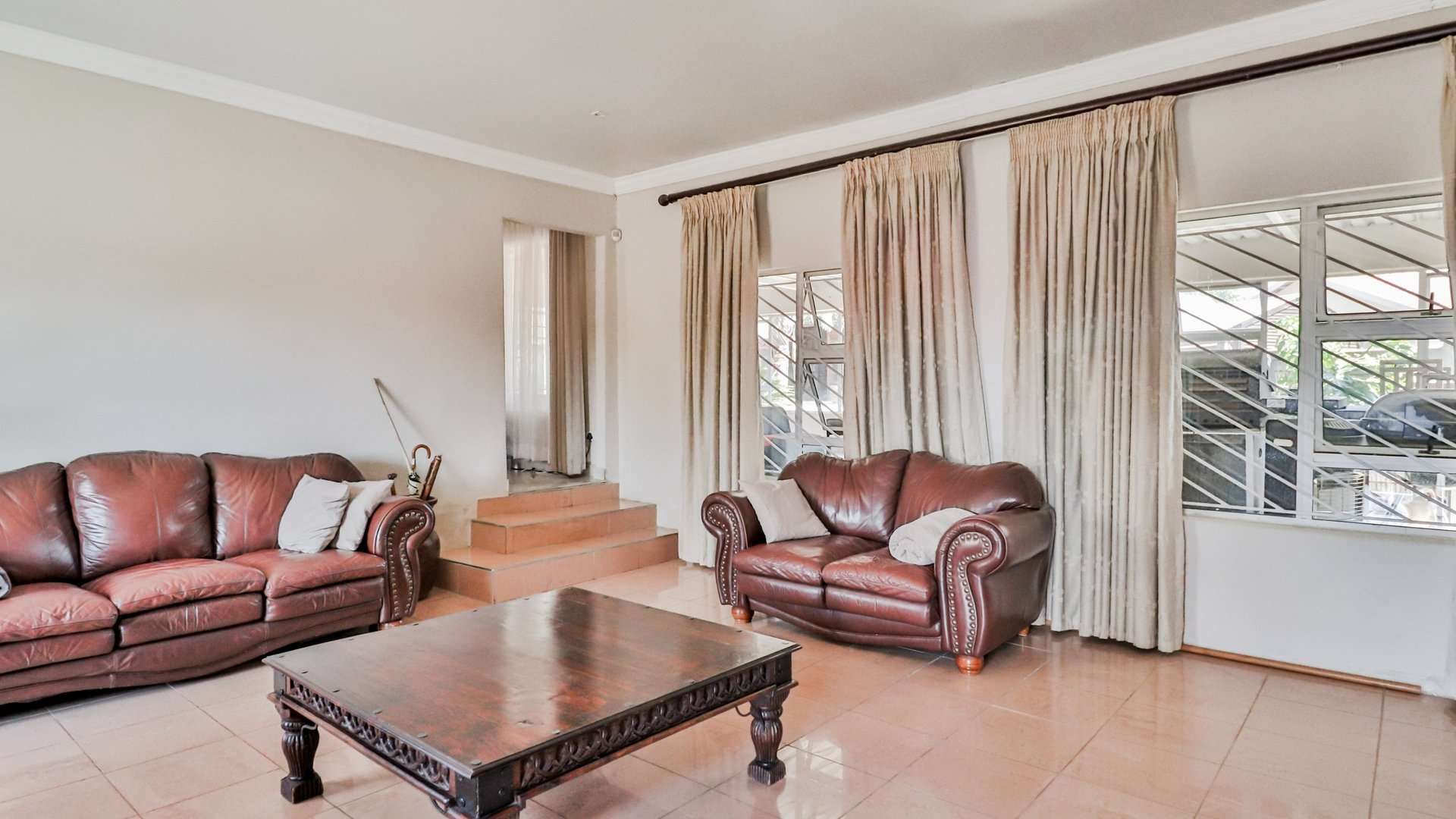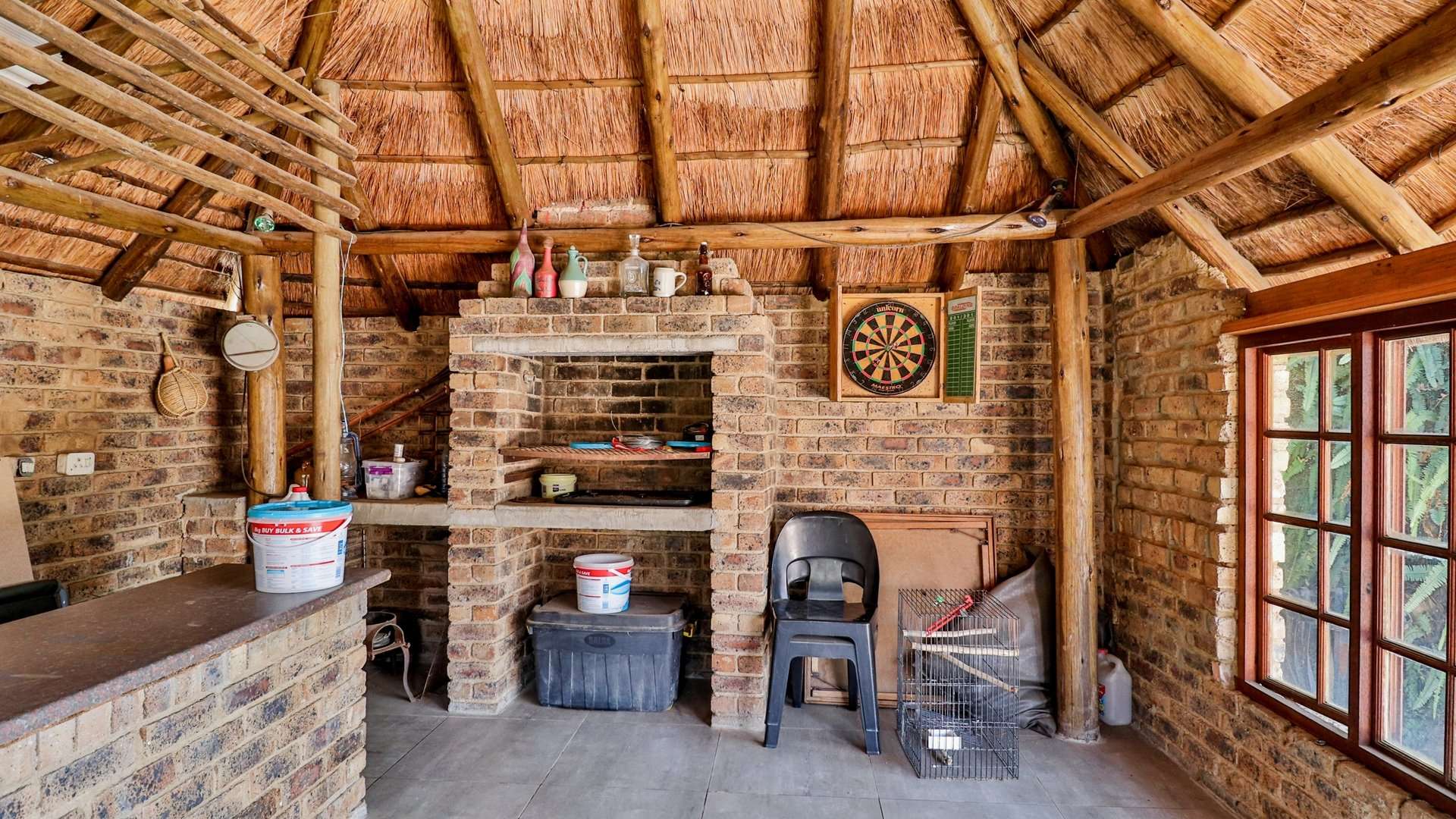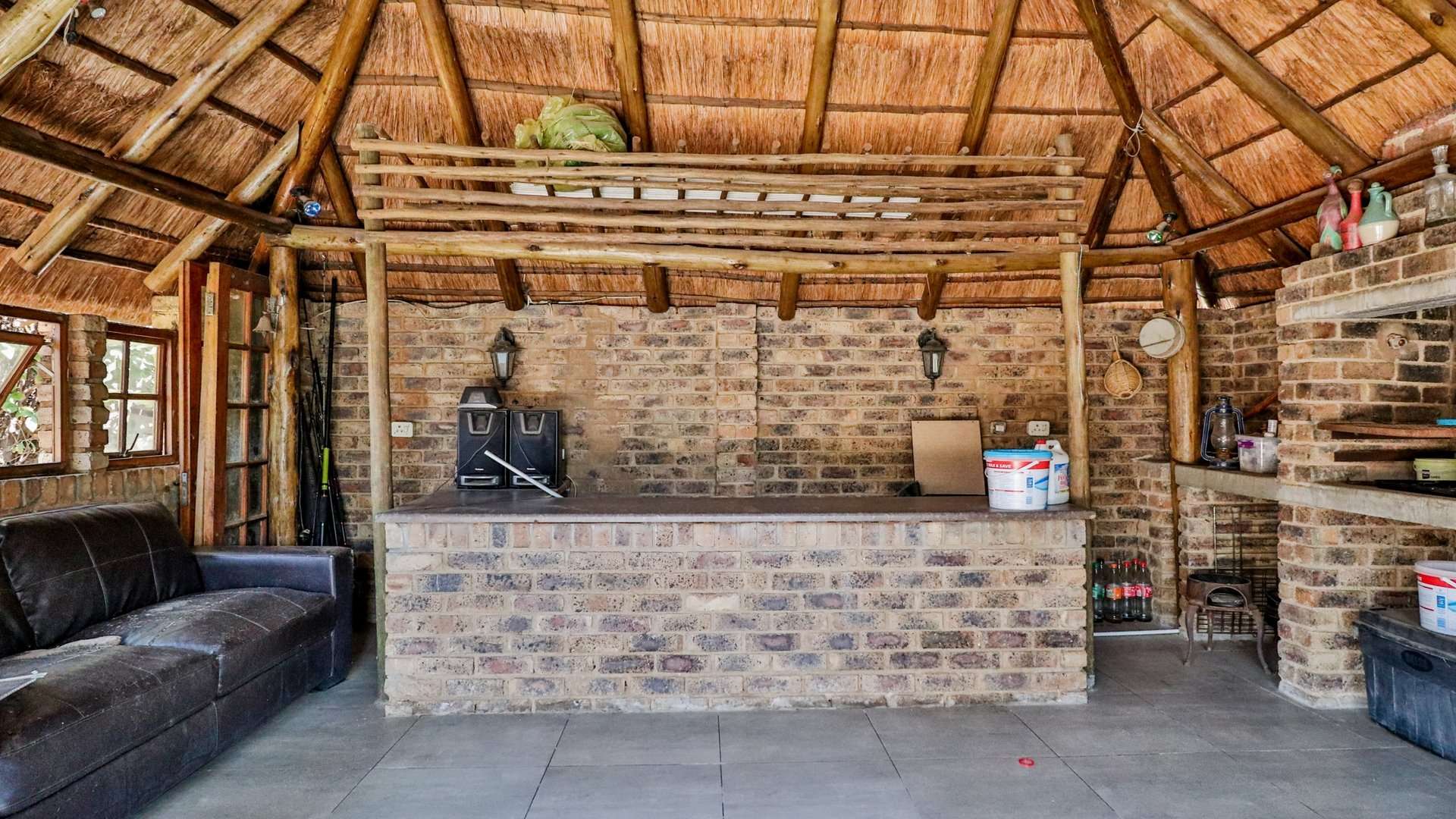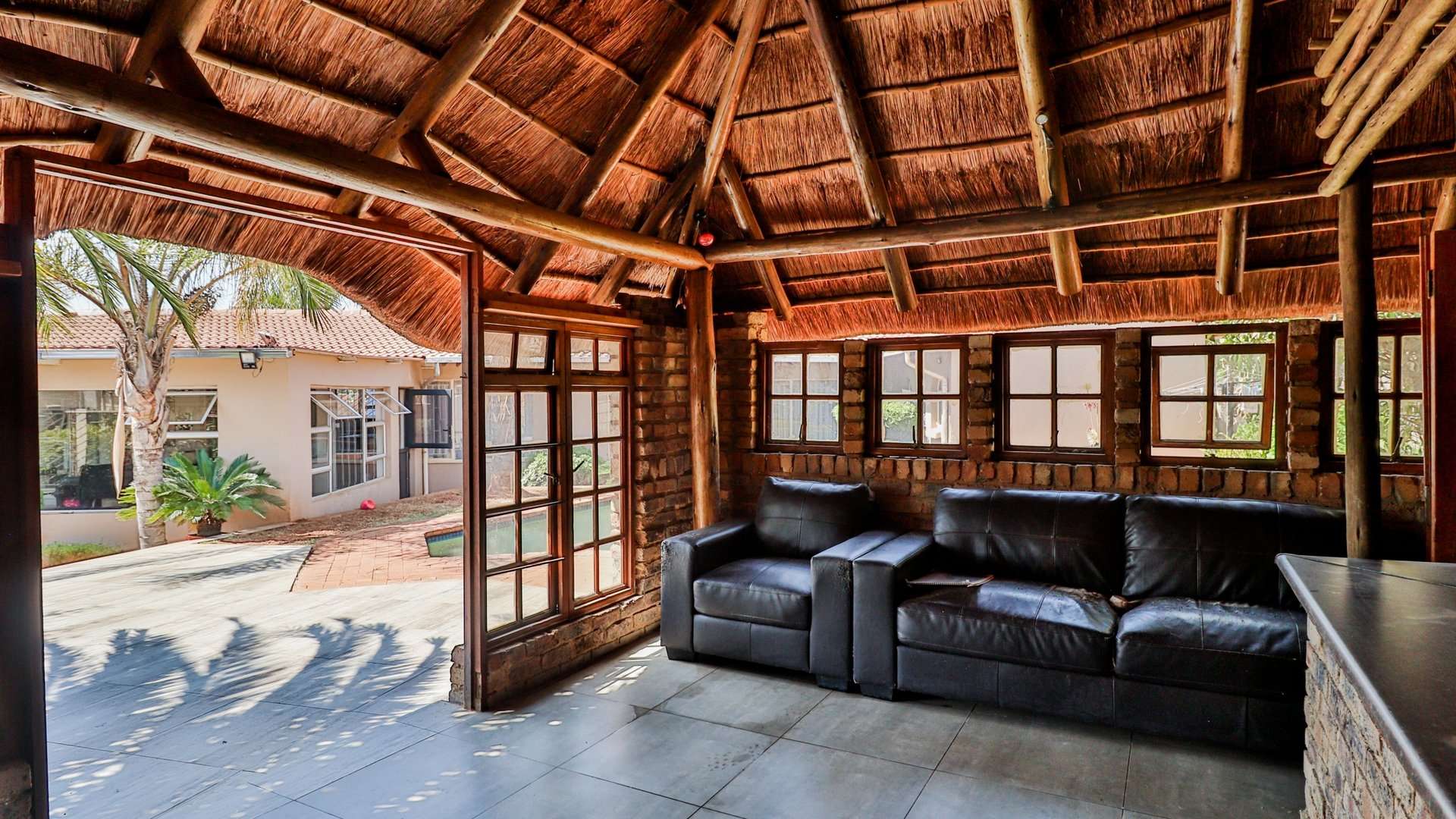 The living areas flow seamlessly into one another as well as into the huge patio with a built-in braai, creating an open-plan layout that is perfect for entertaining guests.