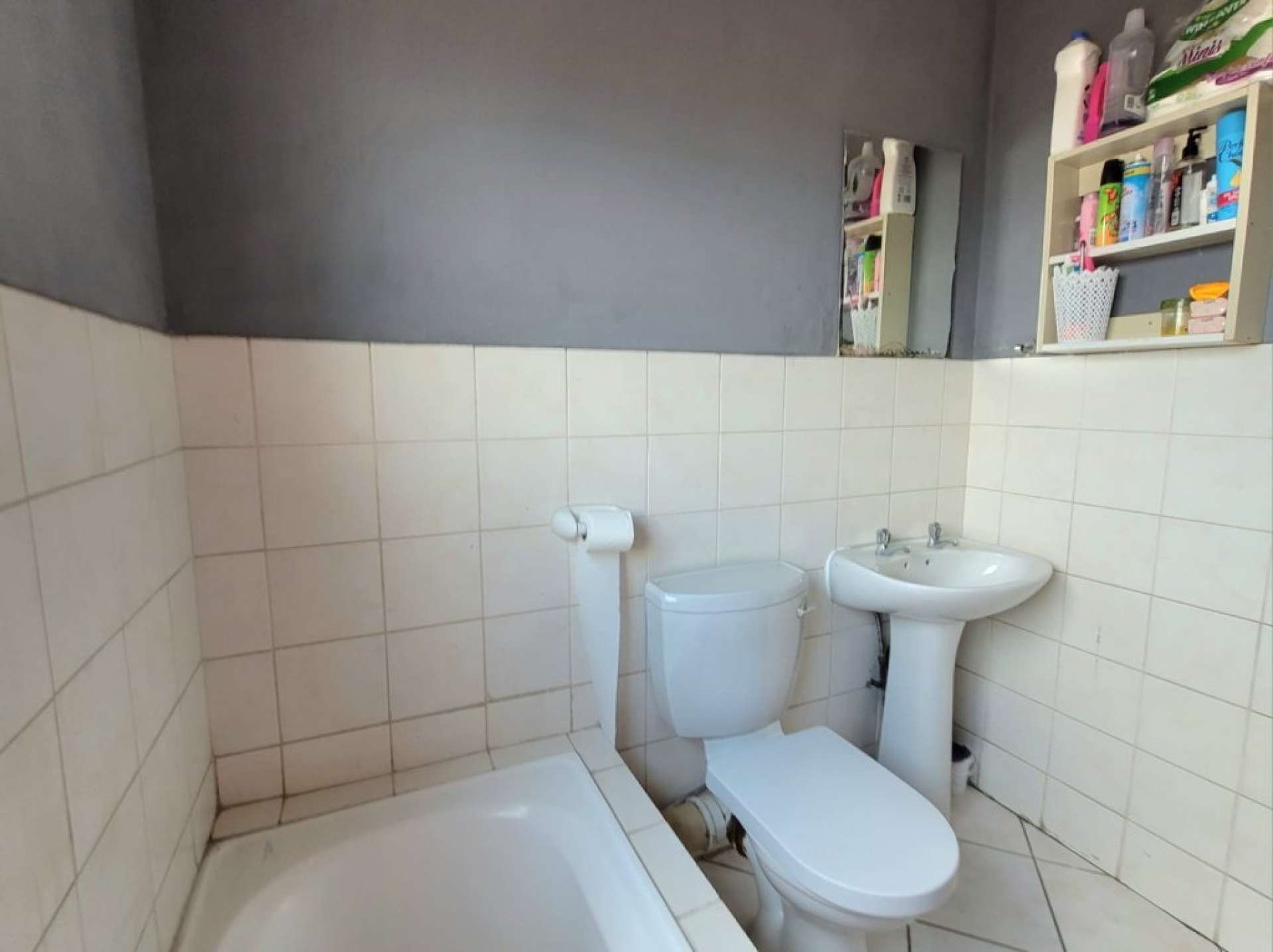 The main bedroom is generously sized and includes a full built-in cupboard, while the second bedroom offers a single built-in cupboard. The bathroom is fitted with a bath, basin, and toilet.