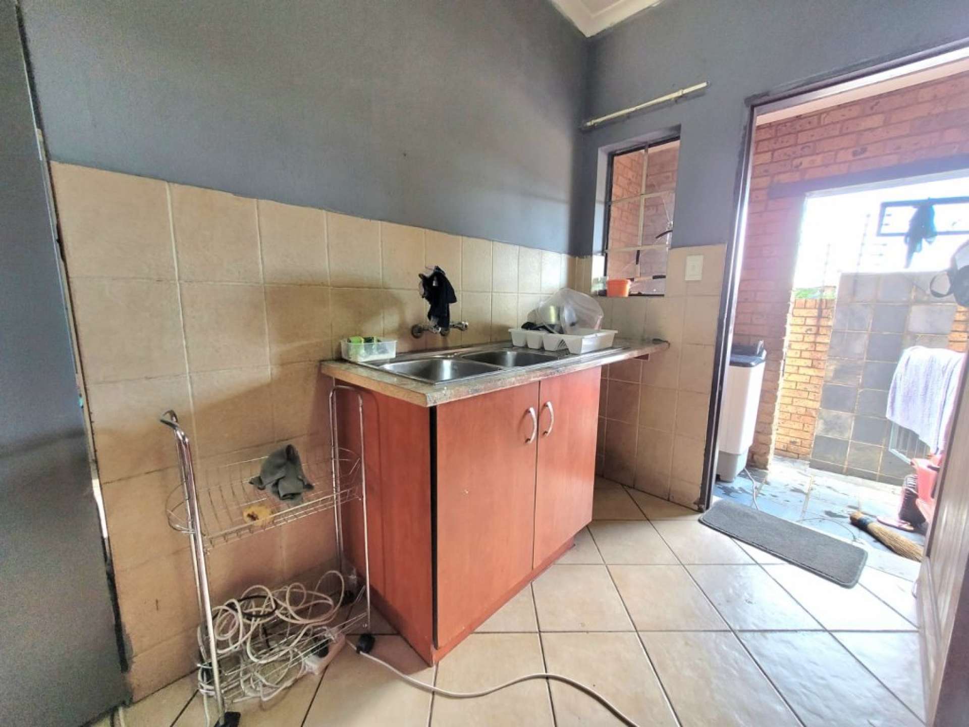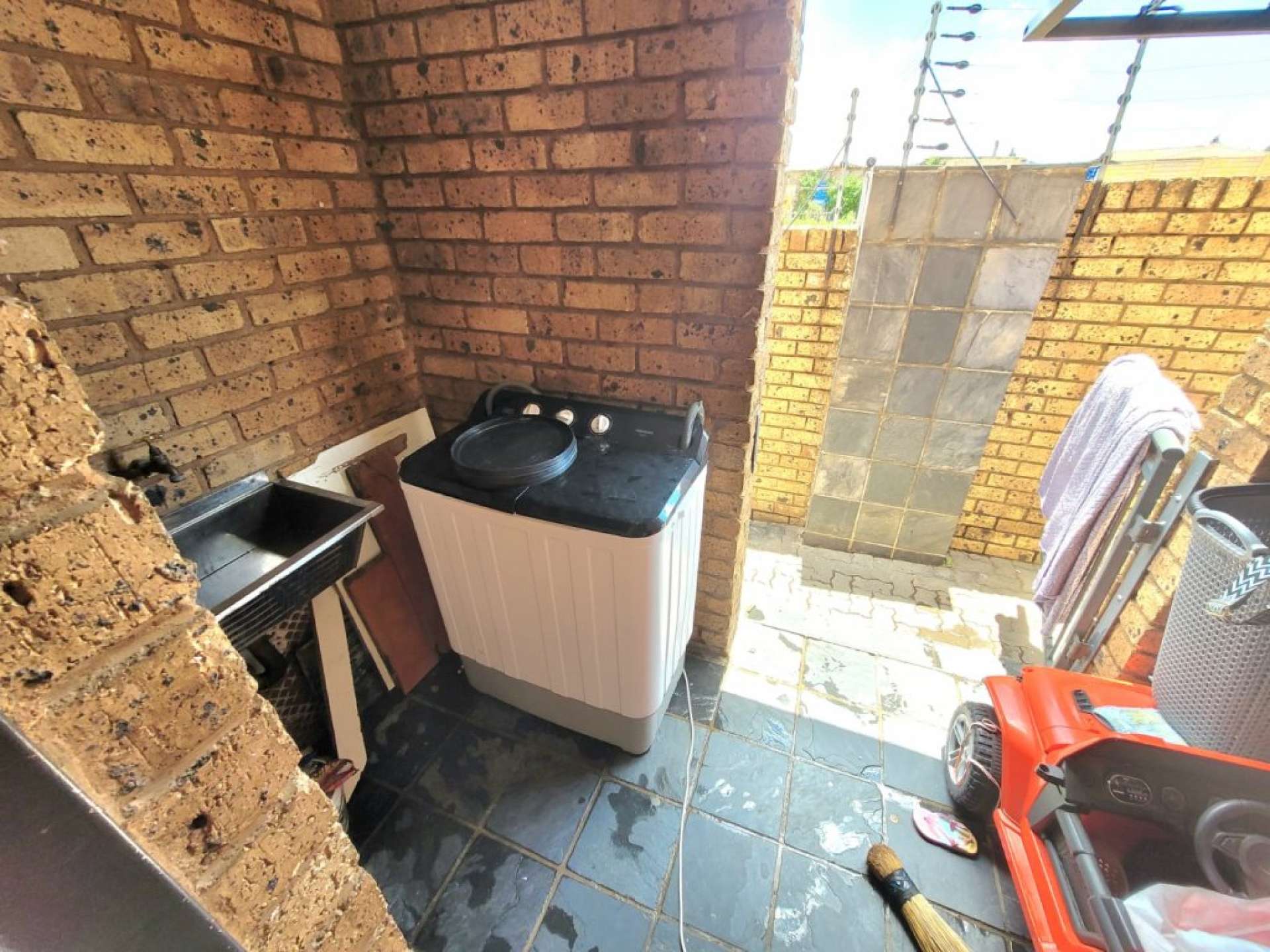 At the back, you'll find a small patio with a large basin and clothesline, providing added convenience.