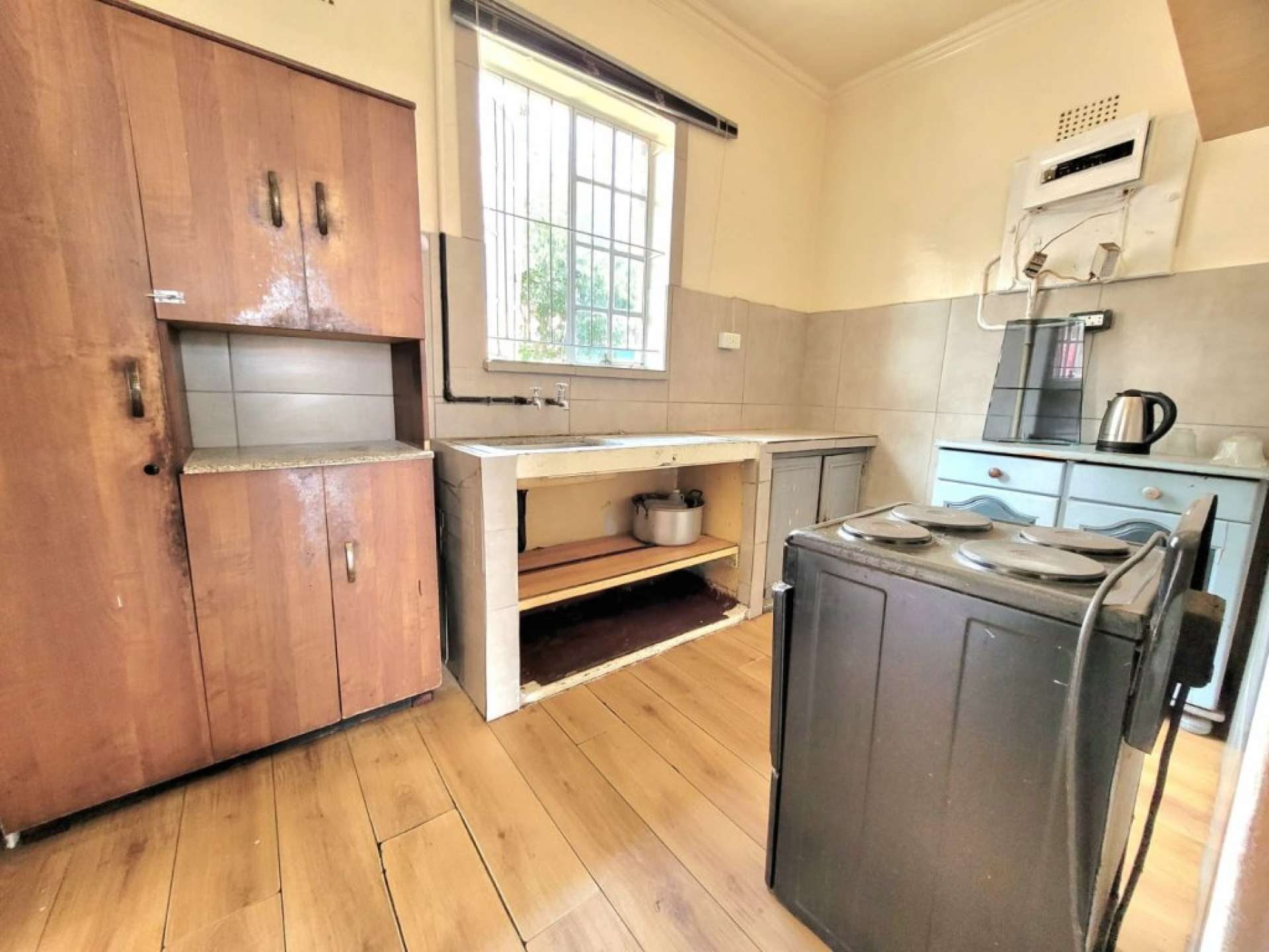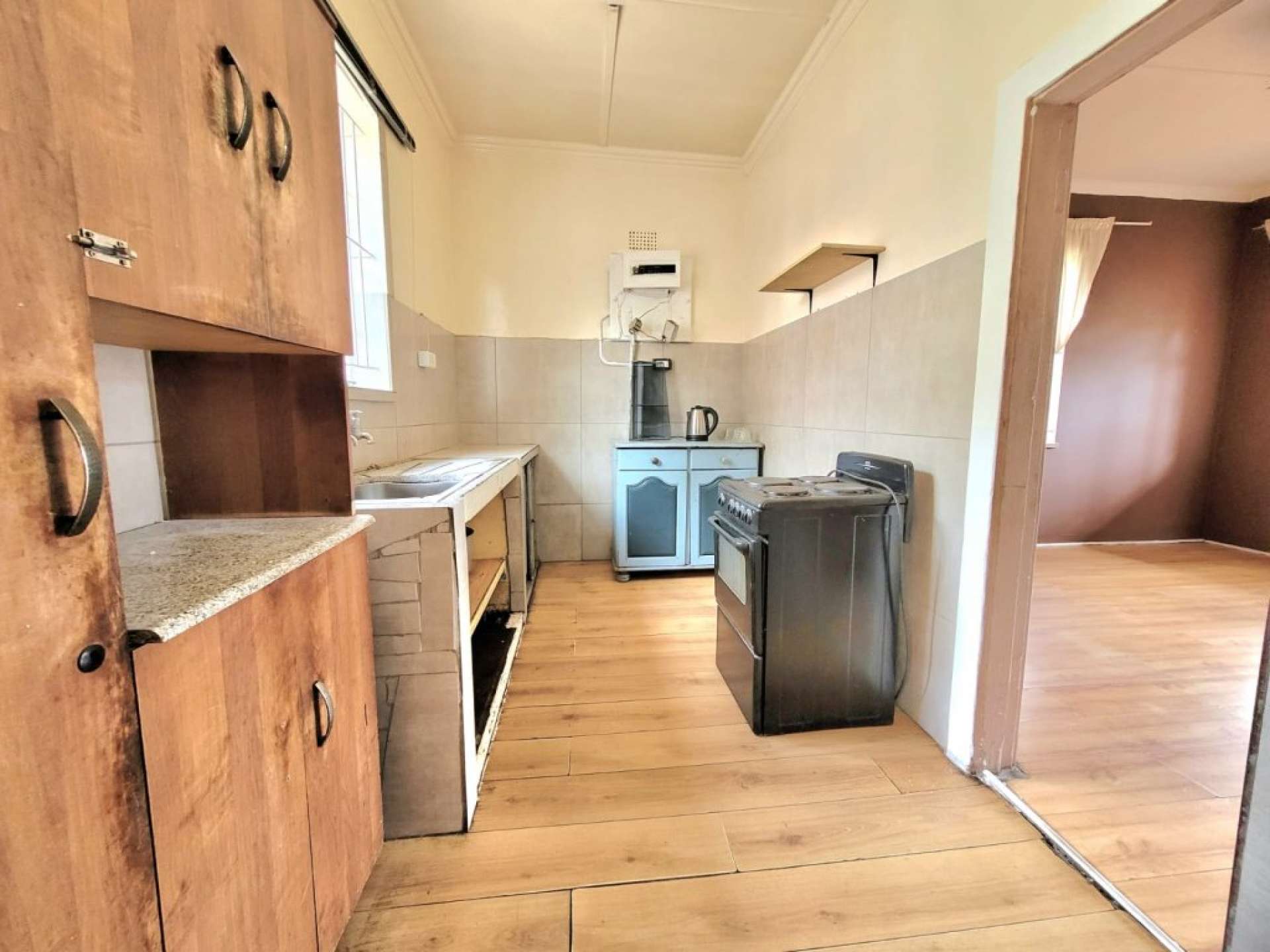 The kitchen is equipped with a single sink, loose cupboards, and a freestanding electric stove.