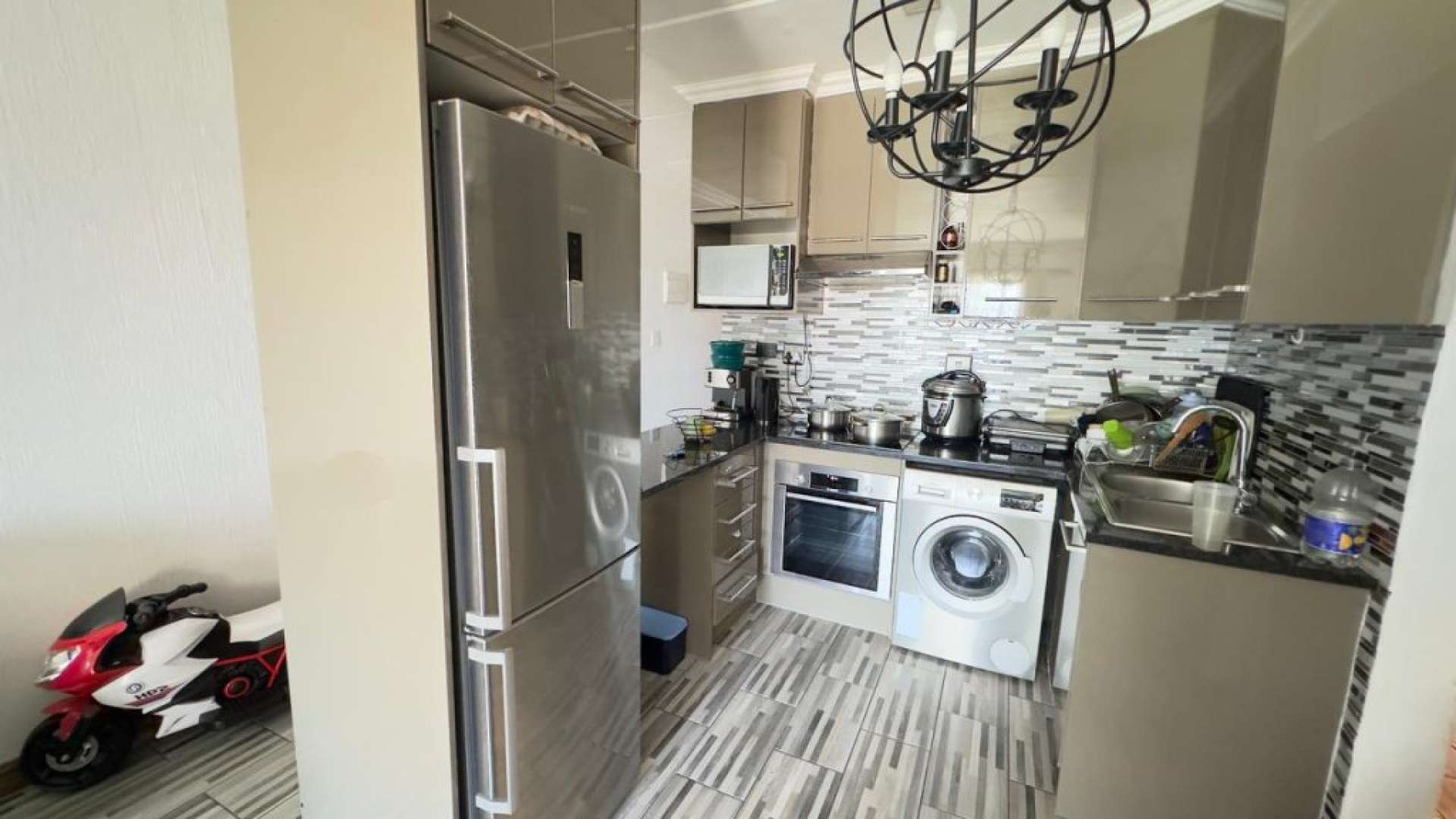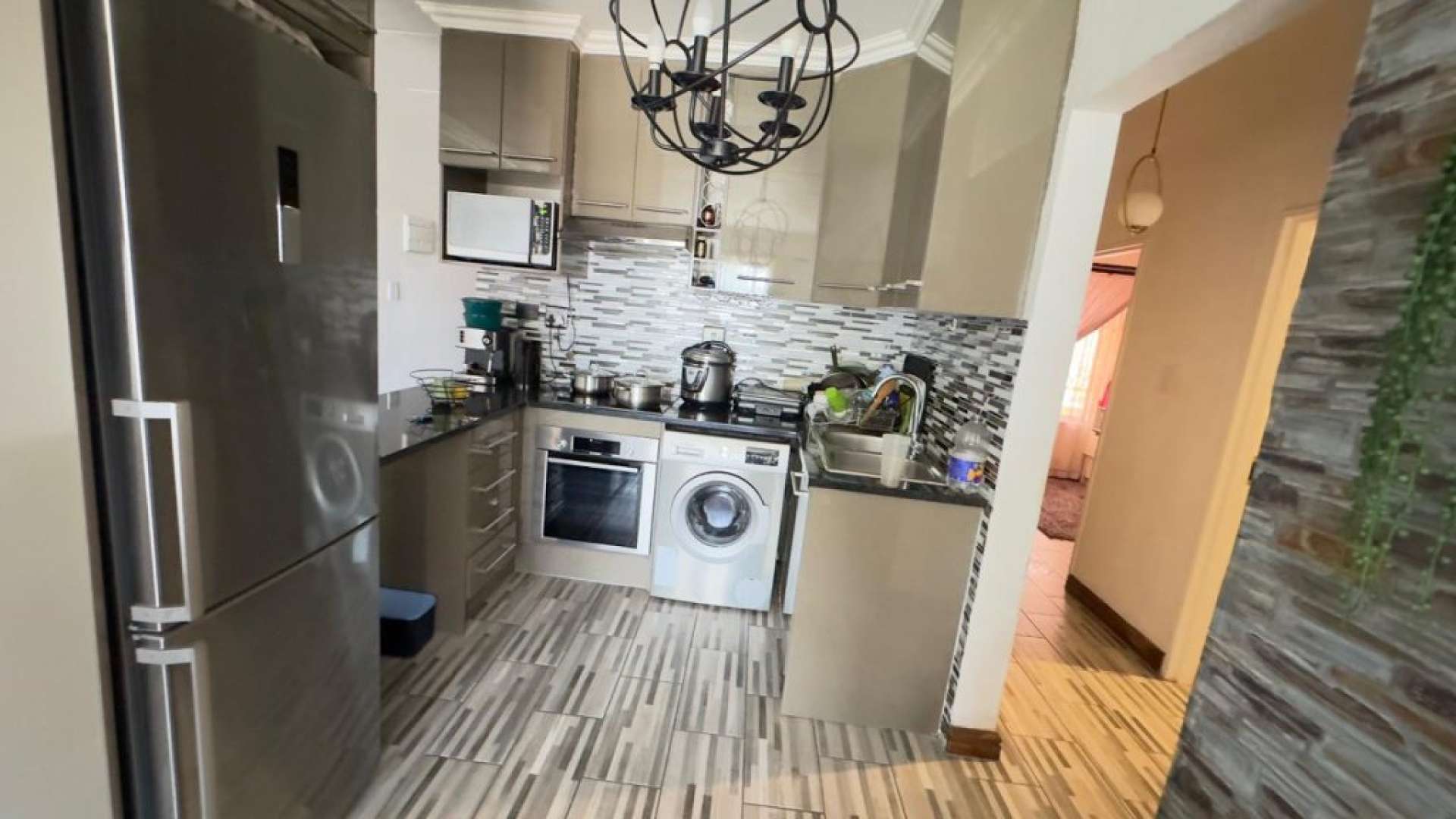 The modern kitchen features ample cupboard space and practical layout, making meal preparation a breeze.