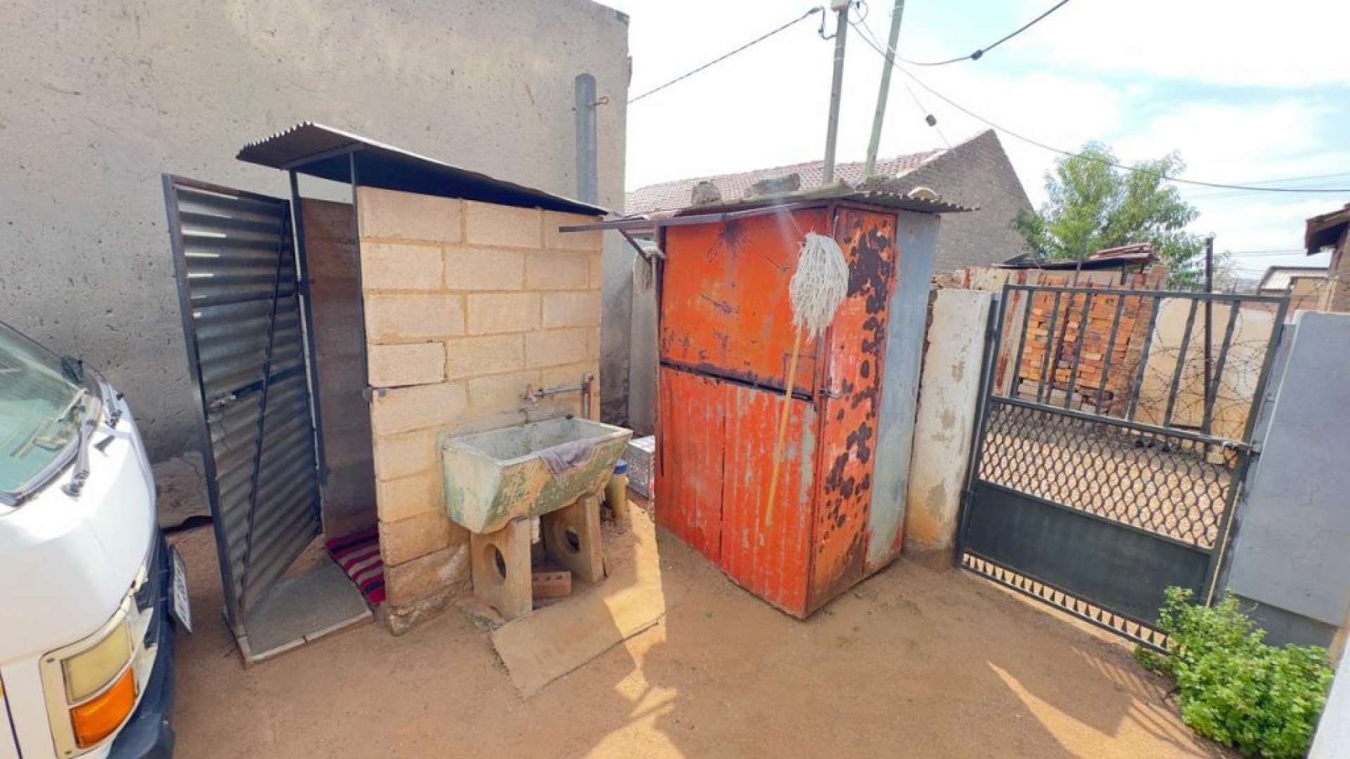 The yard is fully enclosed, offering privacy and security, with parking space available for multiple vehicles.