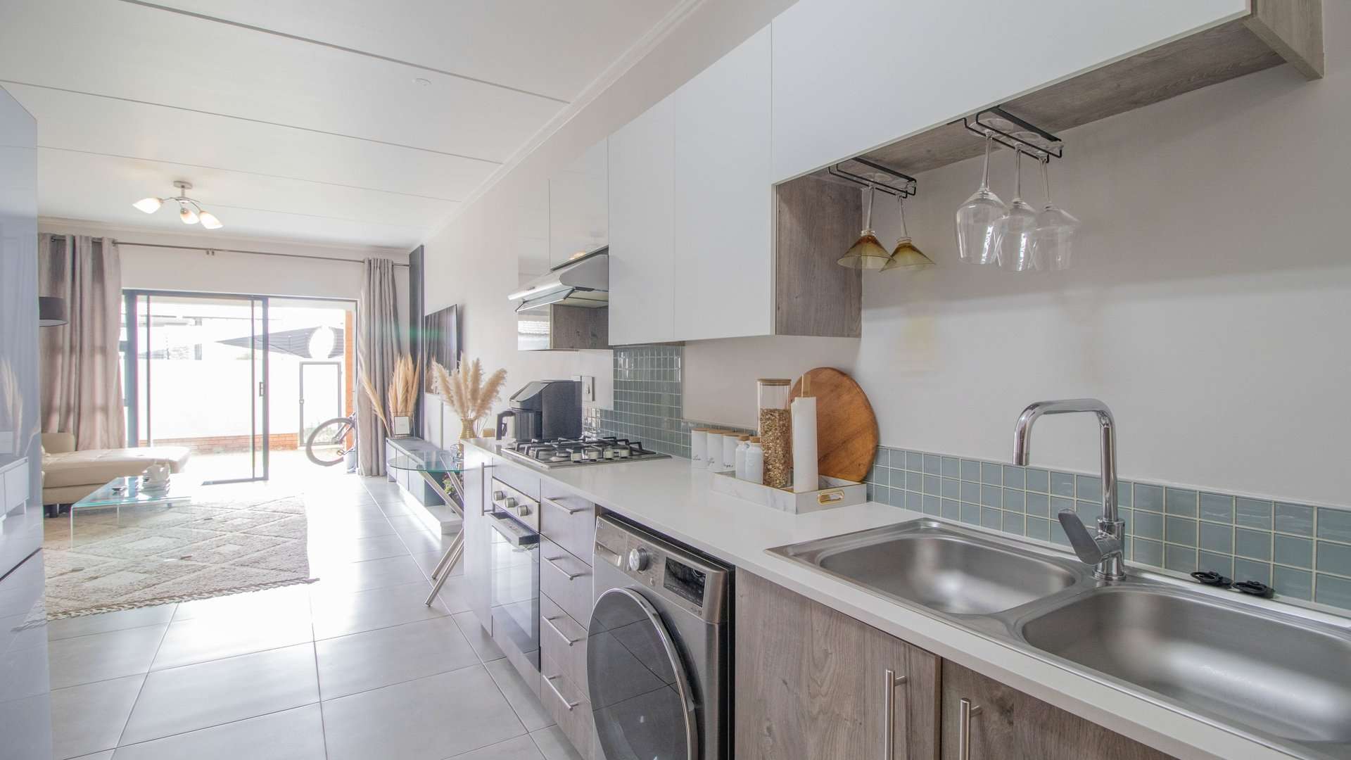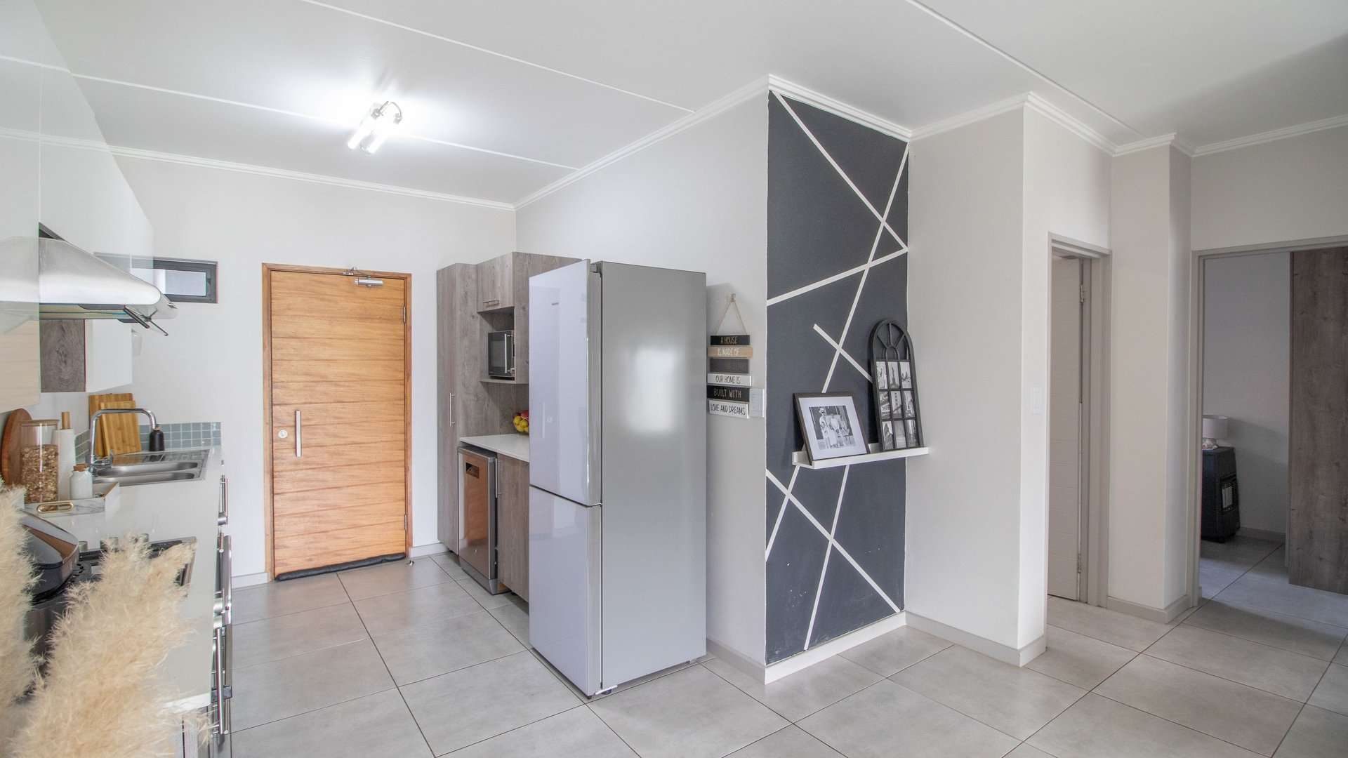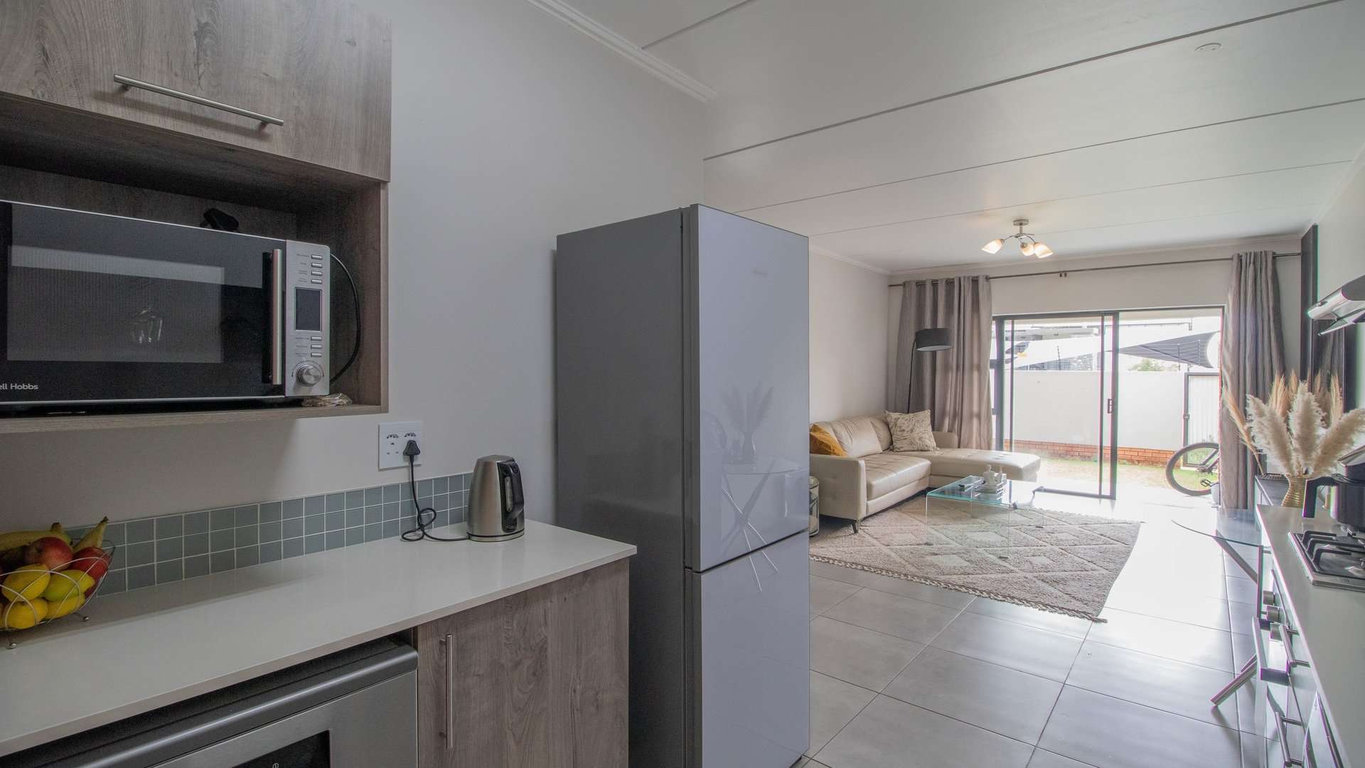 The interior is cozy yet practical, with a spacious living room that leads seamlessly into an open kitchen.