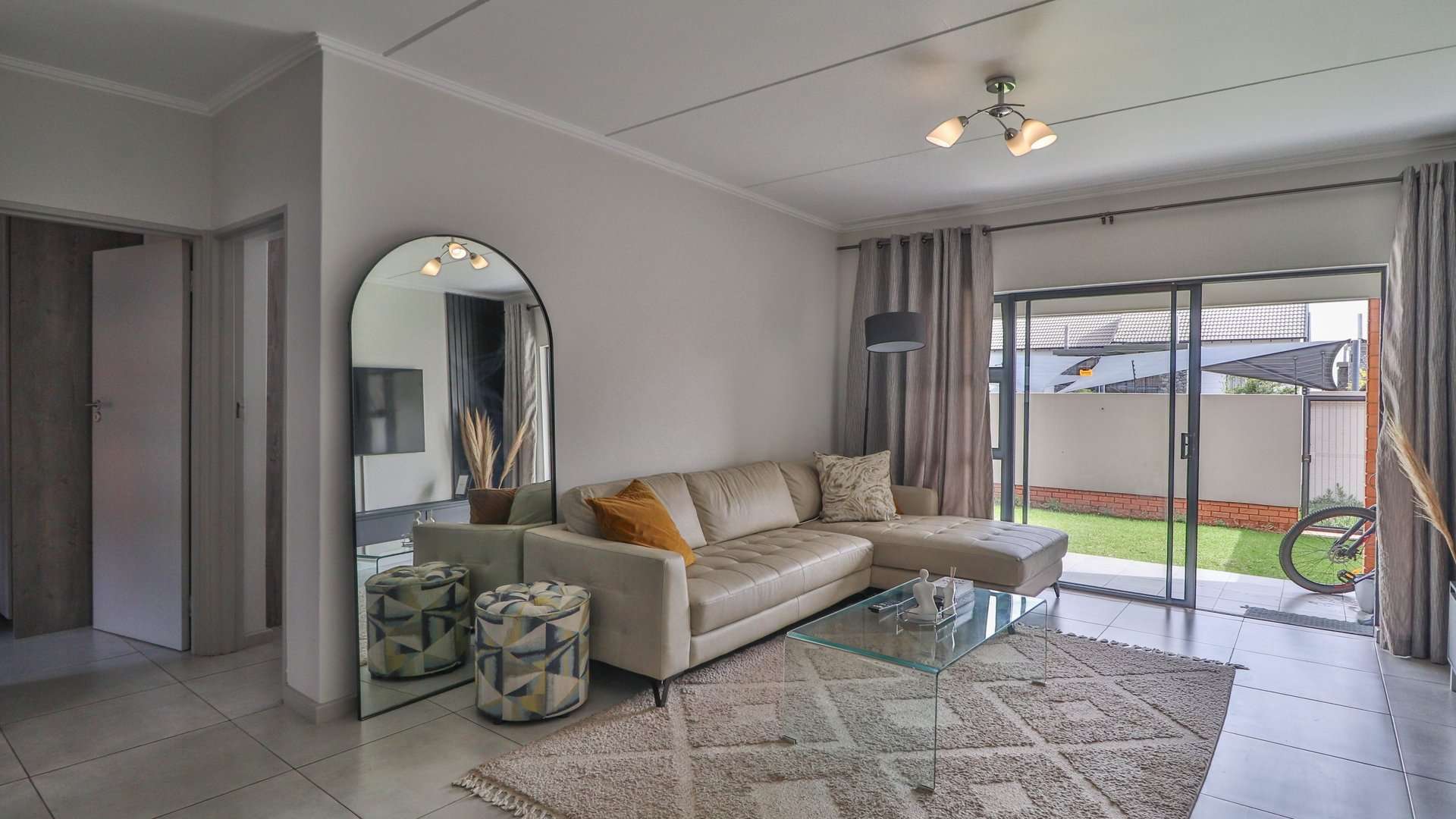 The highlight of this apartment is the garden, which may be accessible through sliding glass doors in the living room.