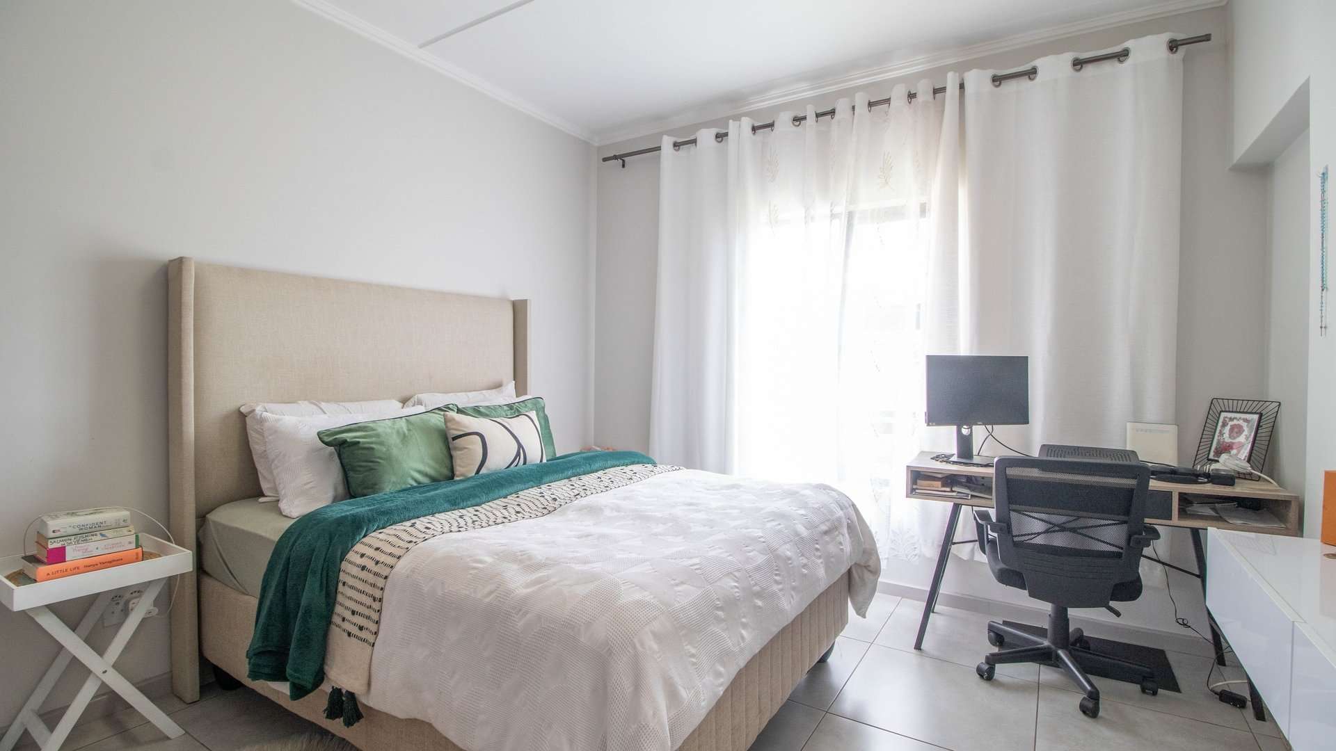 Large windows in the living room and bedrooms allow natural light to flood the rooms, creating a bright, airy atmosphere.