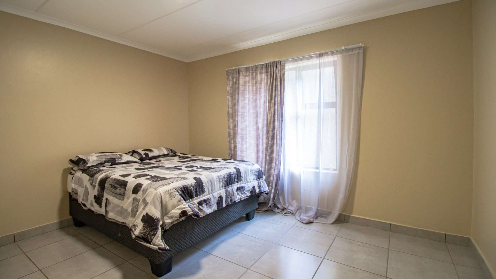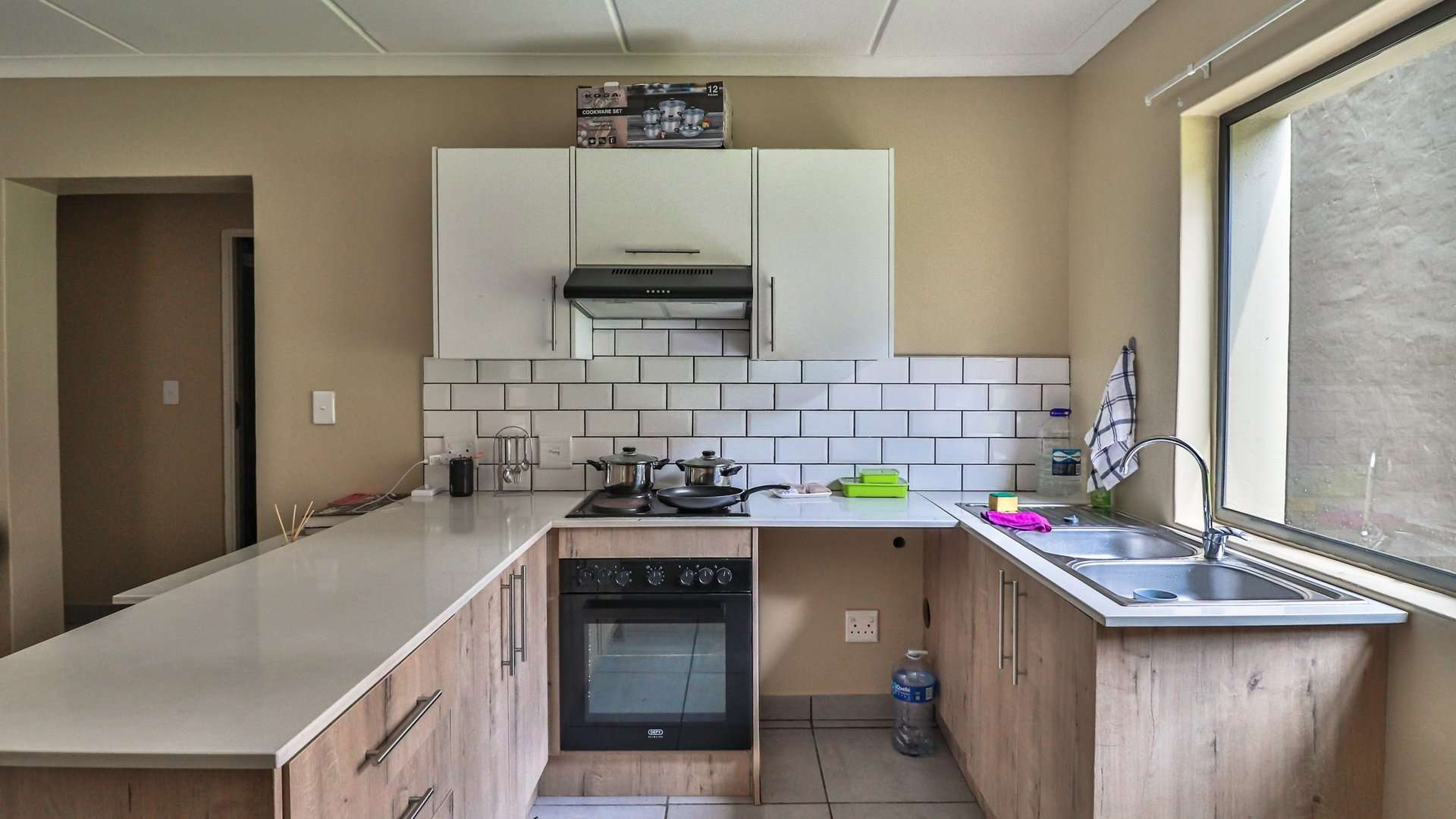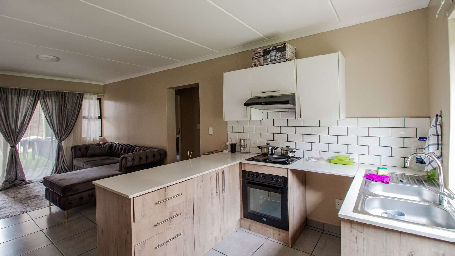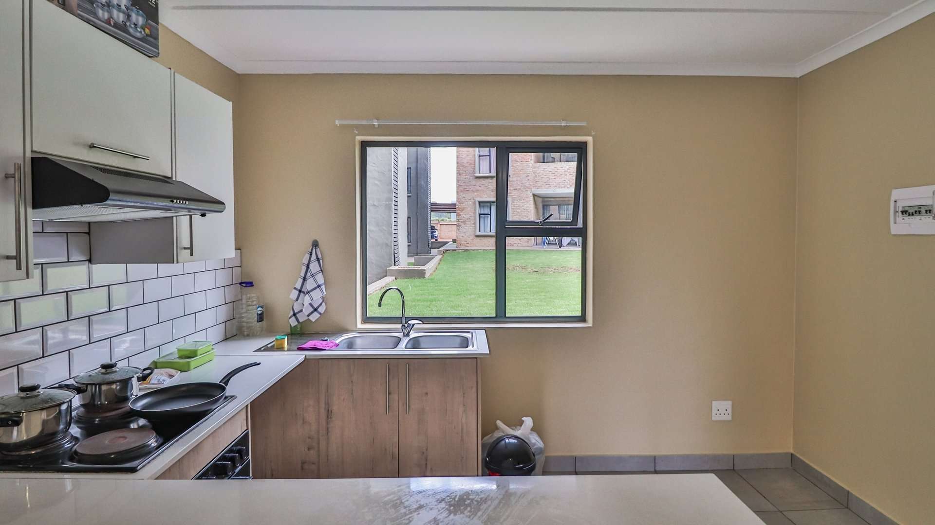The modern kitchen is well-equipped with a double zinc, ample space for a double fridge, front-loader washing machine, as well as a 4-plate stove, oven, and extractor fan, making it ideal for everyday living.