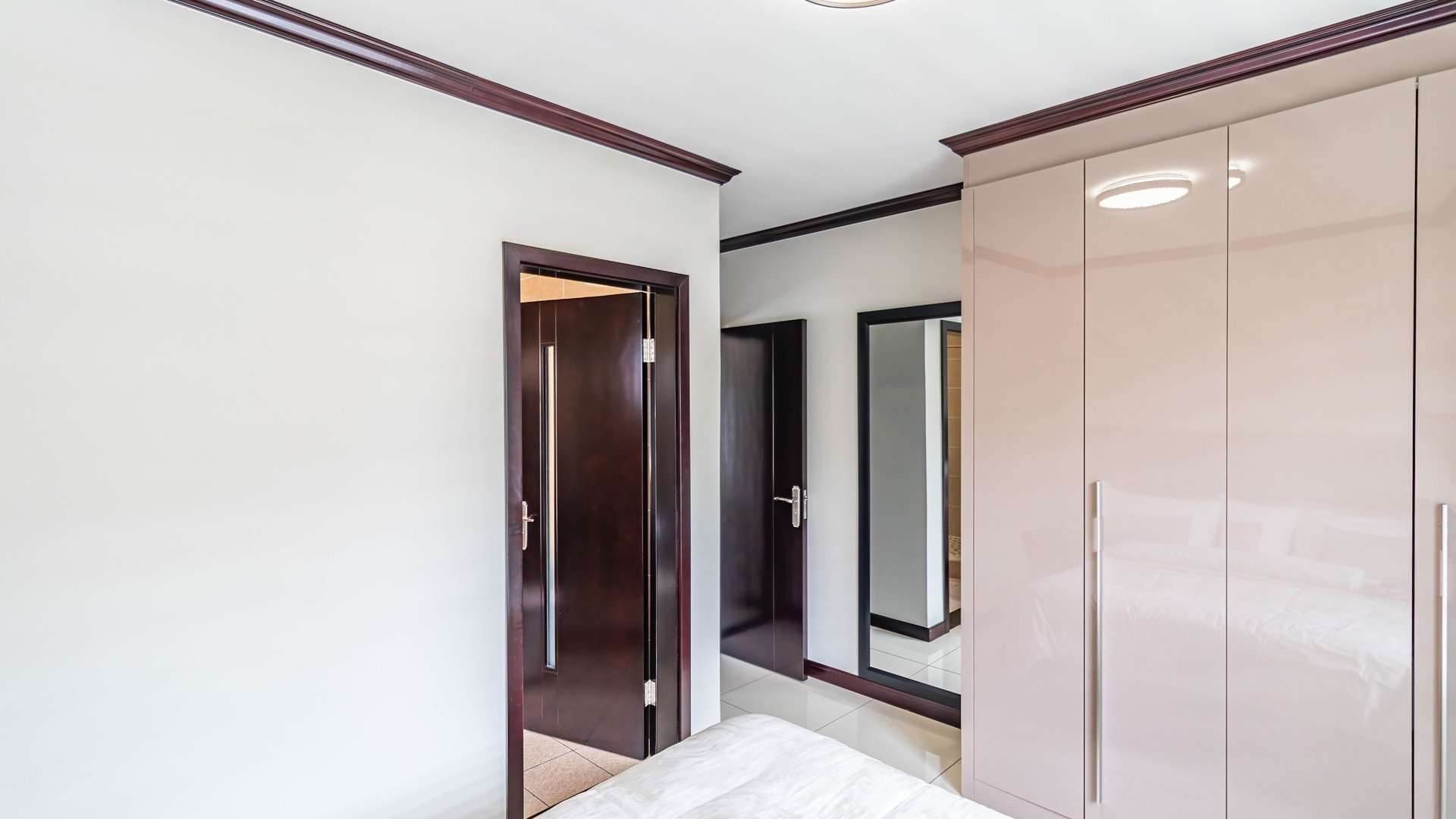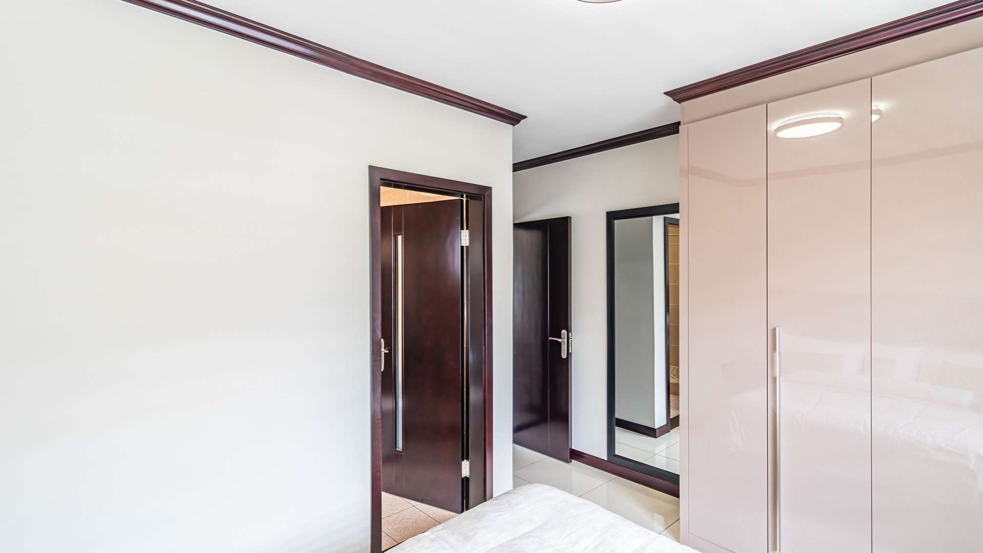 There are two well-sized bedrooms with built-in cupboards. The main bedroom includes an en-suite bathroom with a shower, while the second bathroom is fitted with both a bath and a shower.