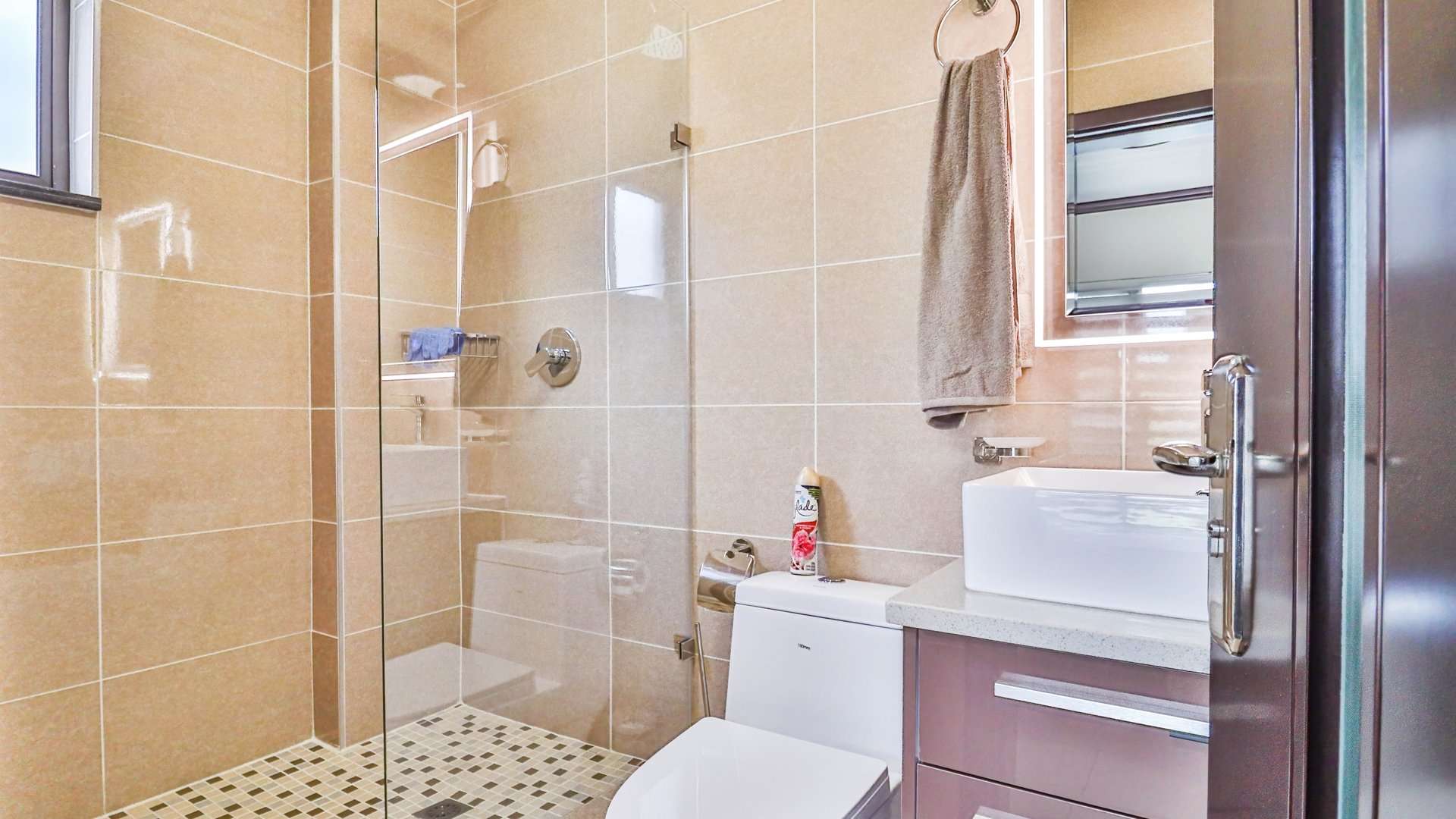 The bathroom mirror is enhanced with an additional lighting feature, adding a modern touch.