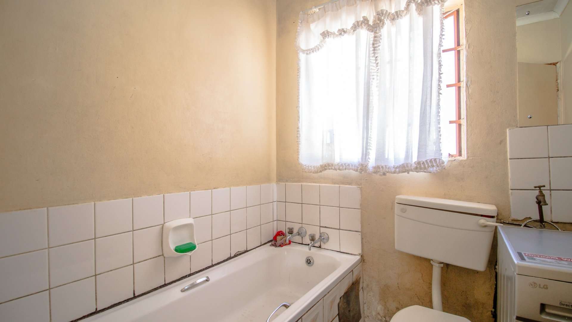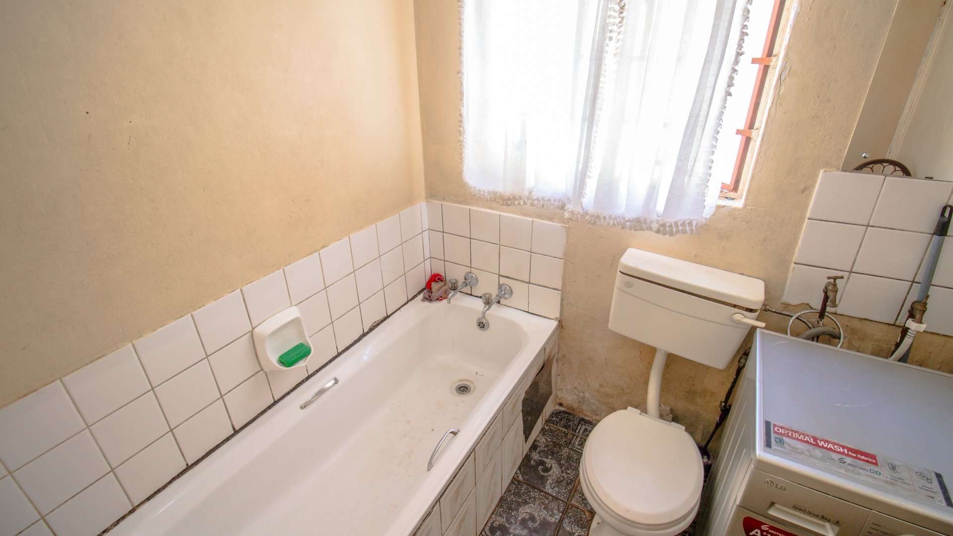 The spacious bathroom features a bathtub, with ample room to fit a washing machine—perfect for your daily needs.
