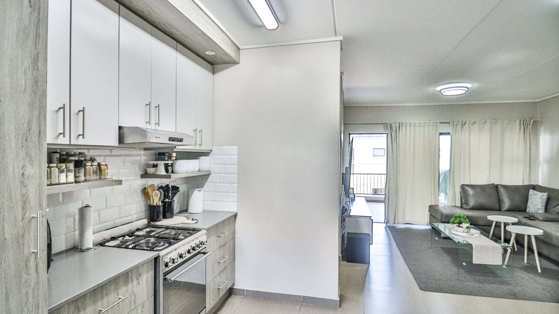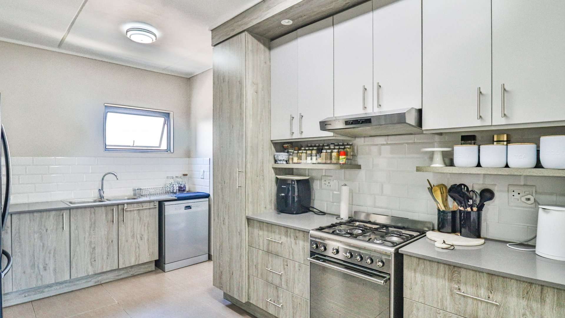 The well-appointed kitchen features modern cabinetry, high-end finishes, and extra cupboard space in the scullery area, making it as functional as it is stylish.