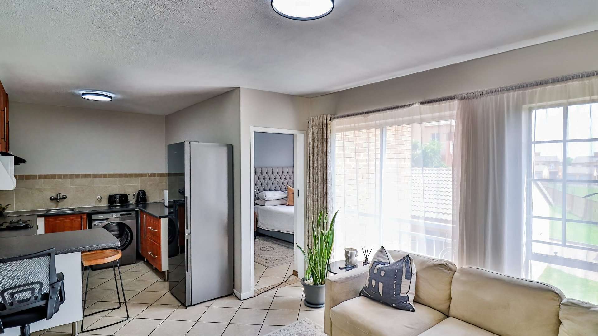 · A spacious lounge design with tiled flooring encompassing a modern kitchen perfect for entertaining guests and daily living. Inviting space ideal for relaxation.