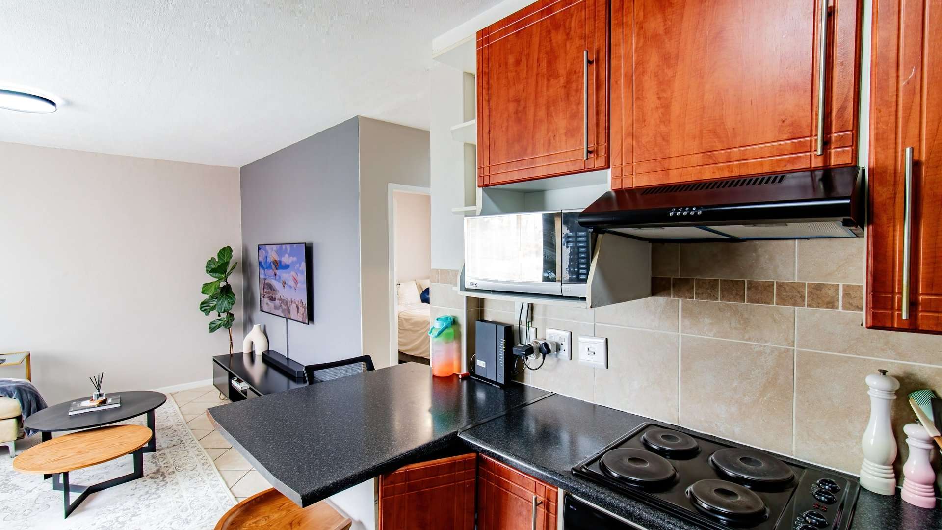· Contemporary kitchen with granite countertops, built-in cupboards & under-counter space for appliances—perfect for effortless meal prep. A convenient breakfast nook, ideal for casual dining or morning coffee.