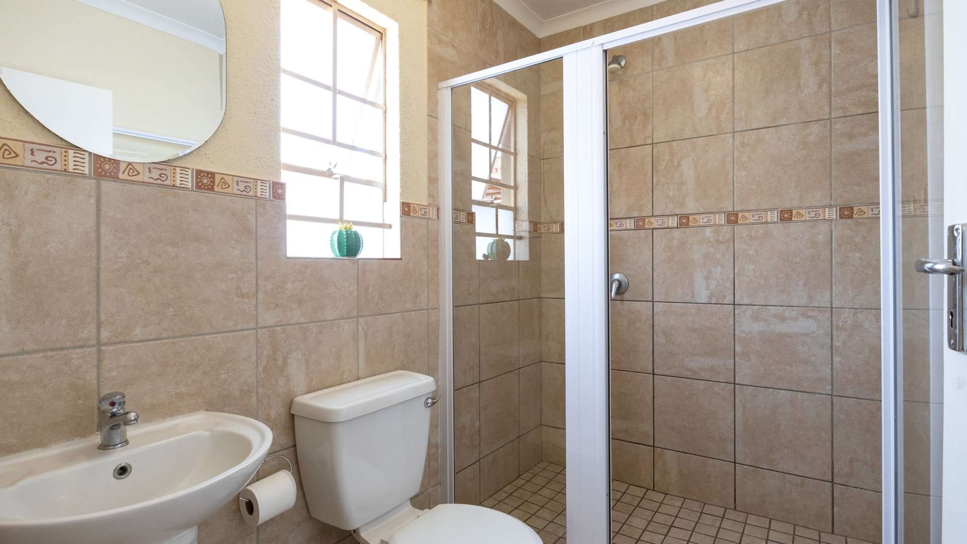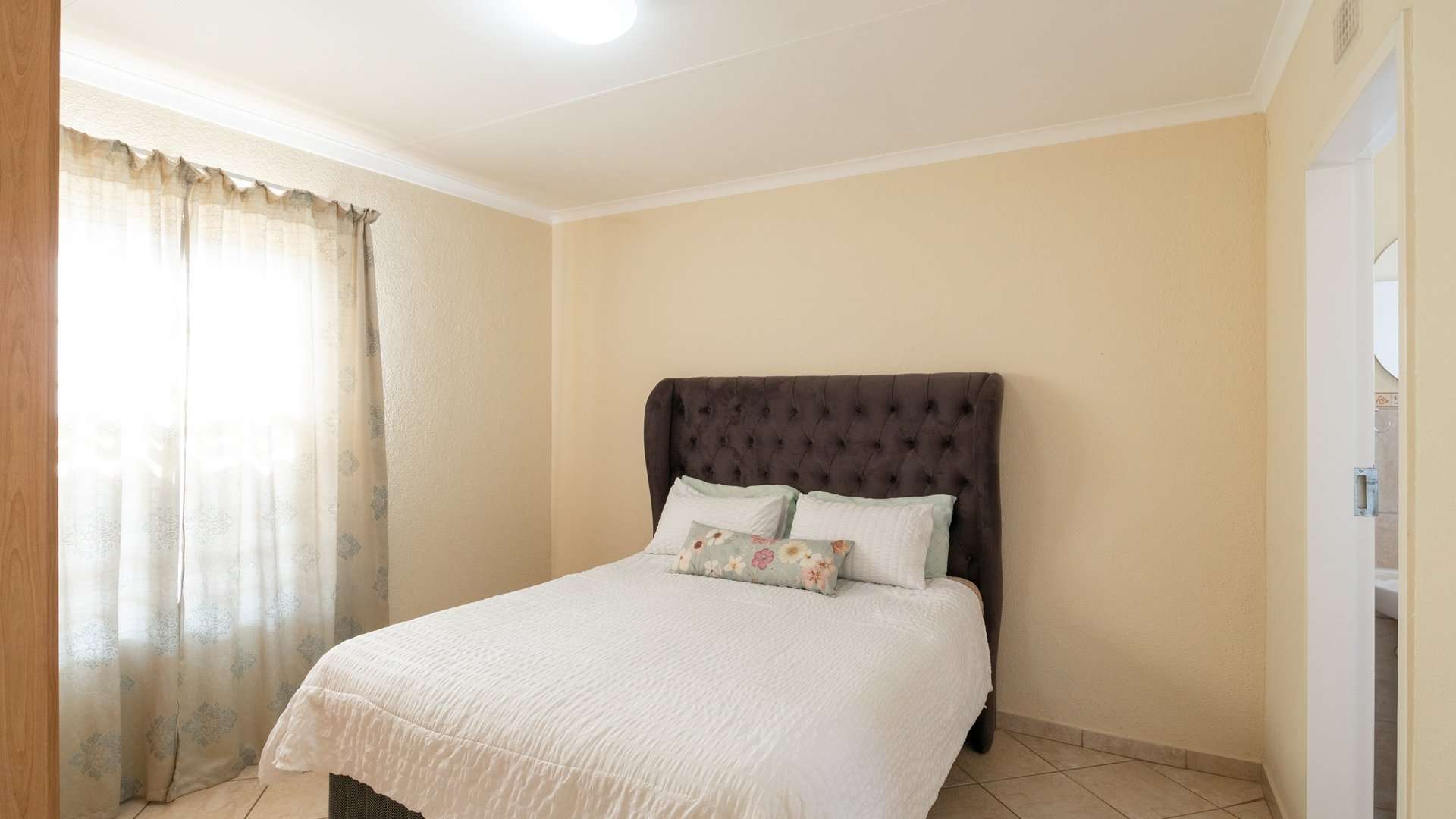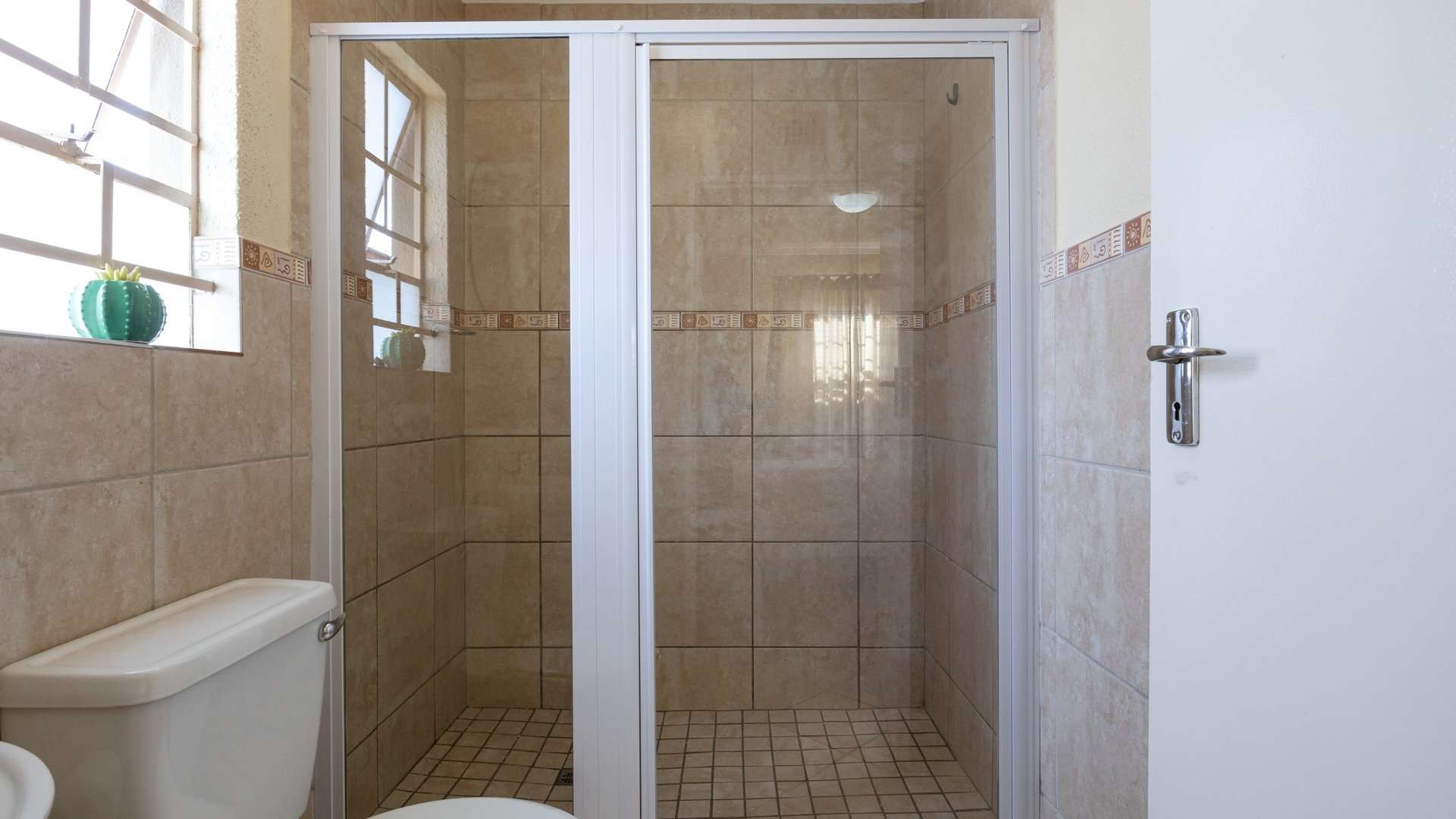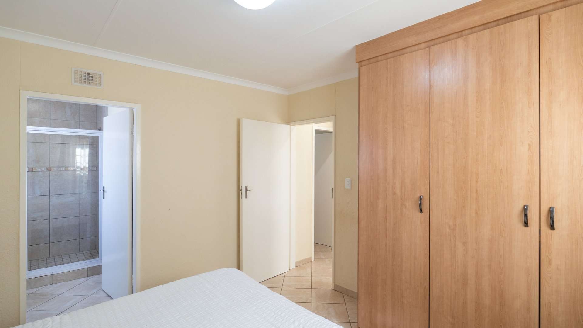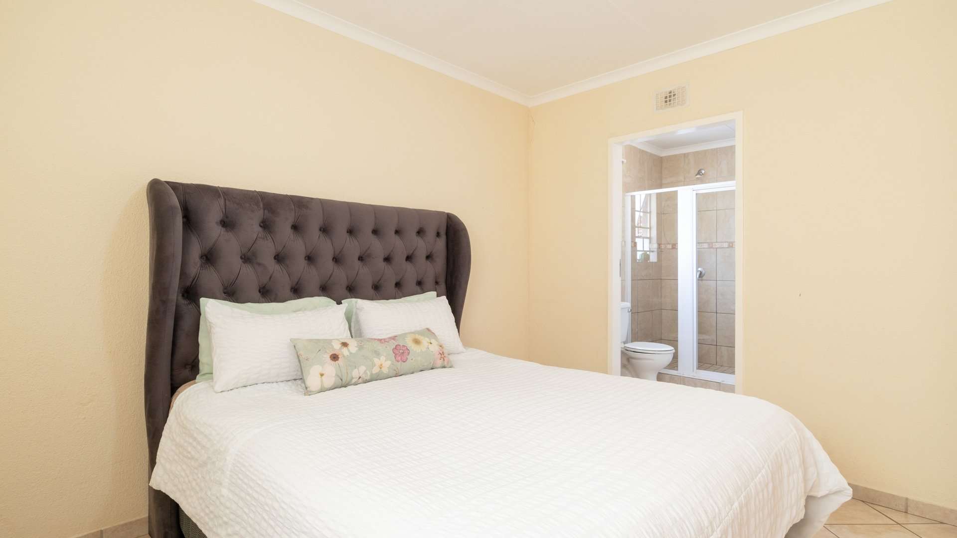 The main bedroom features built-in cupboards and a private en-suite with a shower for added comfort.