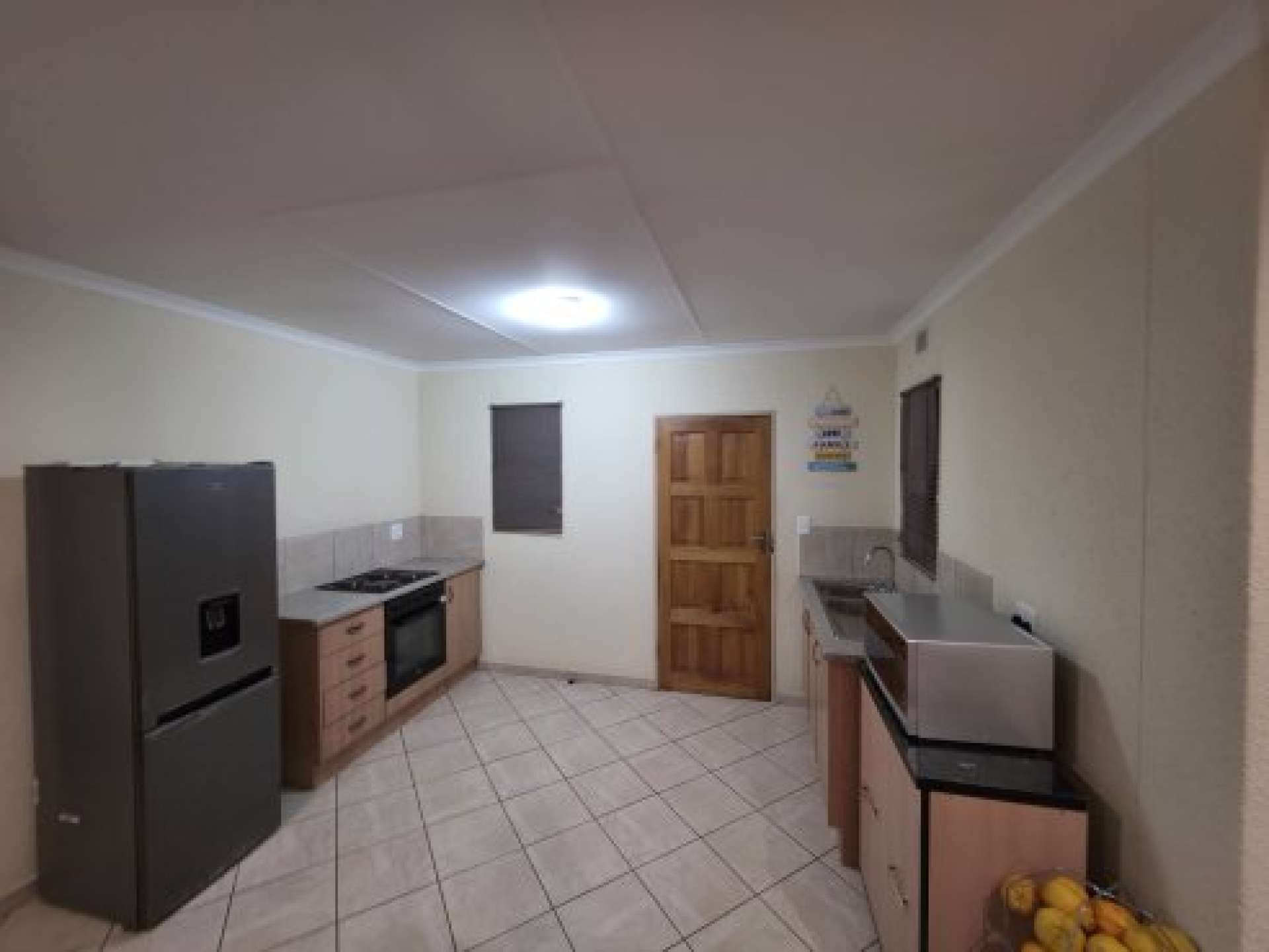 The home features a functional kitchen fitted with built-in cupboards, offering plenty of storage and workspace.