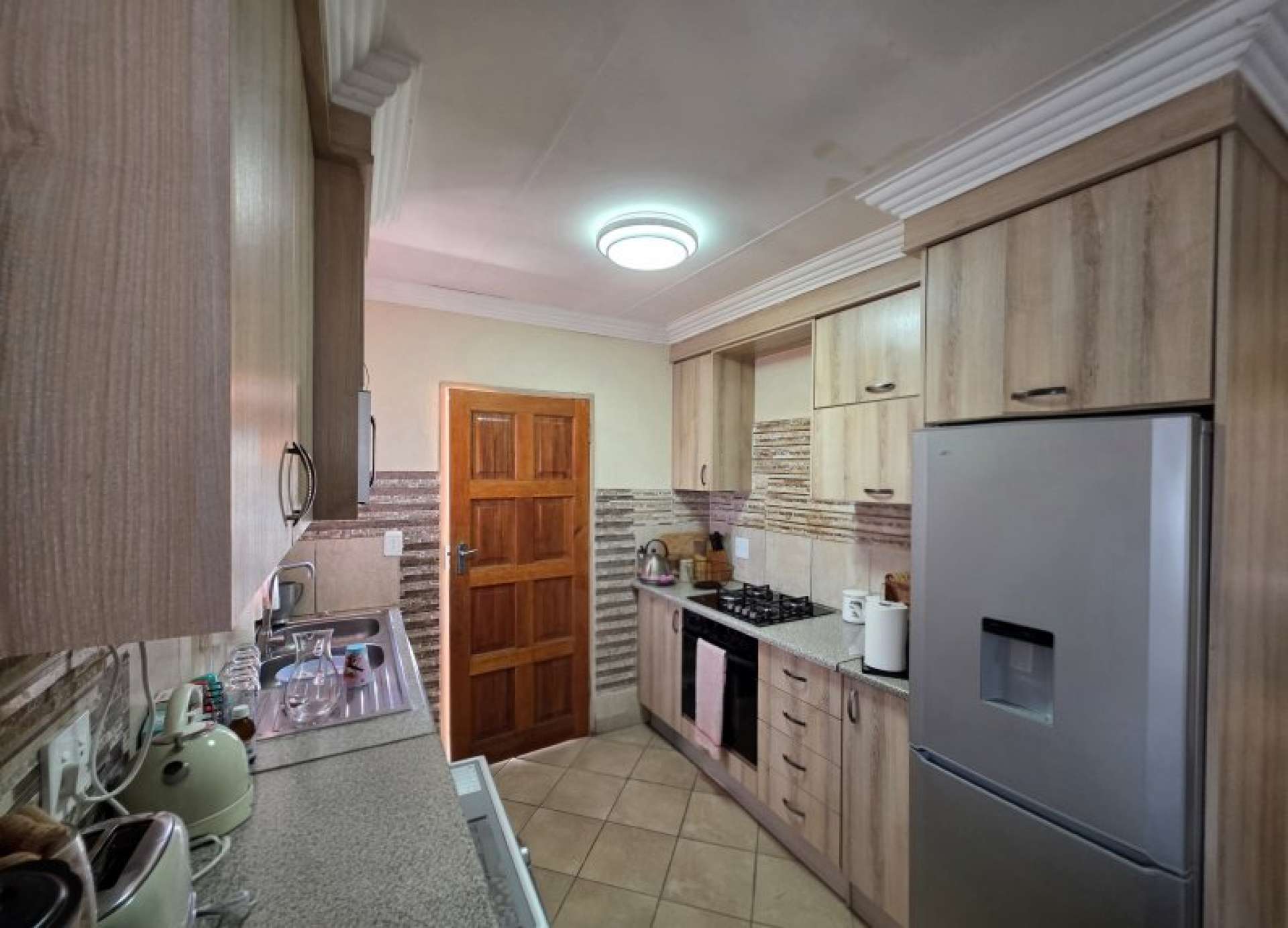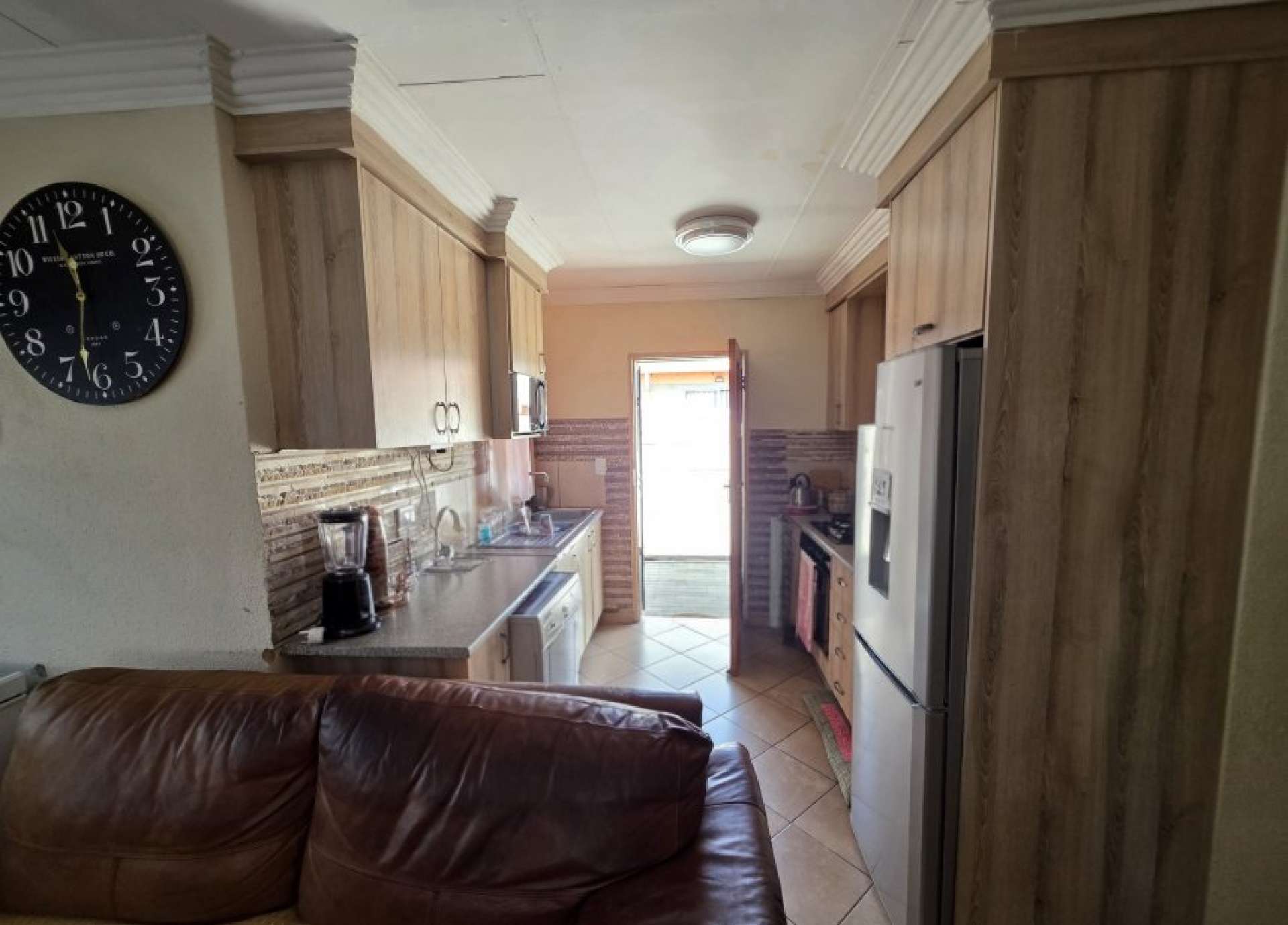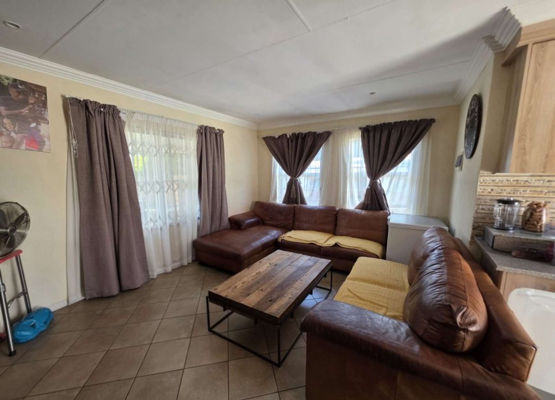 The home boasts a spacious lounge that seamlessly connects to a well-equipped kitchen, complete with ample built-in cupboards and a gas stove—perfect for efficient and enjoyable cooking.