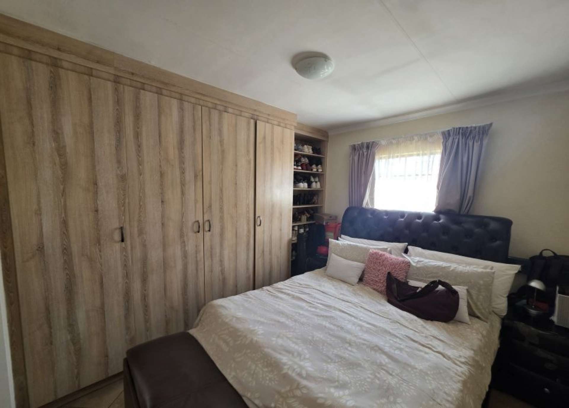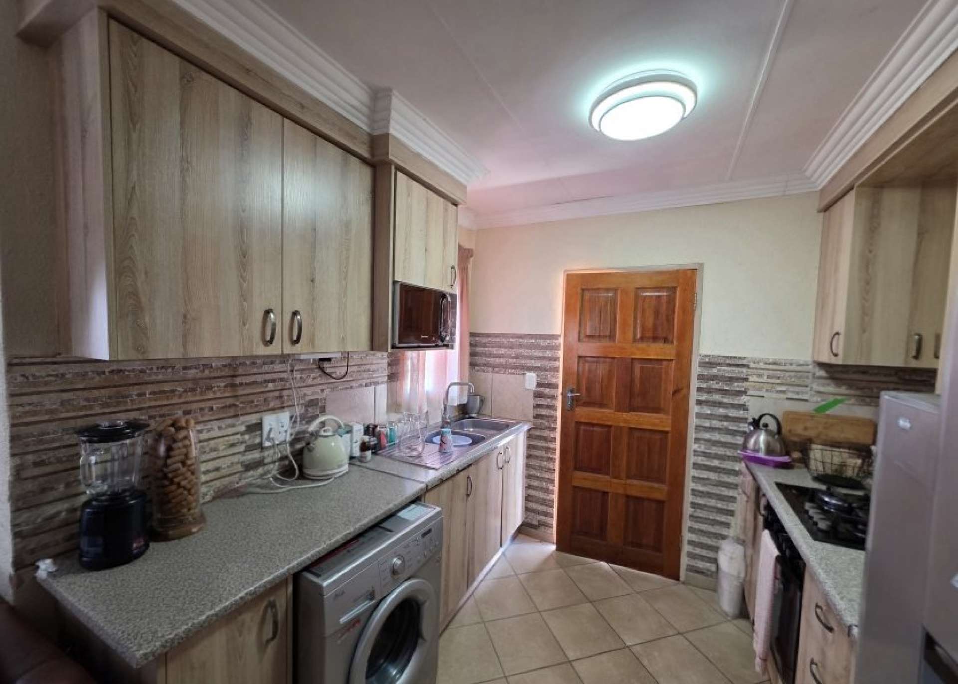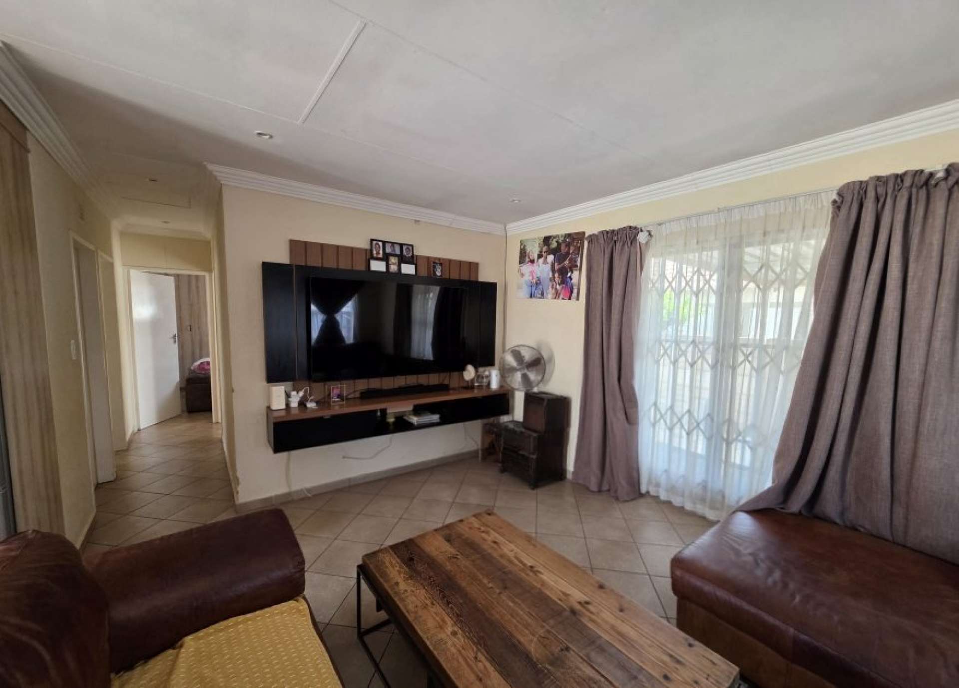 The home boasts a spacious lounge that seamlessly connects to a well-equipped kitchen, complete with ample built-in cupboards and a gas stove—perfect for efficient and enjoyable cooking.