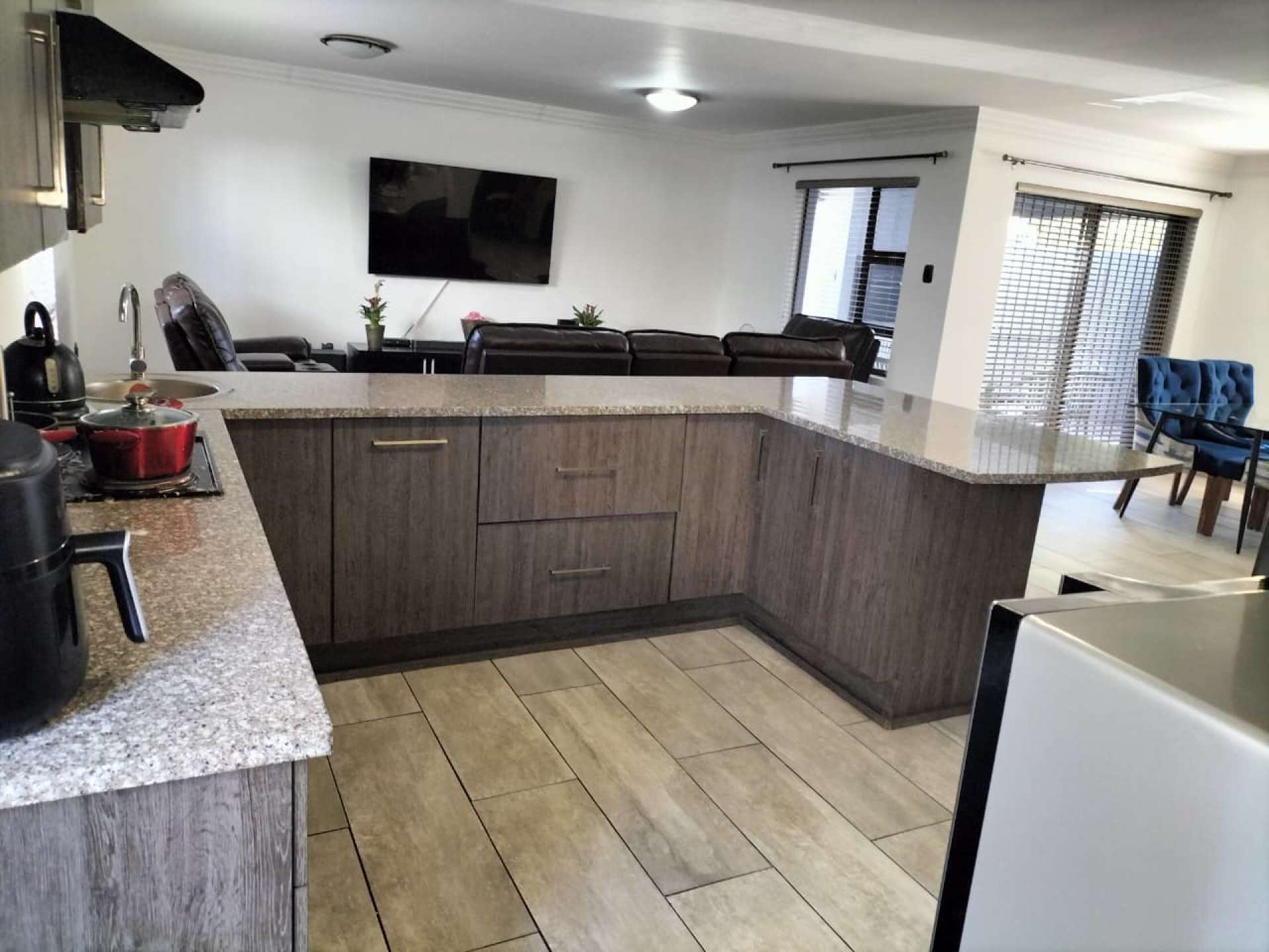 The open-plan layout includes ample built-in cupboards, a pantry, and an electric stove, combining style with functionality.