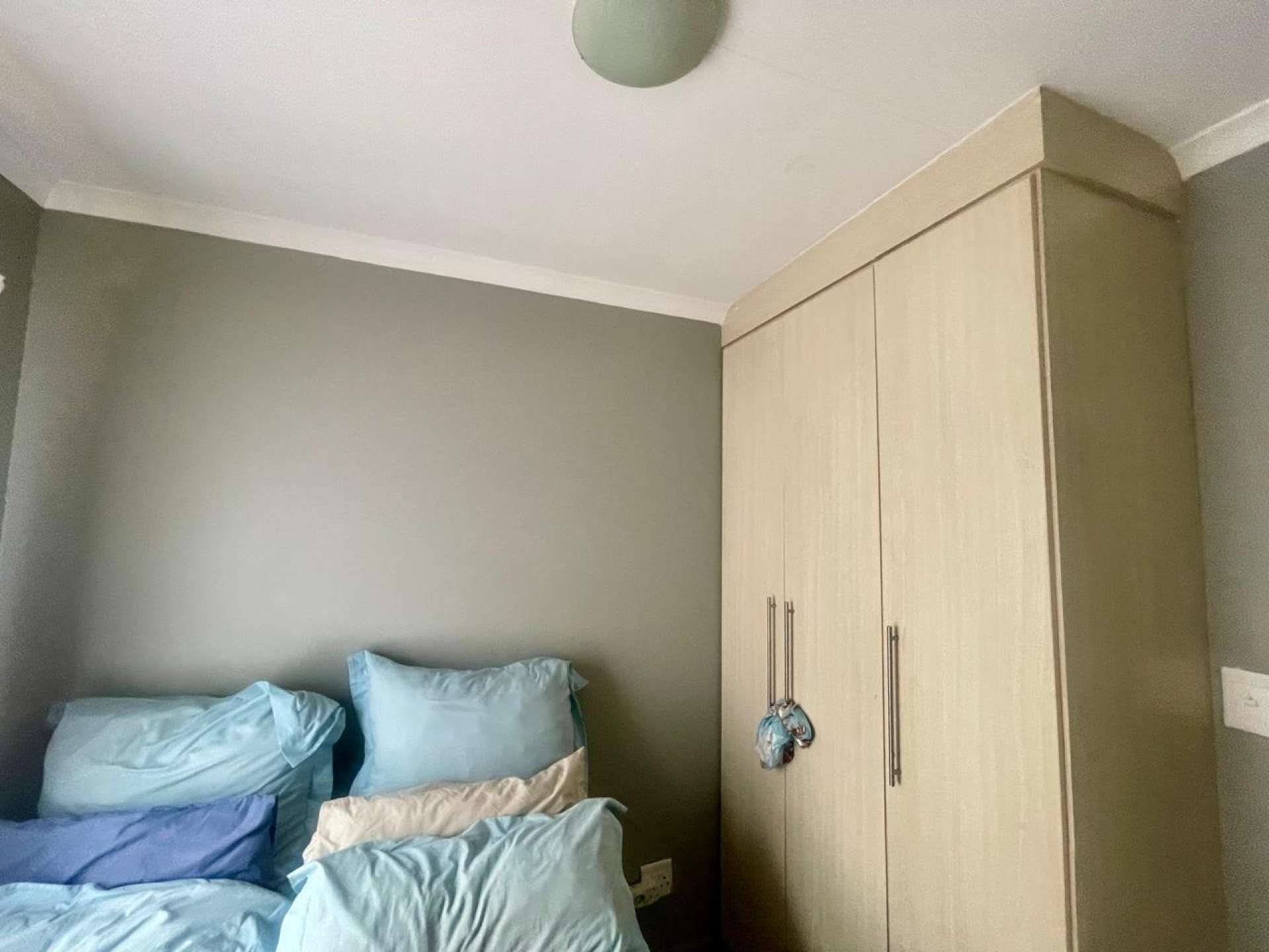 The kitchen is fitted with built-in cupboards, offering ample storage and functionality.