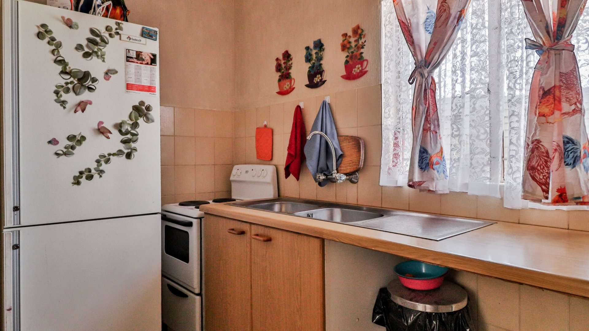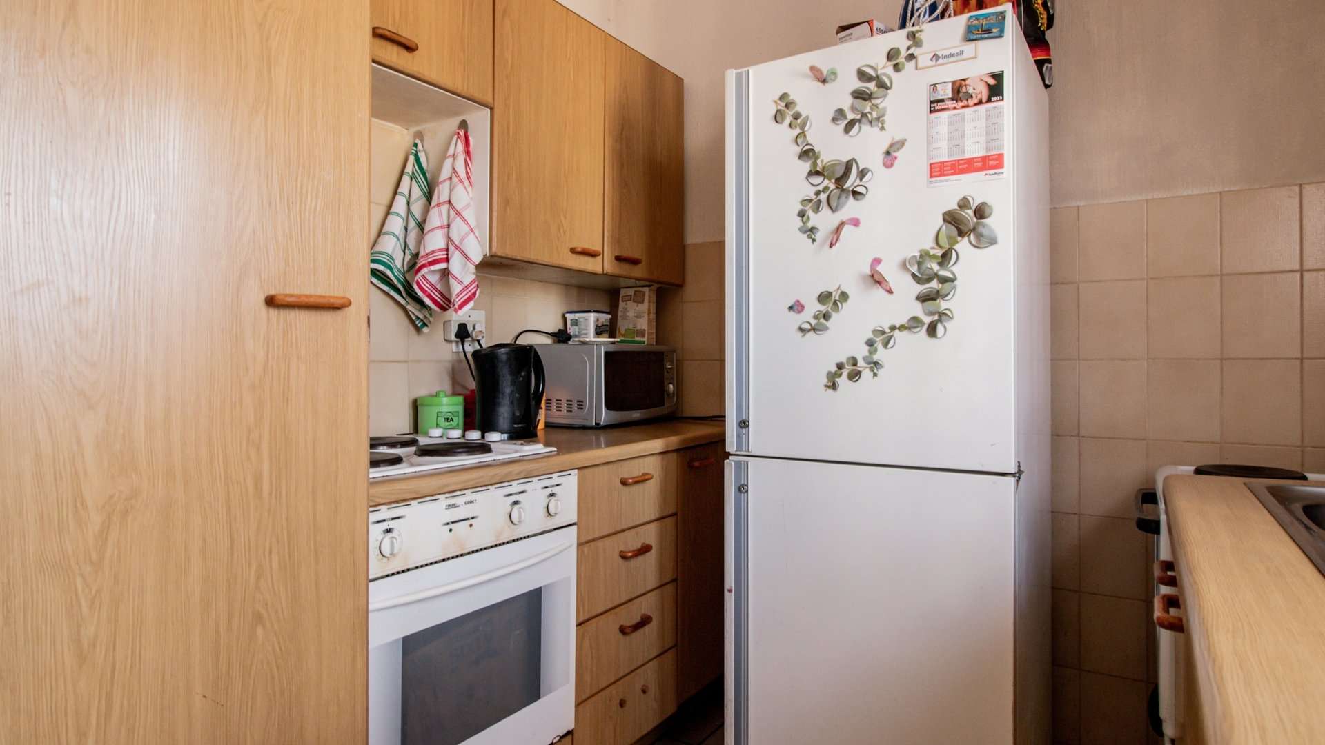 Neat kitchen with ample cupboard space and room for 2–3 appliances