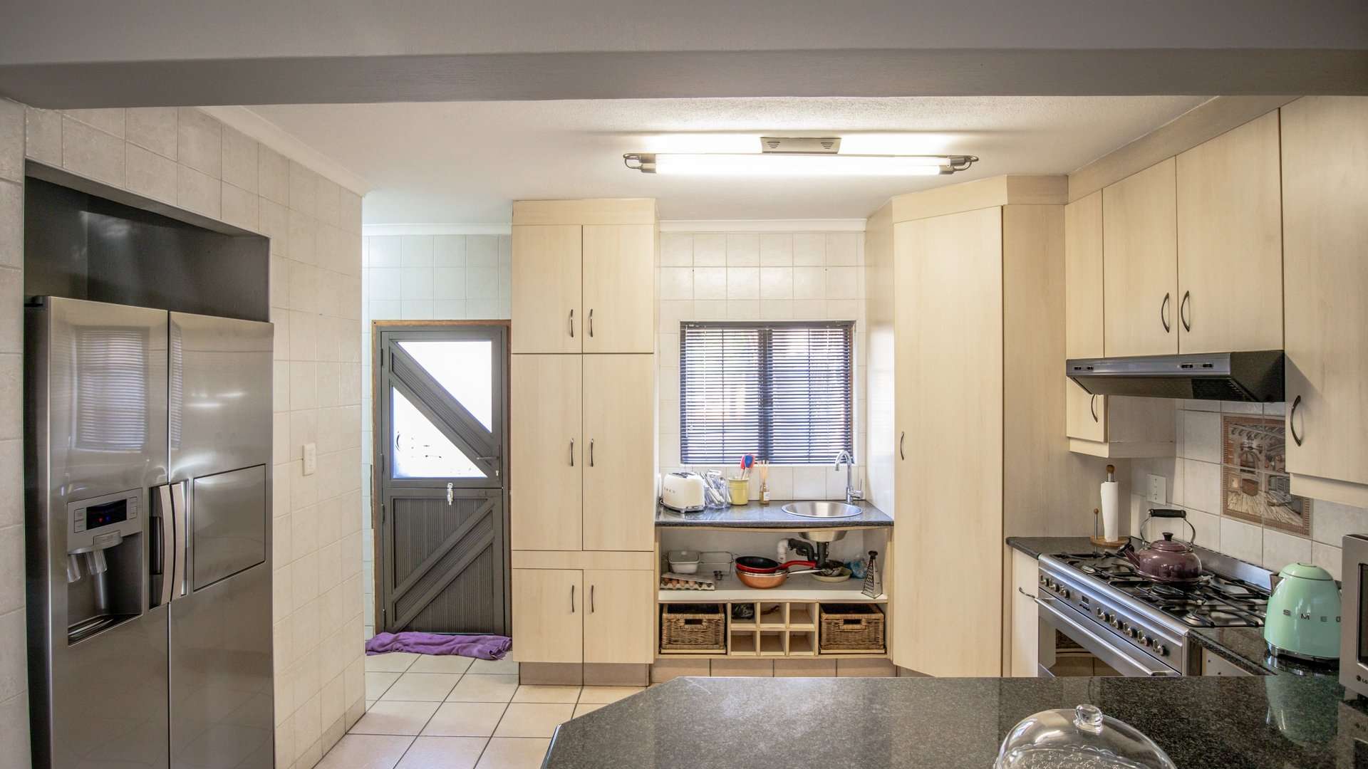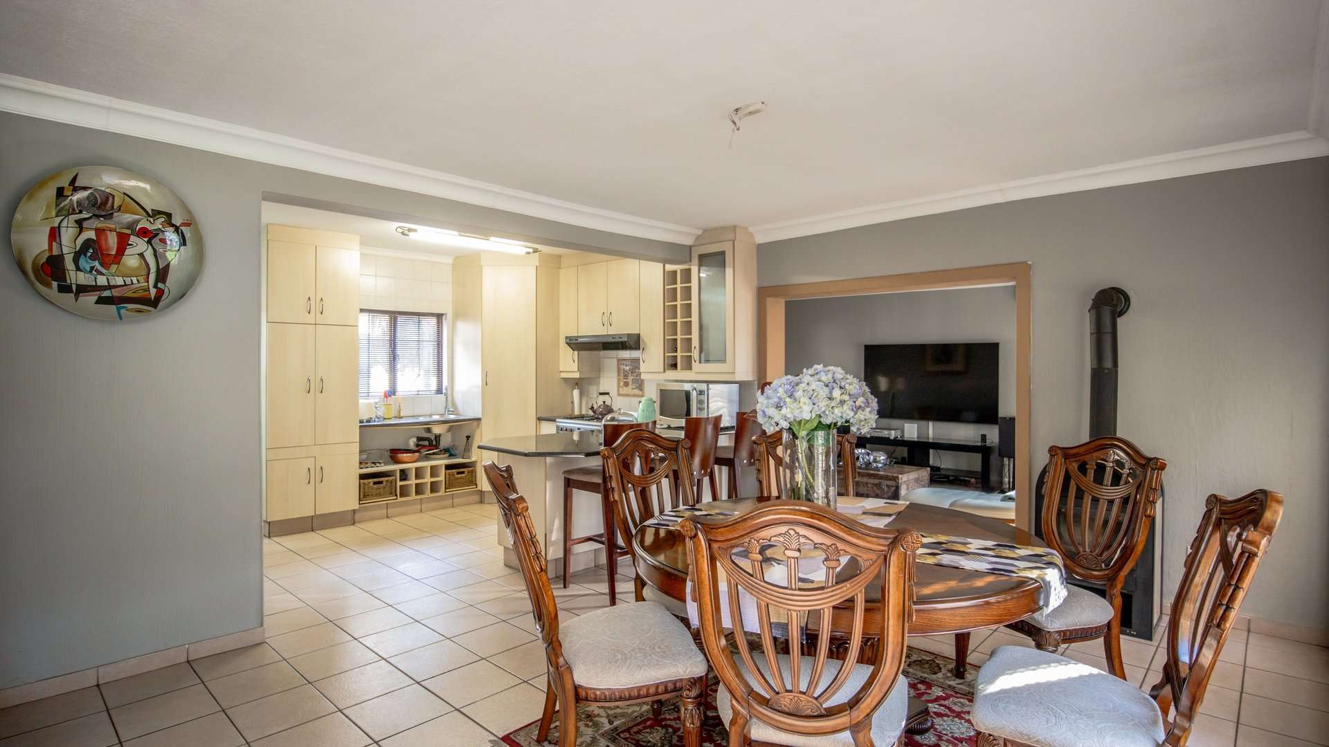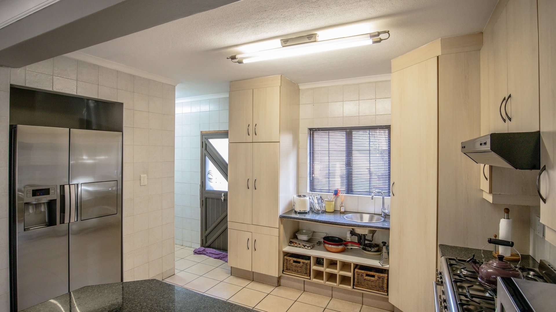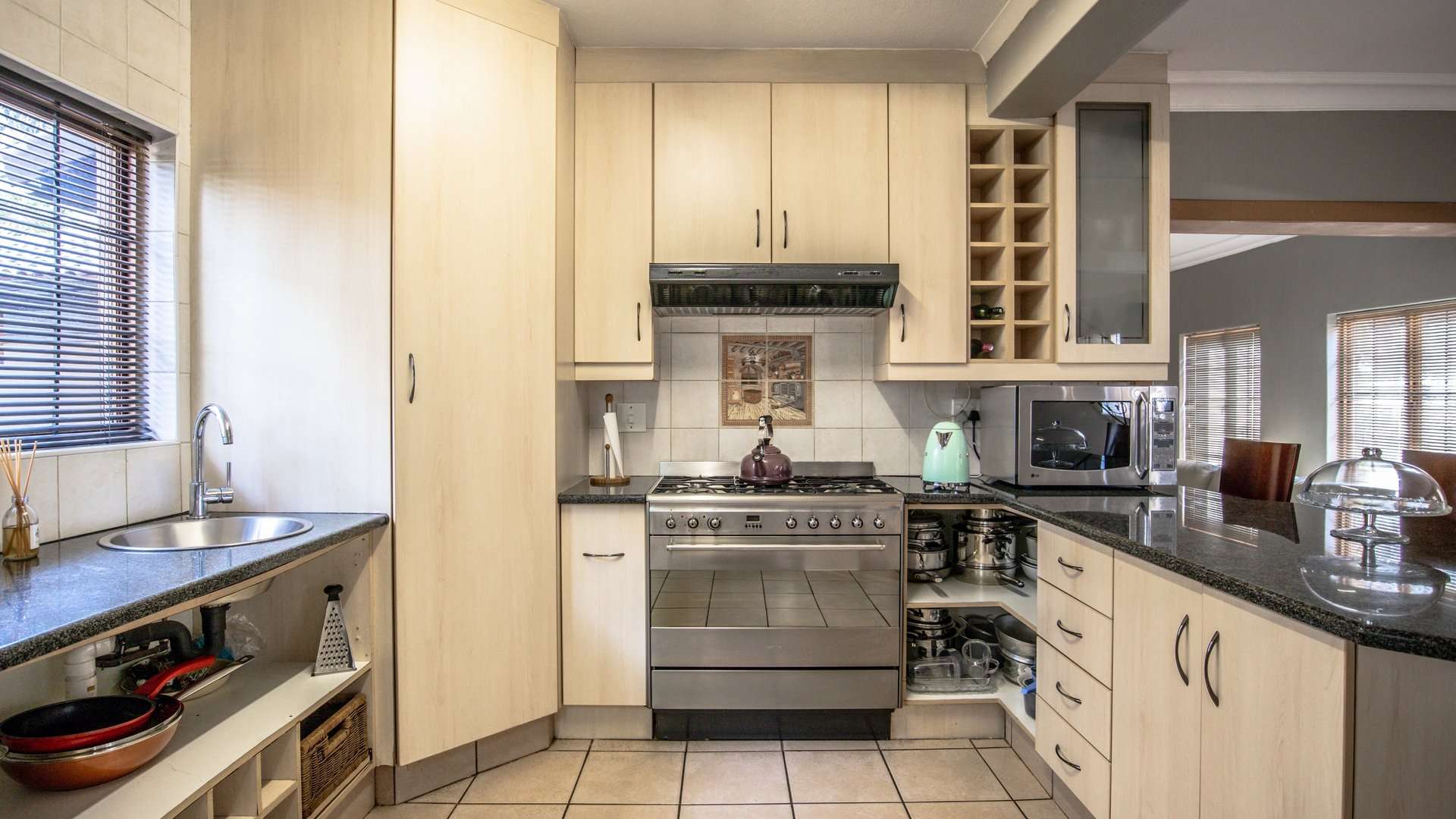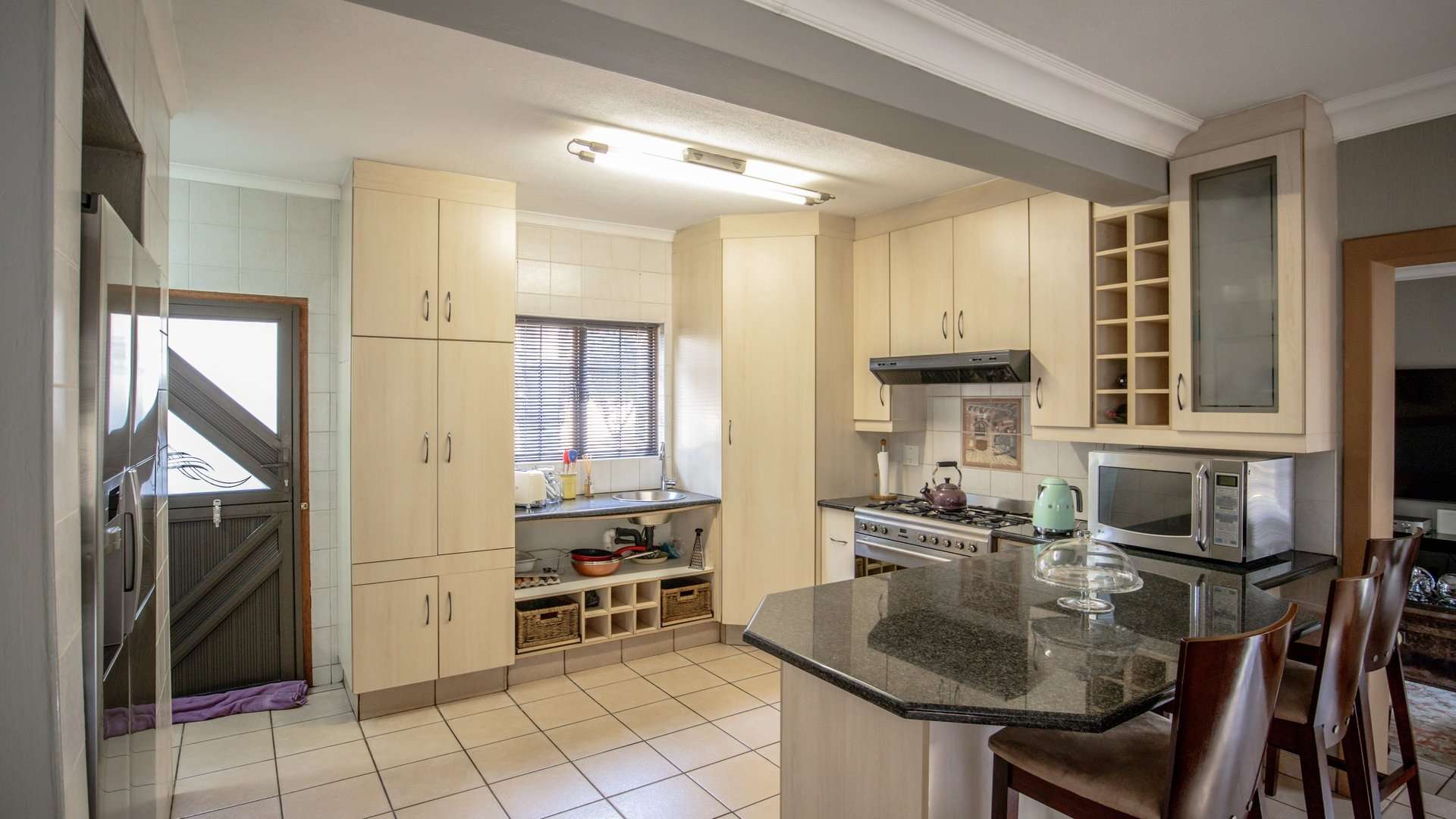 The modern open-plan kitchen is equipped with a gas stove, ample built-in cupboards, and a separate scullery for added convenience.