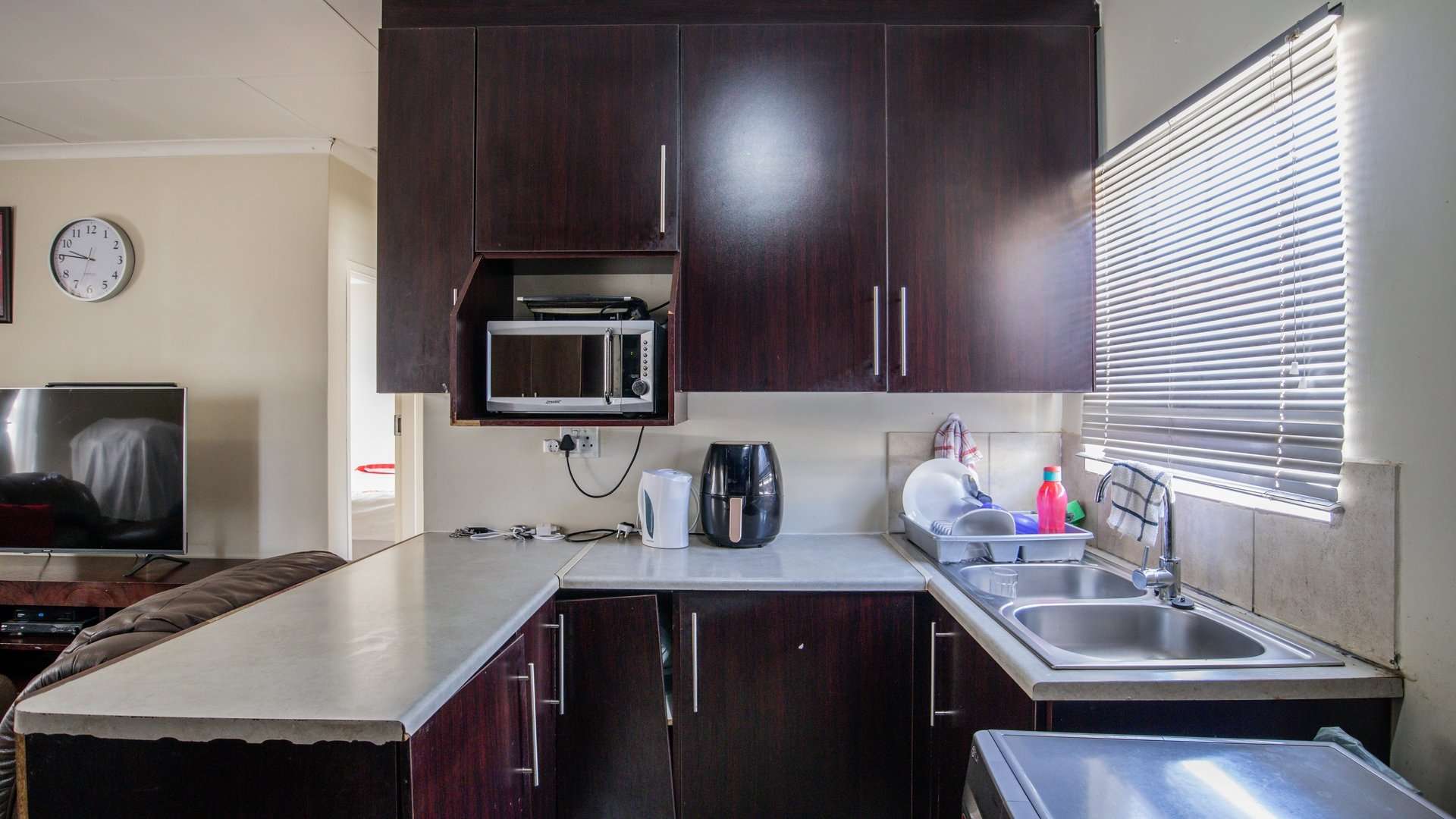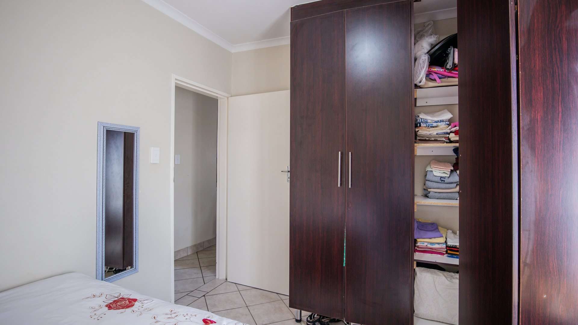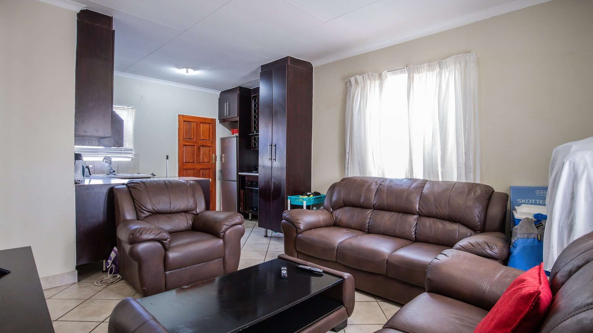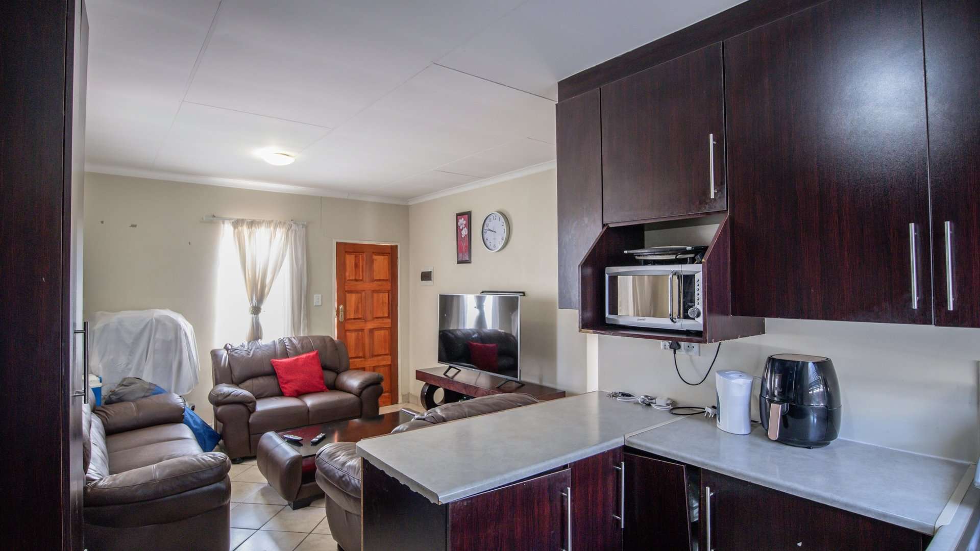 A warm and welcoming lounge creates the perfect setting to relax or entertain guests. Both bedrooms are fitted with built-in cupboards, offering ample space and convenience.