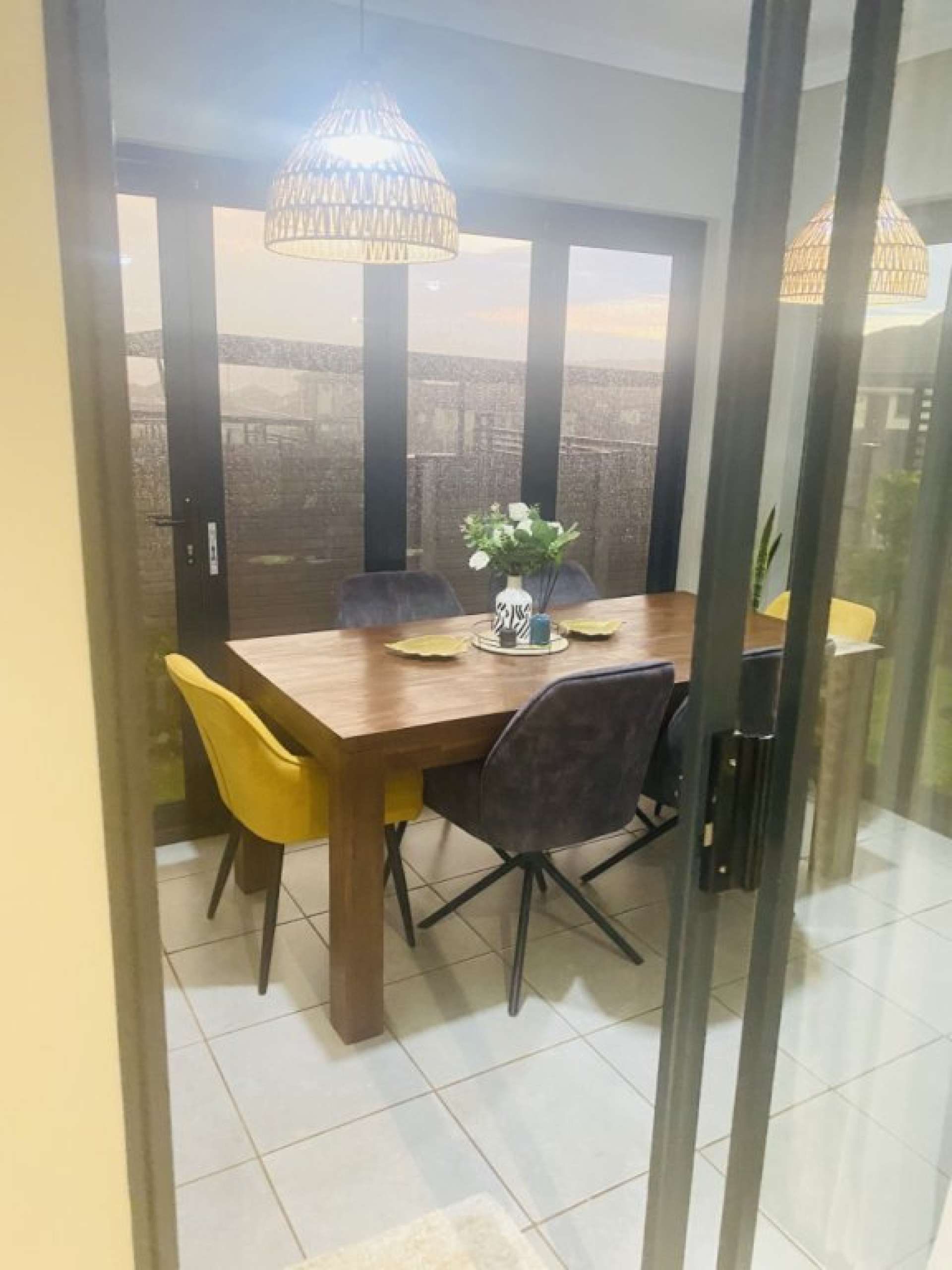 The patio is converted to a dining room with aluminium folding doors.
