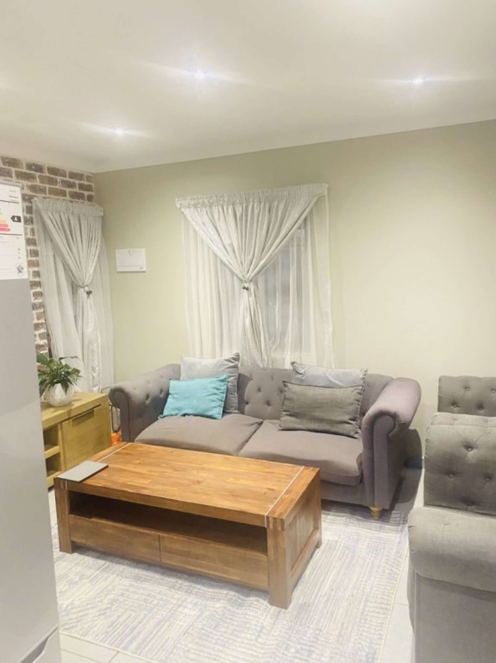 The lounge connects seamlessly to the kitchen, which features built in cupboards and added space for cupboards.