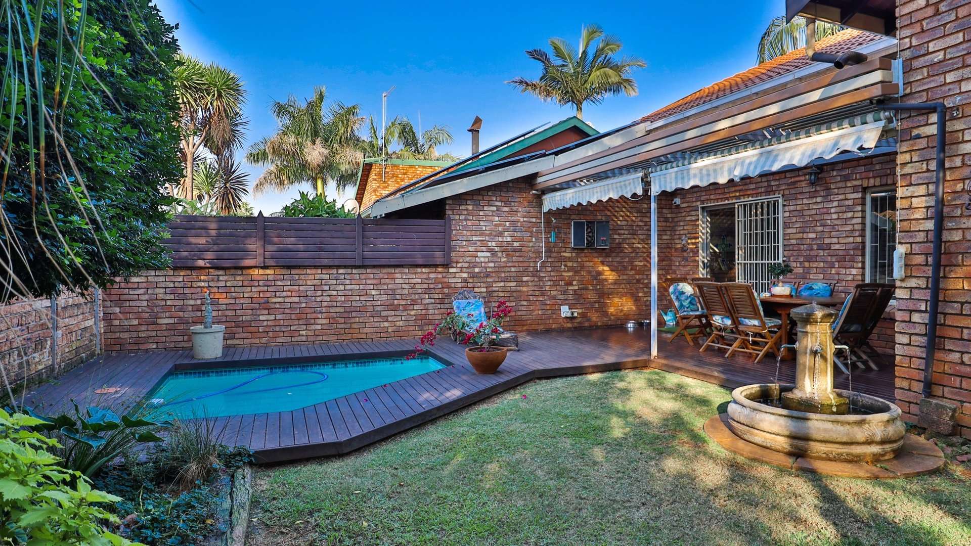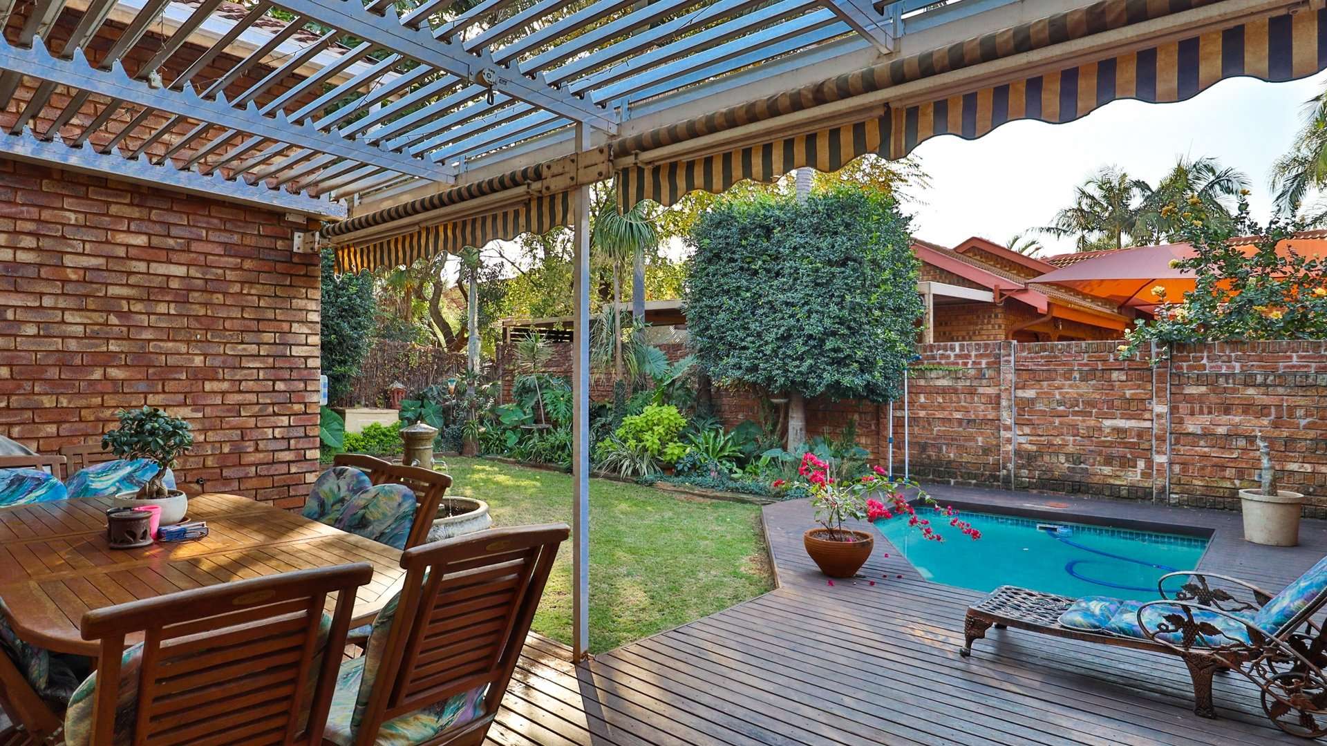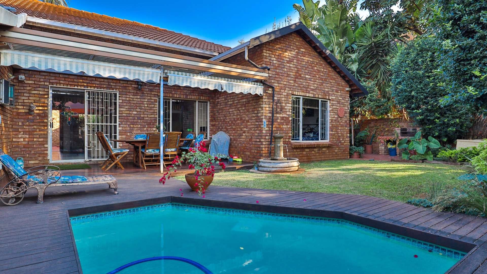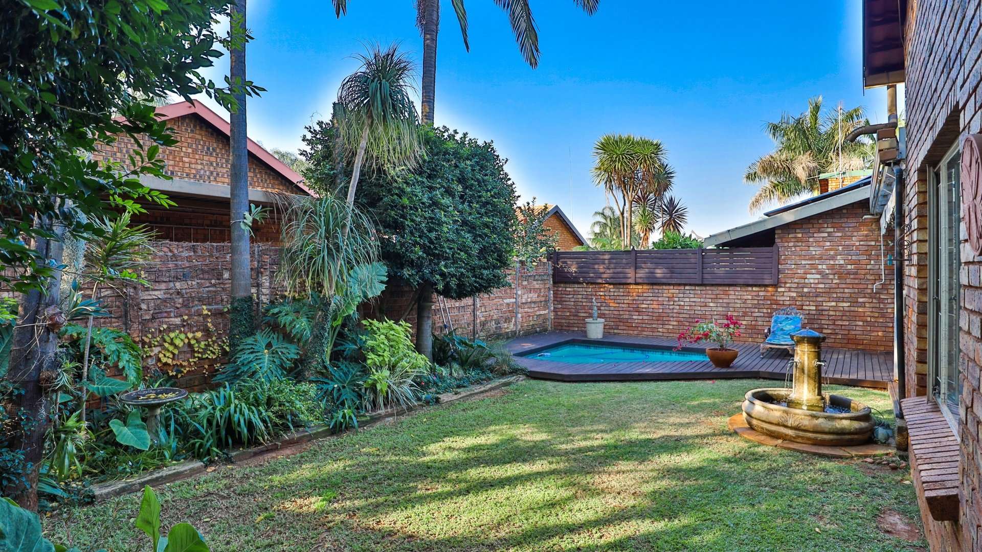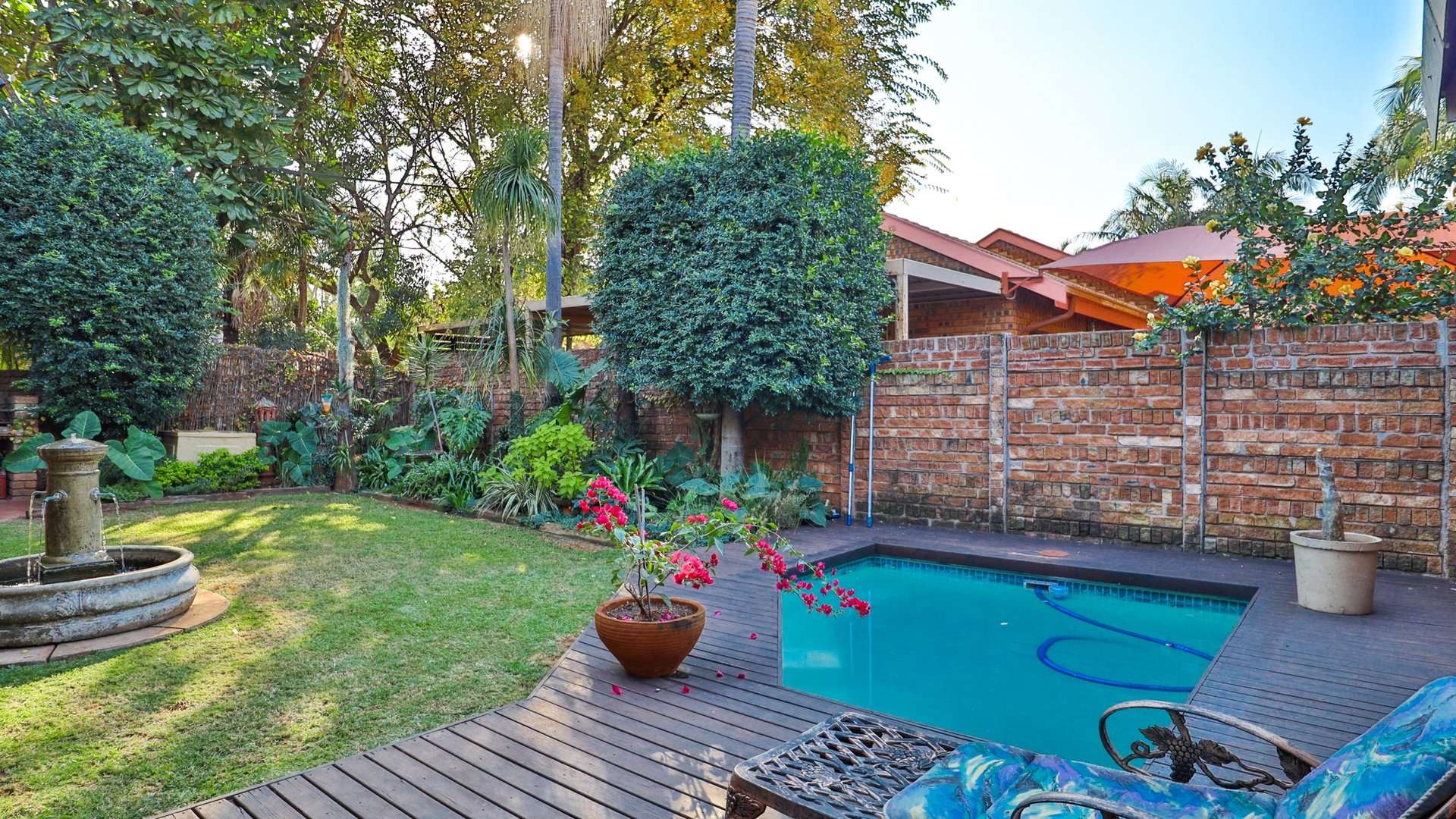 Sparkling pool surrounded by a lush, manicured garden