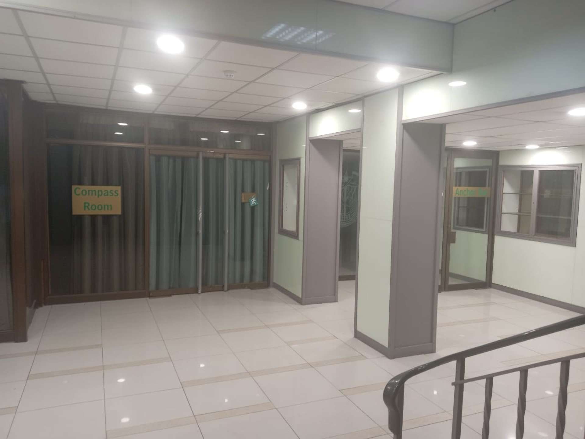 The property features a three-story layout including a ground floor with reception, library, two kitchens, two bar/lounge areas, and a conference room.