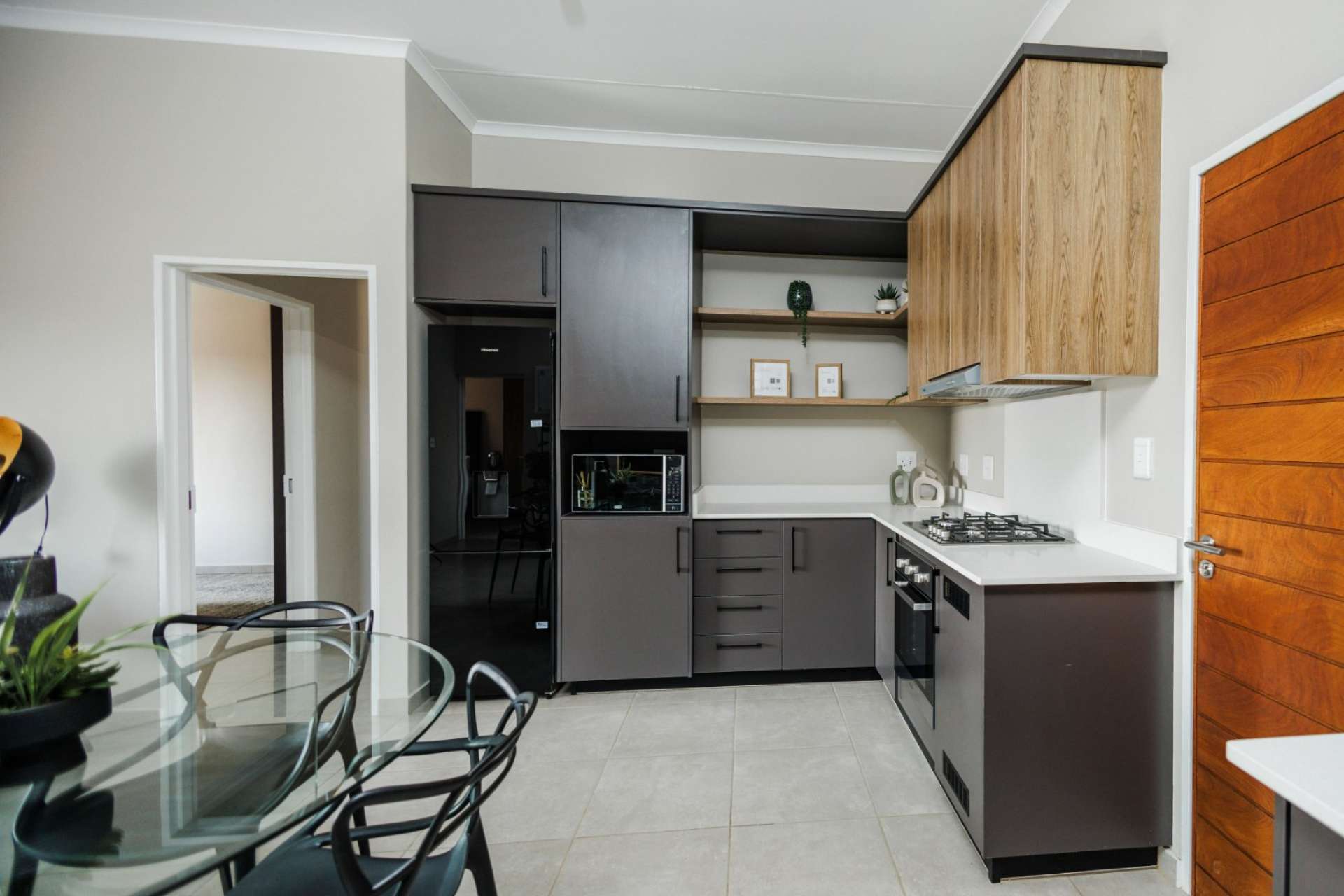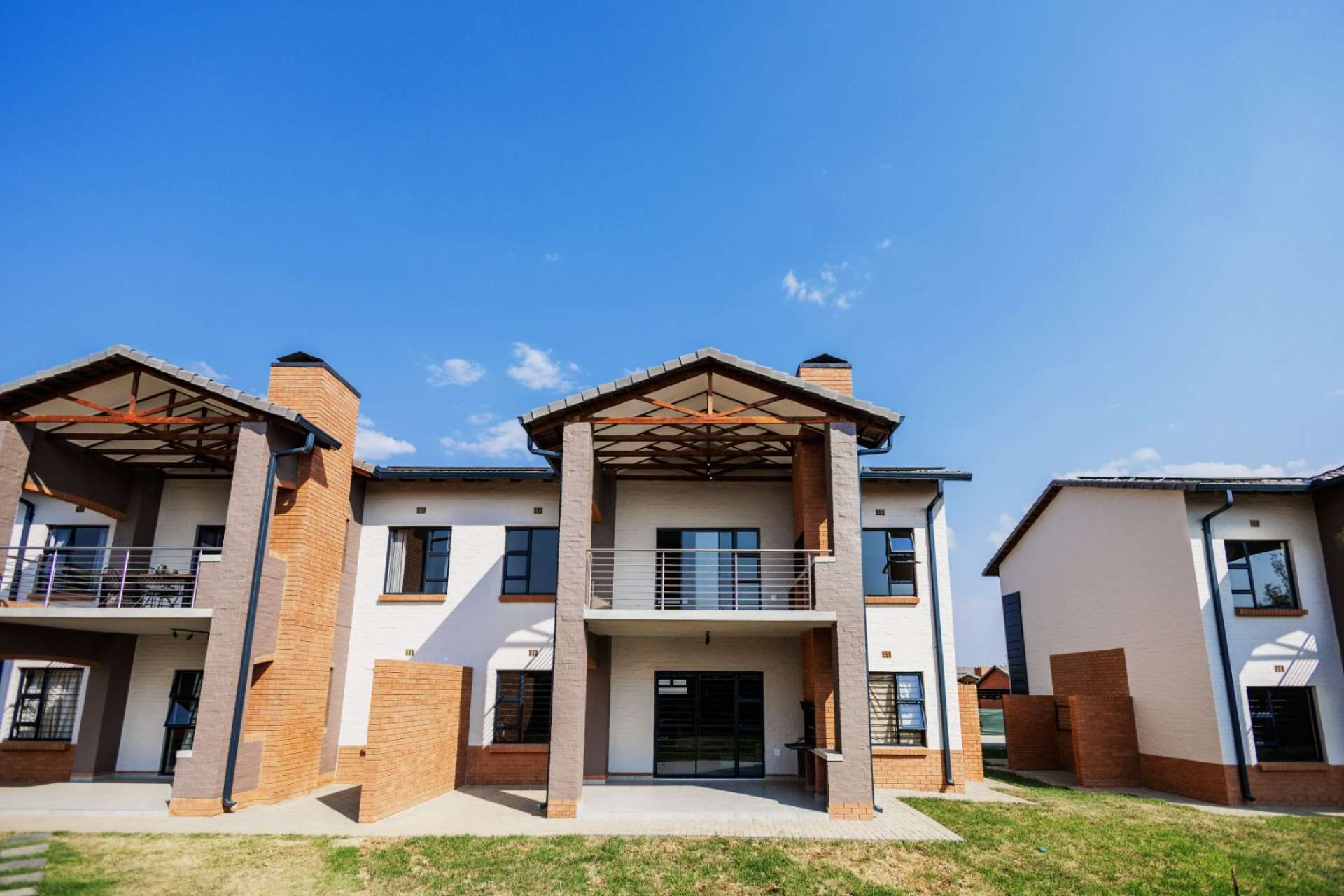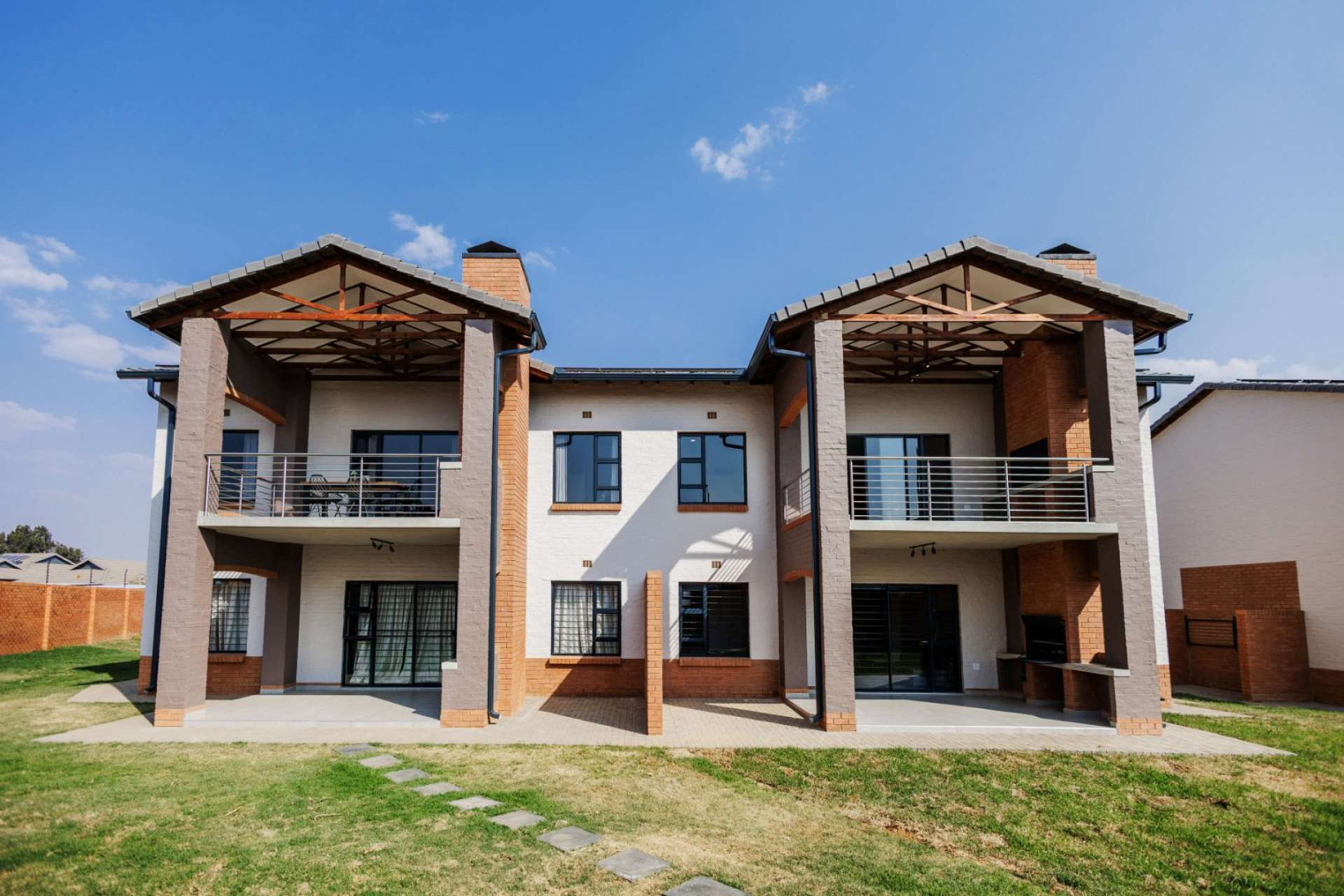 Each home features an open-plan kitchen with granite countertops, gas hob, electric oven, and quality finishes. Living spaces flow seamlessly onto private patios with built-in braais, overlooking landscaped communal gardens.